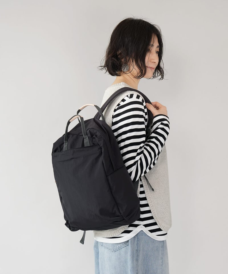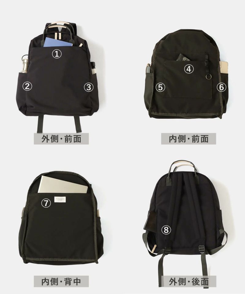 「ポケット数が多い」、「背中のポケットに財布が入れづらい」などの声をもとに、より日常生活で仕分けと収納がしやすいポケット数を考えました。 そして撥水加工ナイロンになったことで、レジャーや1泊2日の小旅行などアウトドアシーンでも安心な万能リュックです。