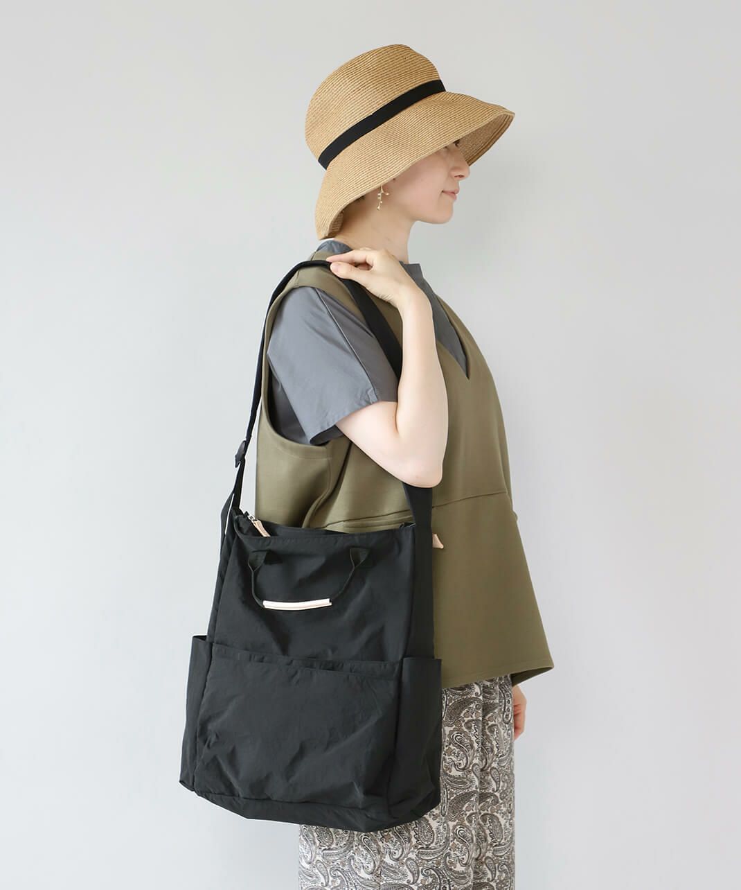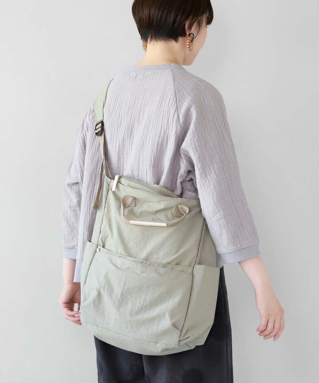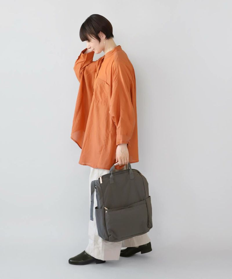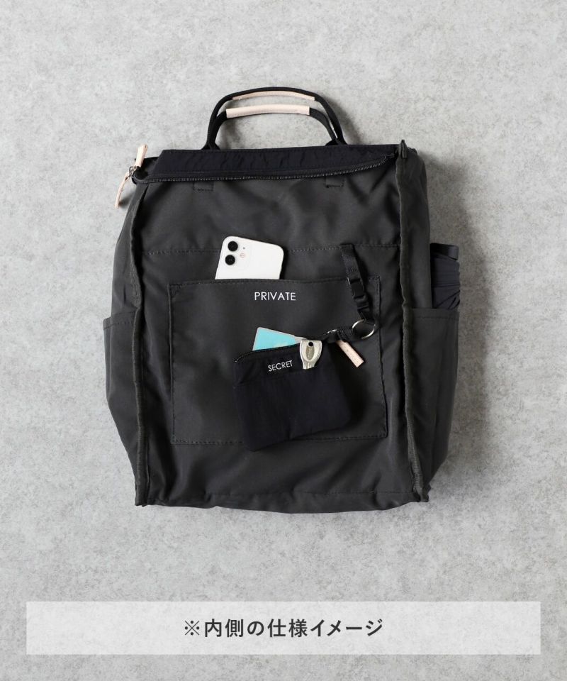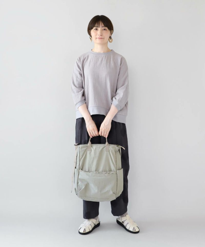持ち手も付いて、トートバッグとしても使える仕様で、コーディネートやシーンに合わせて使い分けできます。