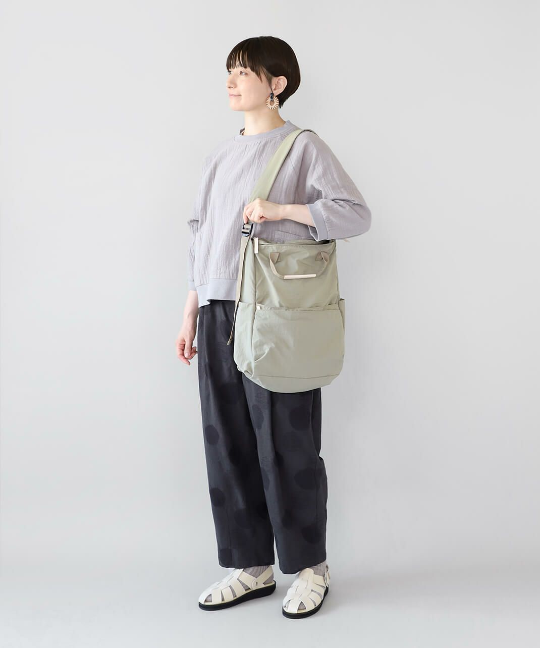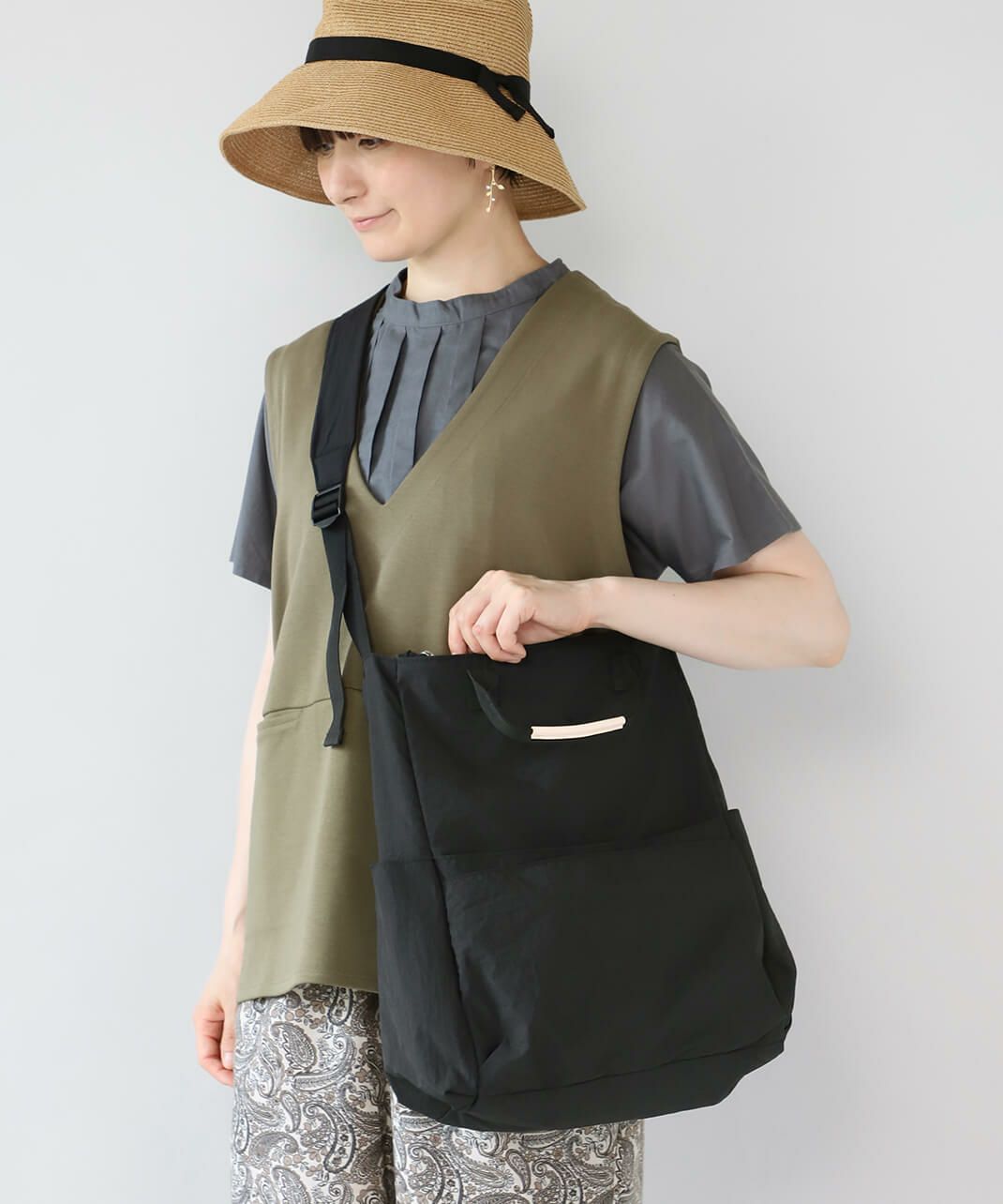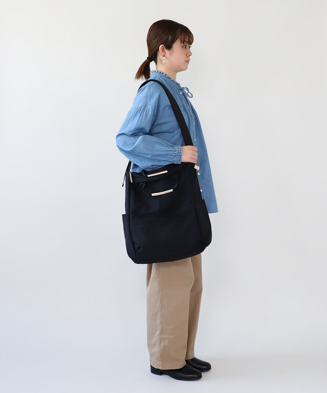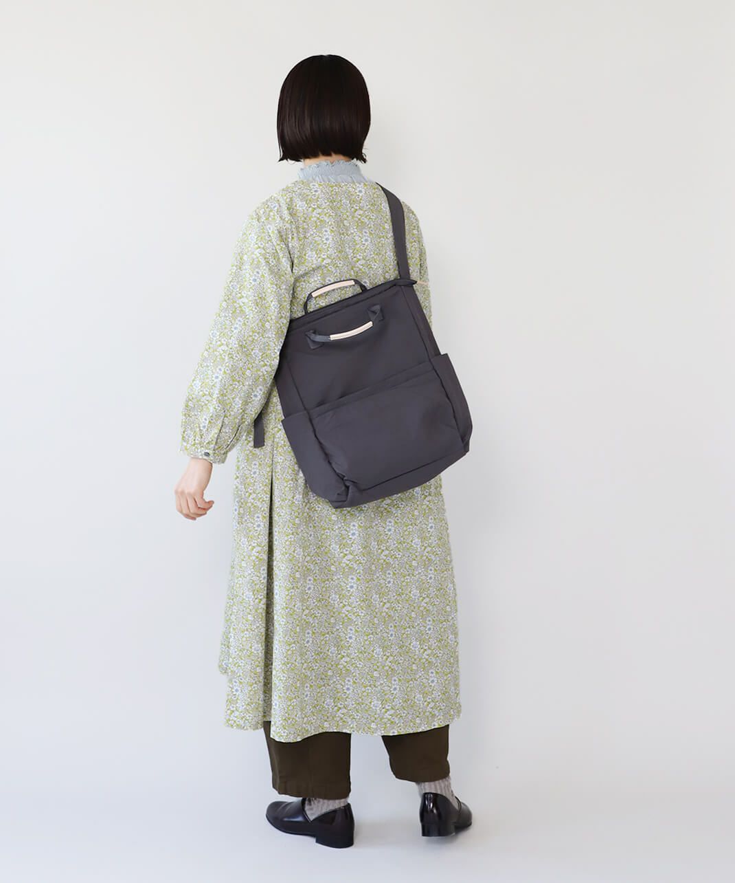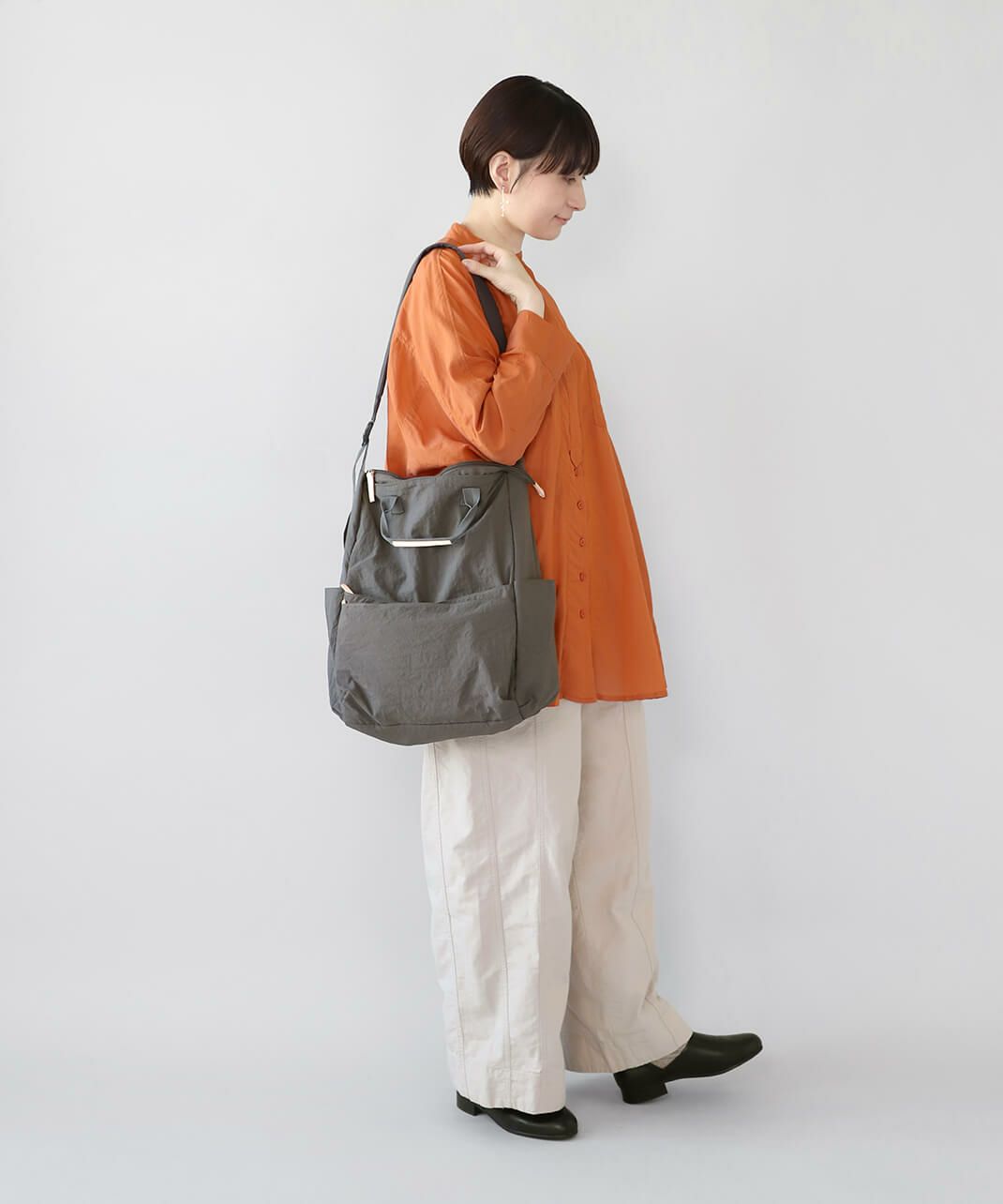 持ち手も付いて、トートバッグとしても使える仕様で、コーディネートやシーンに合わせて使い分けできます。