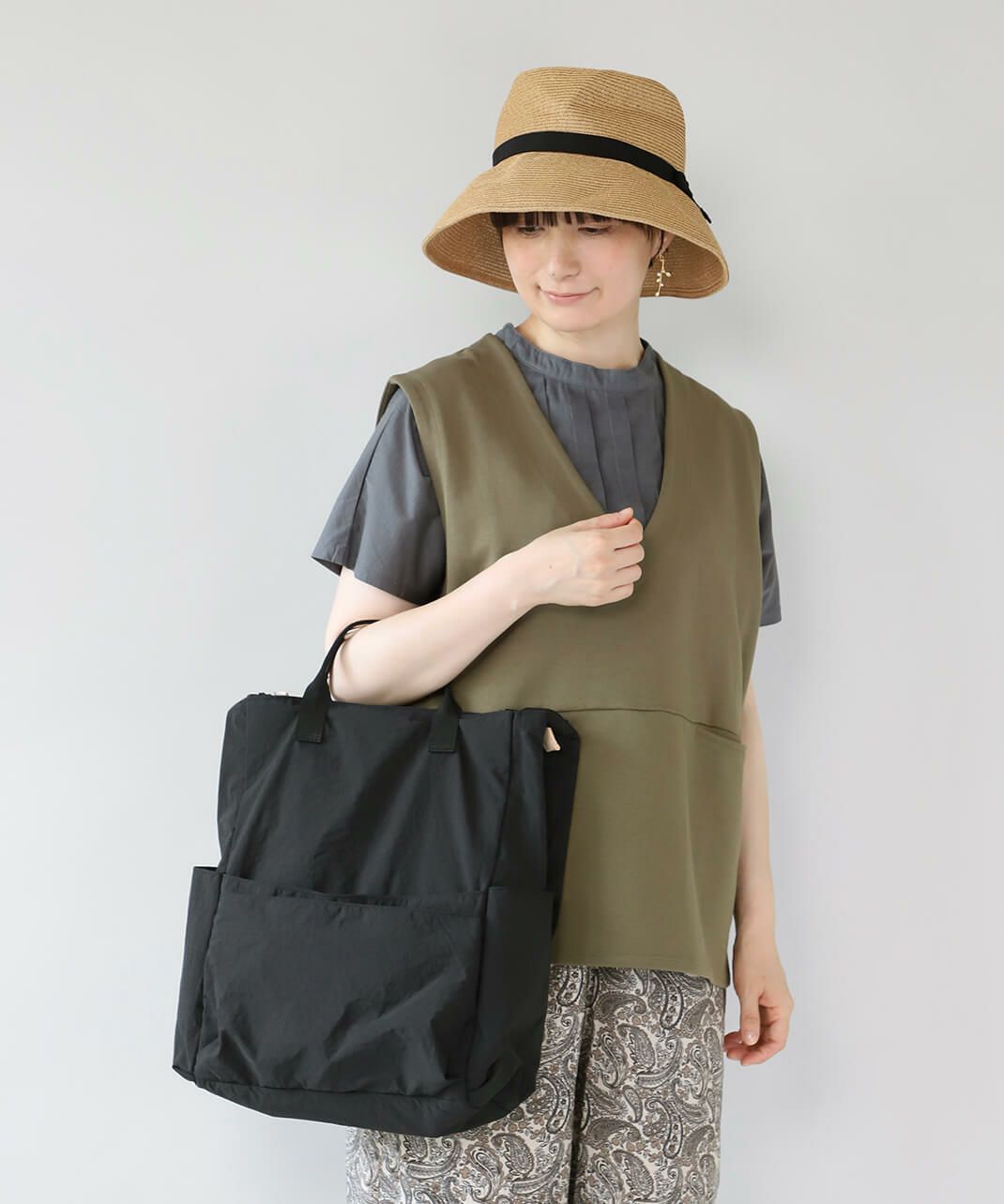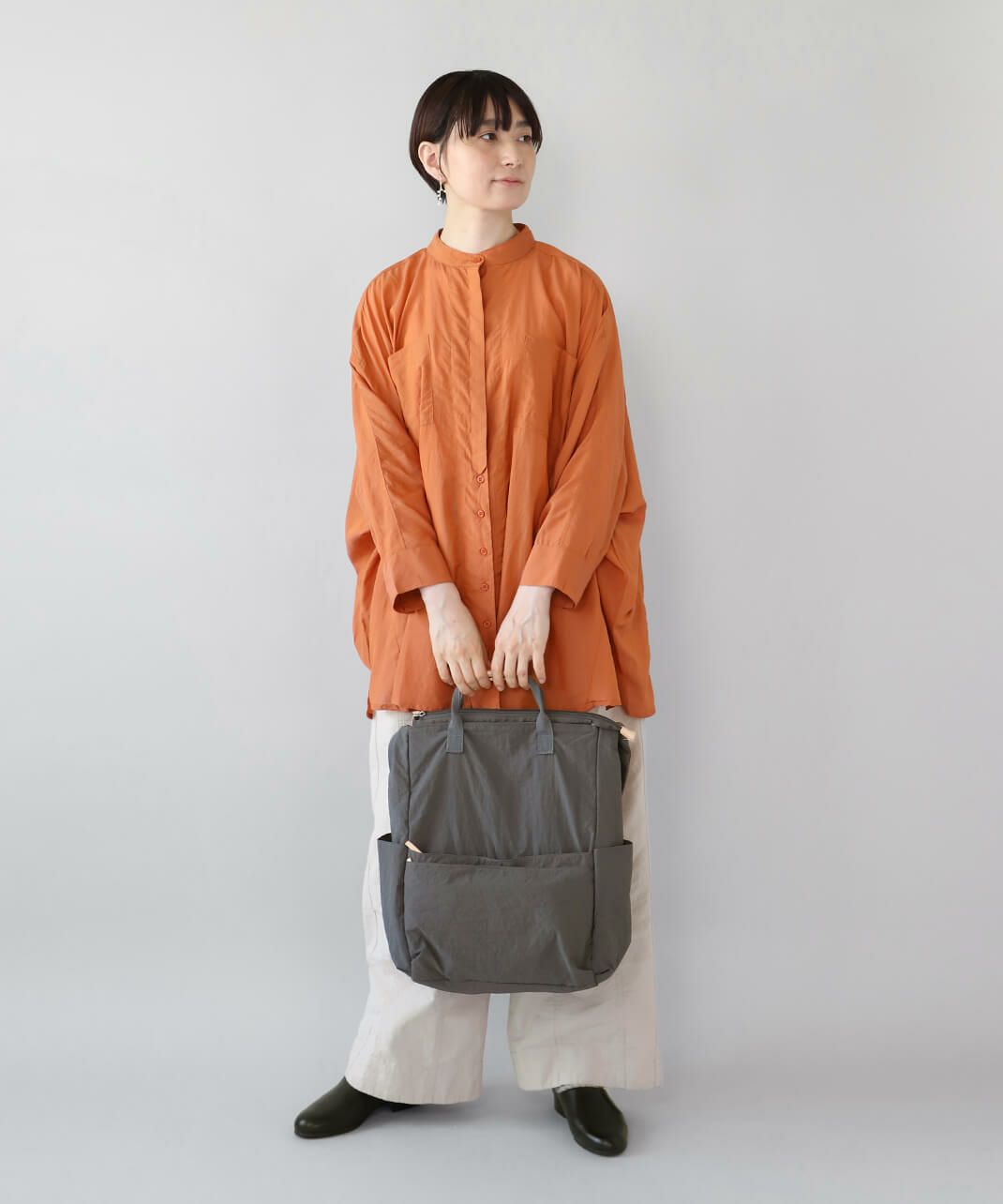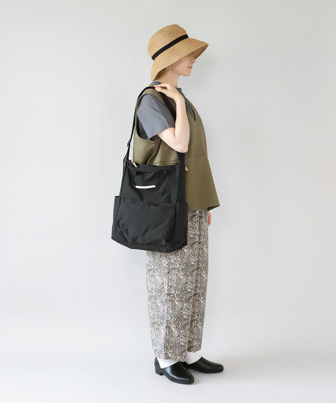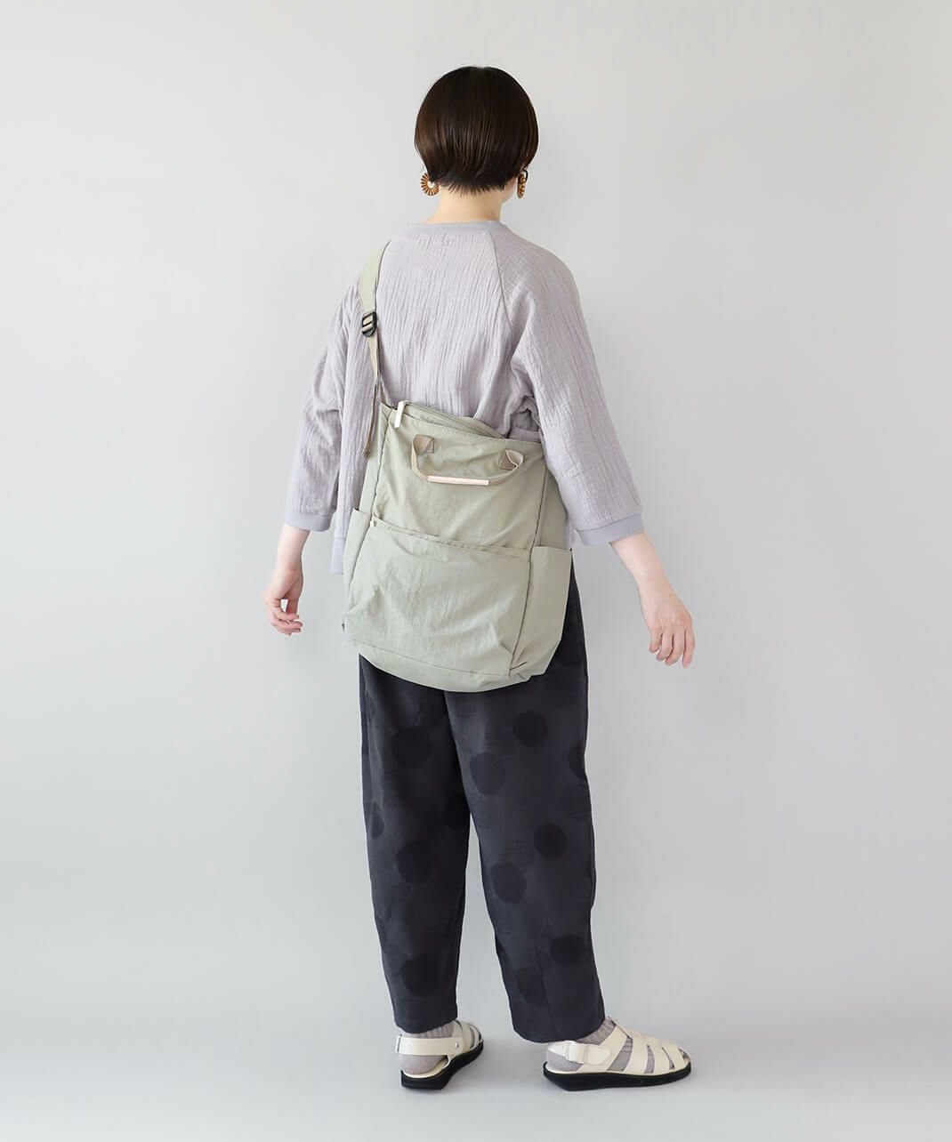 持ち手も付いて、トートバッグとしても使える仕様で、コーディネートやシーンに合わせて使い分けできます。