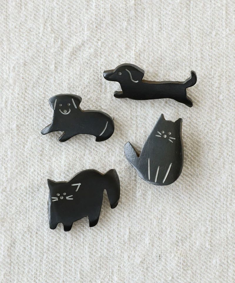 水牛の角を素材としたネパール製のハンドクラフトのブローチ。チャーミングな犬と猫の動きや仕草がゆるく表現されています。帽子やトートバックにつけたり、お部屋に飾ったり好きなように楽しんでください。