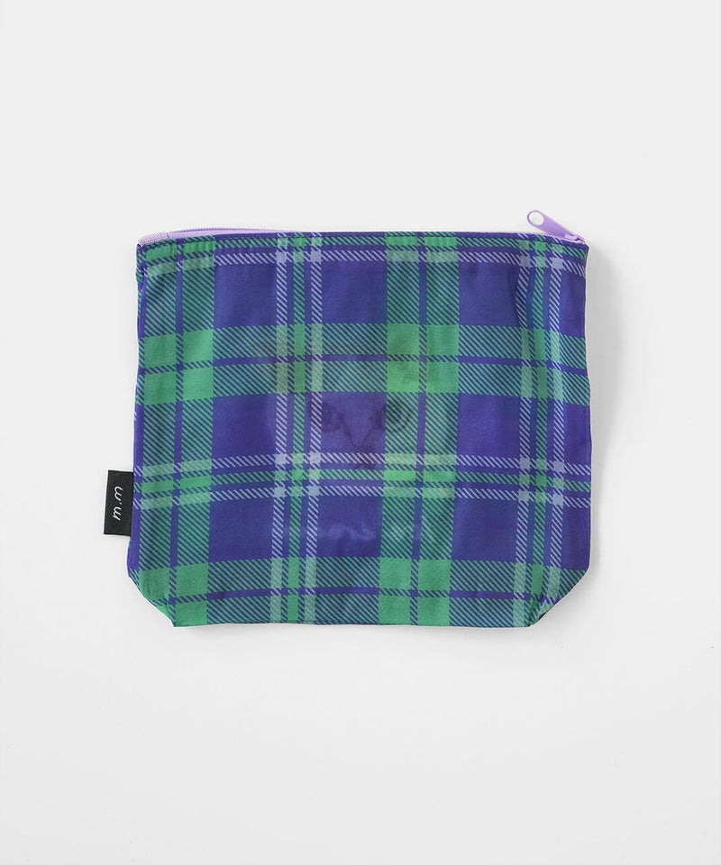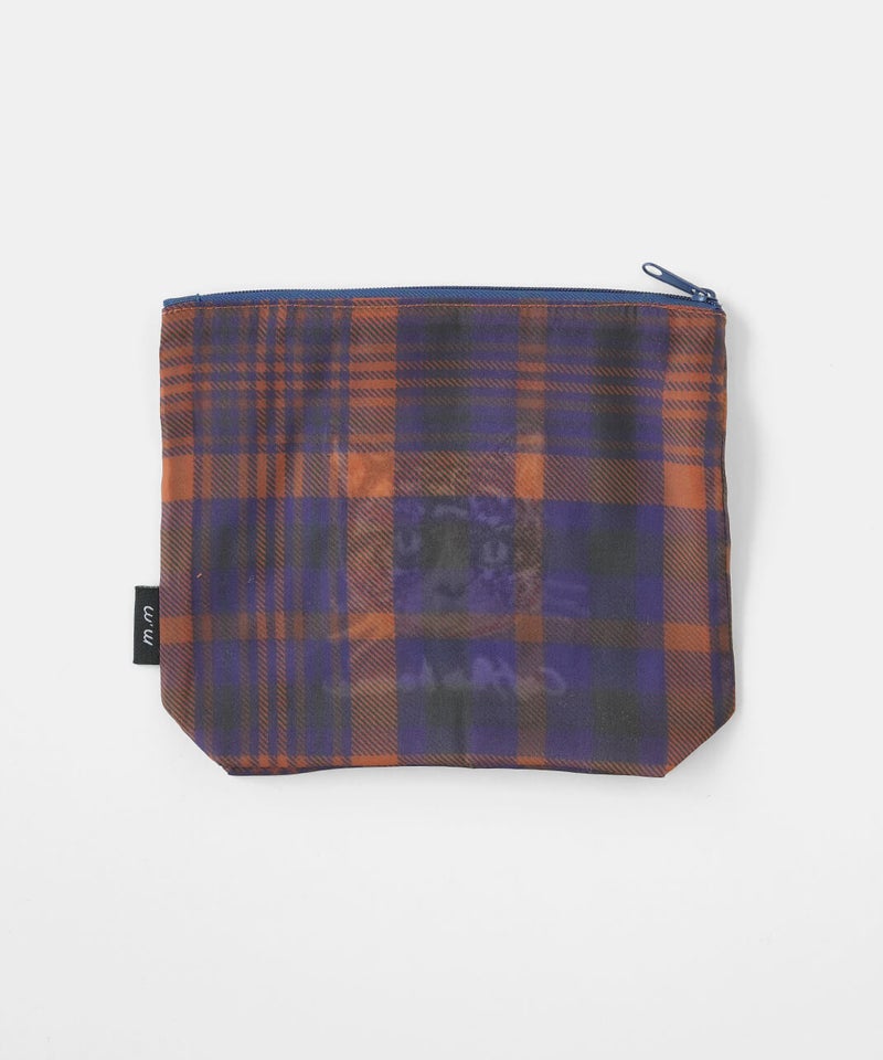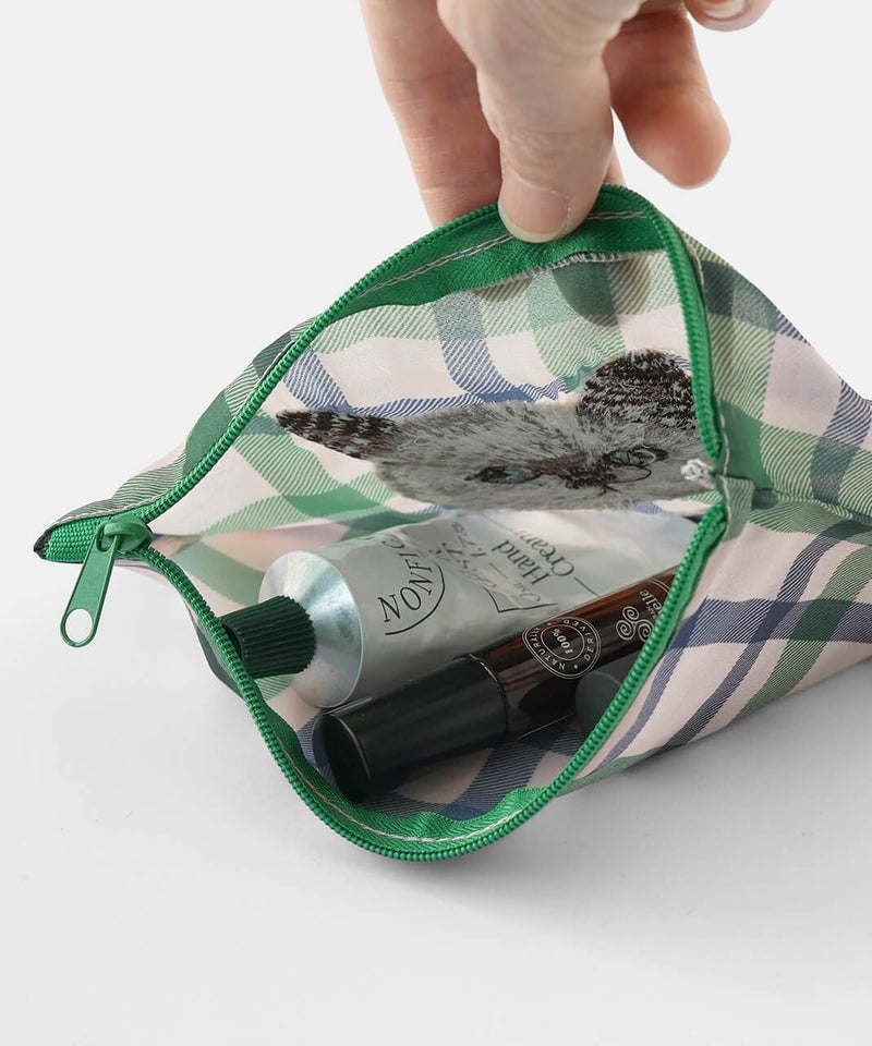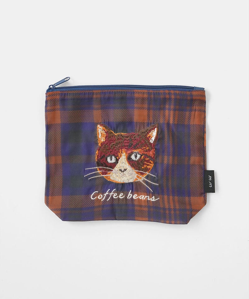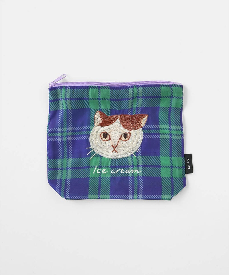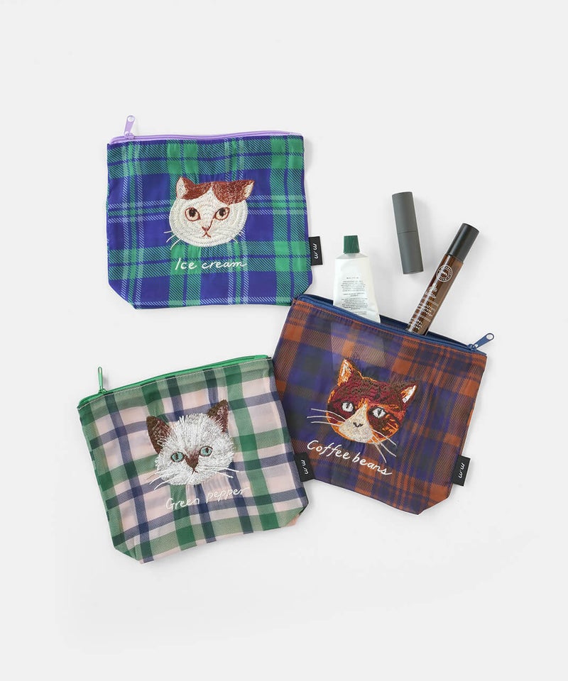 透け感のあるポリエステル素材に、松尾ミユキさんの描くネコの刺繍をあしらった軽やかなポーチです。ネコ刺繍の愛らしさに、チェック柄が心地よいアクセントを添えています。コスメや小物の整理、バッグインバッグとしての日常使いはもちろん、ネコ好きさんへの贈り物としてもおすすめです。