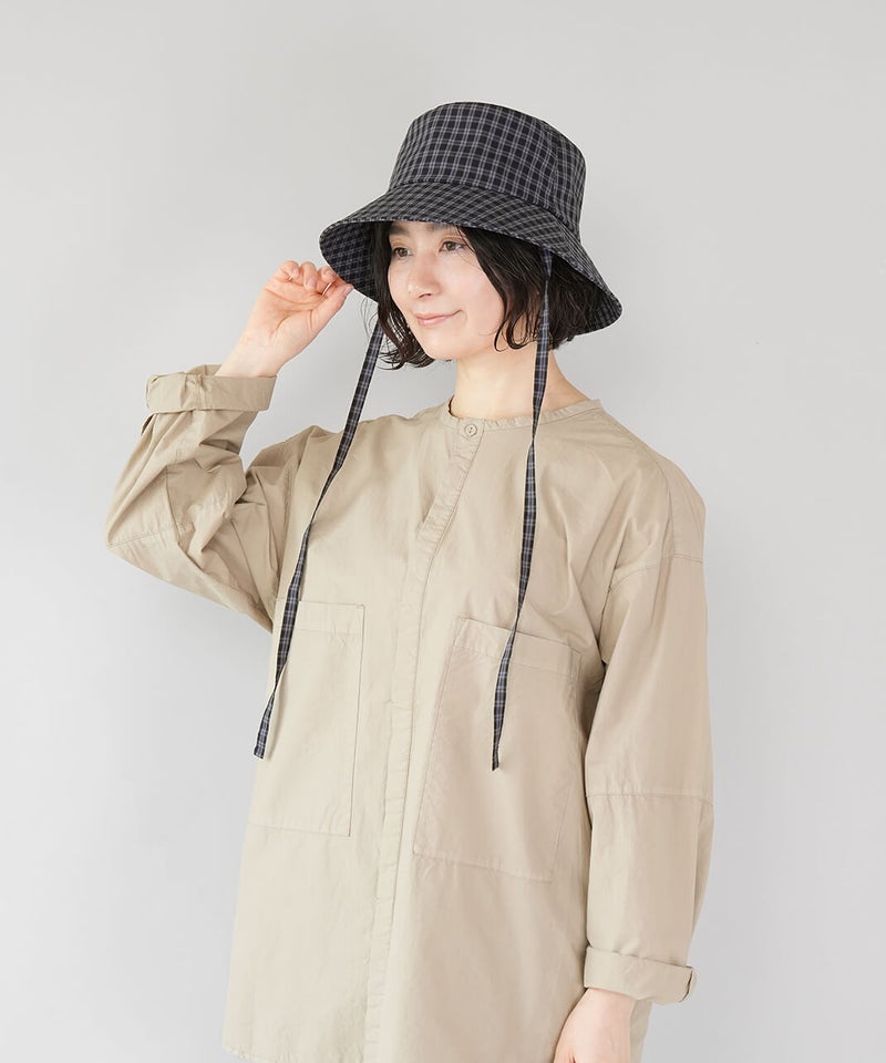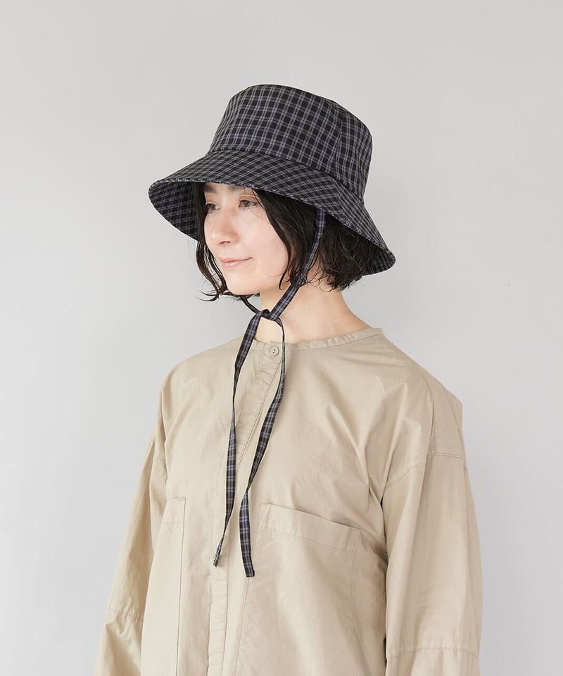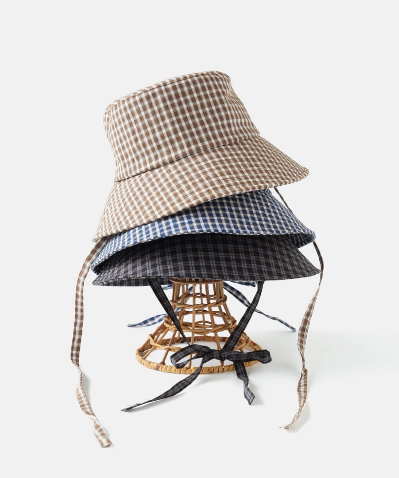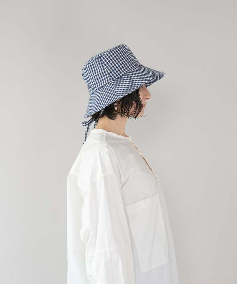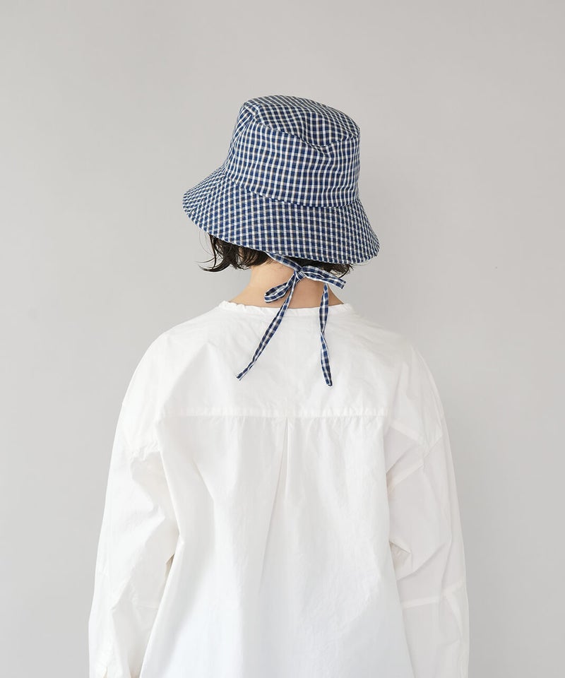 さわやかなギンガムチェックが印象的なハットです。リボンのように結んで使えるテープは取り外し可能で、好みに合わせてお使いできます。日差しから守る深めのツバは、前を少し折り曲げたり、スタイリングを楽しめる春らしい帽子です。