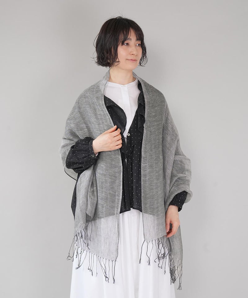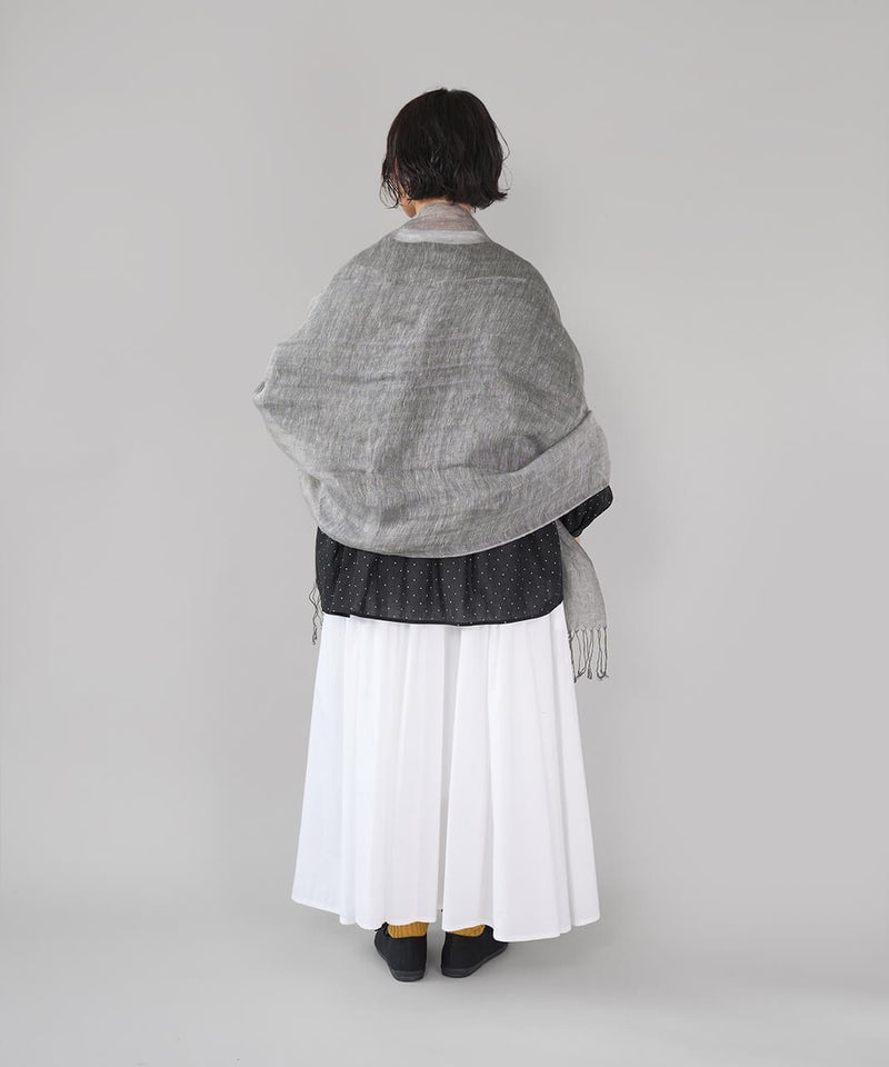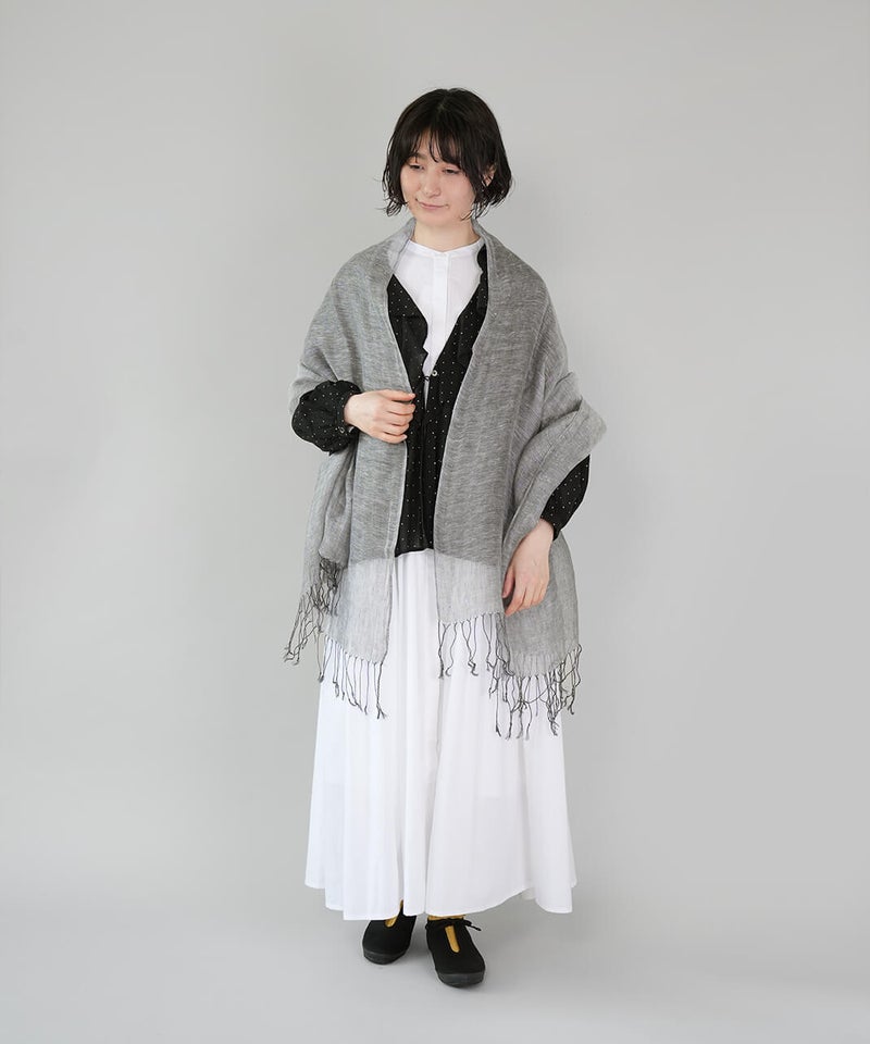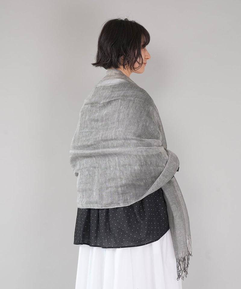 リネン素材のやわらかな風合いのストールです。ナチュラルな杢調の色合いが、シンプルでやさしい印象を添えます。春から夏にかけてコーディネートのポイントとしてはもちろん、日よけや冷房対策にも重宝する1枚です。軽やかな素材感で、畳んでバッグにしのばせておけるのも嬉しいところ。季節の定番ストールです。