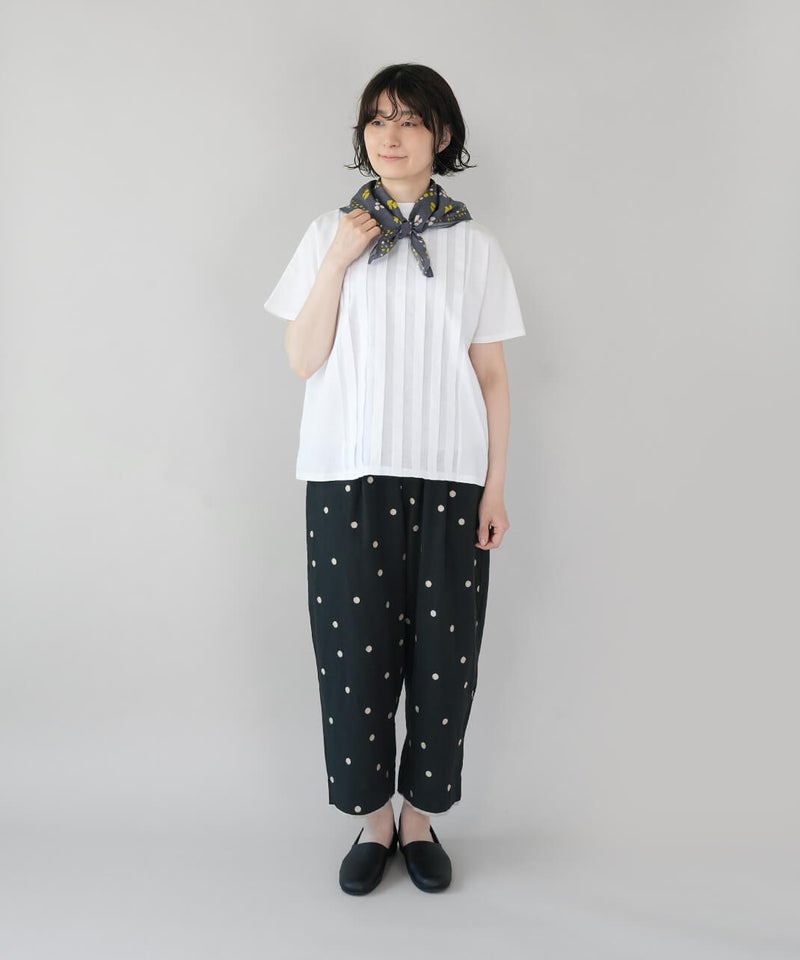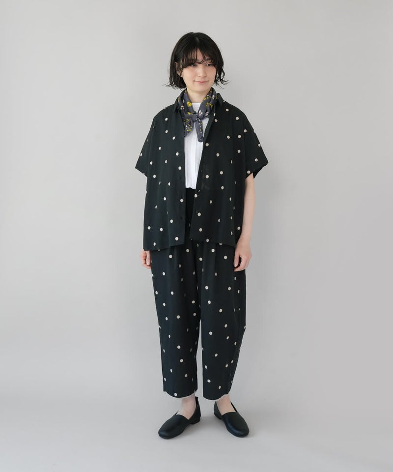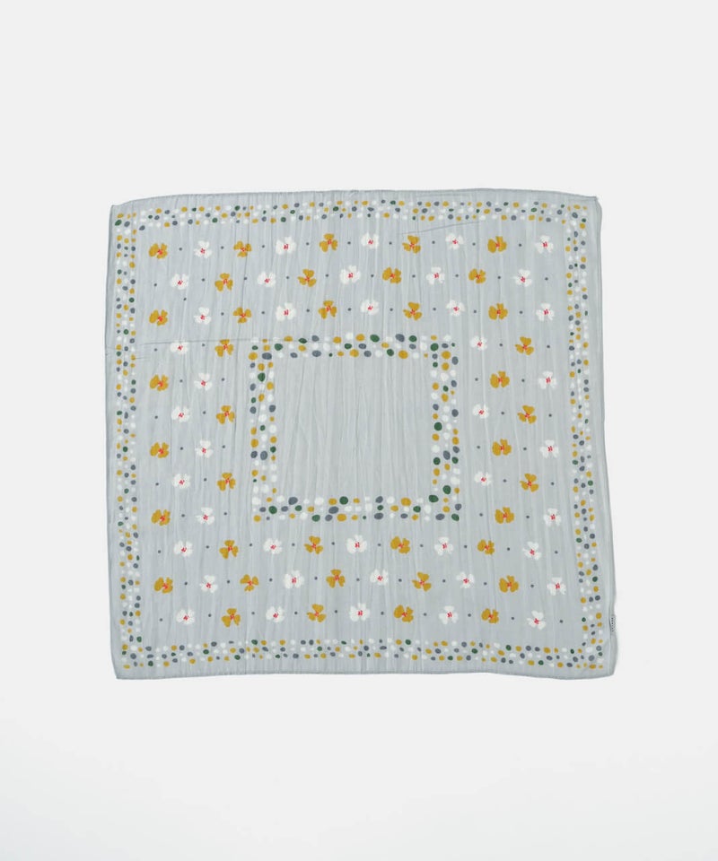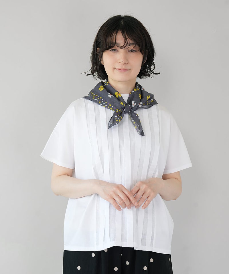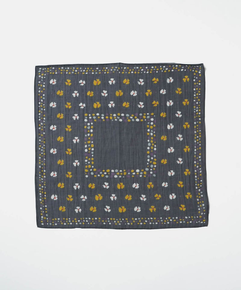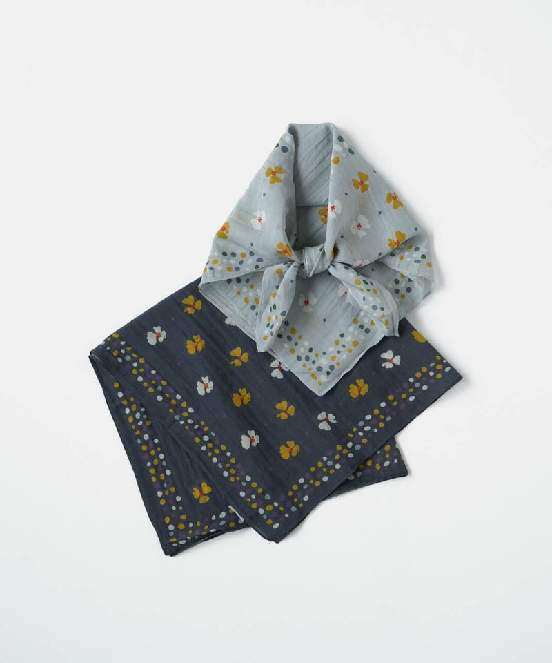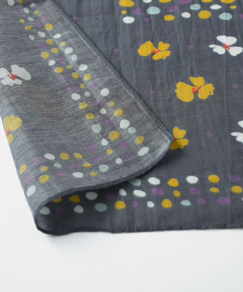 可憐な花モチーフとランダムドットを組み合わせたスカーフ。首元に巻いてアクセントにするのはもちろん、ヘアアレンジに使ったり、バッグに巻いたりと、アレンジも楽しめます。カジュアルにもきれいめにも合わせやすいデザインで、コーディネイトにも活躍してくれるアイテムです。