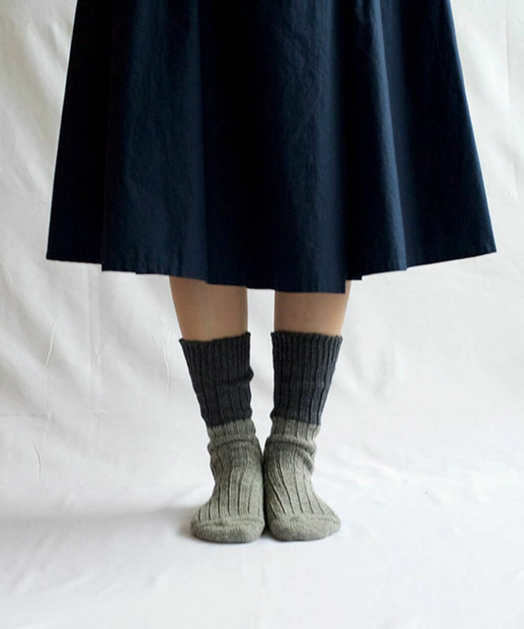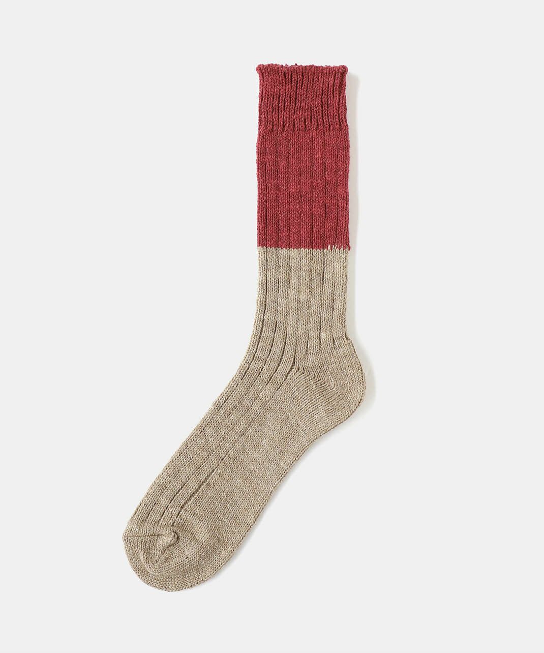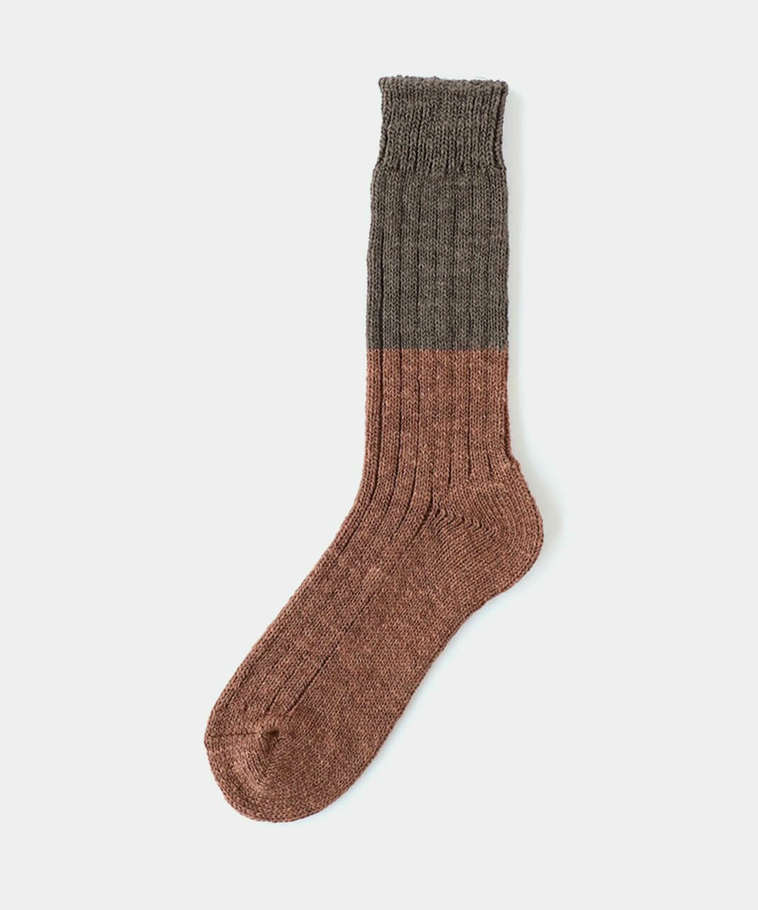 「ウール」と「コットン」をブレンドし、甘く、さらにポツポツとスラブ調に撚ったウールコットンソックスです。履けば履くほど味わいとヴィンテージ感が出てくるのが特徴です。スラブ調がカジュアル感をかもし出し、甘く撚った糸からは柔らかさ、温かさが伝わってきます。