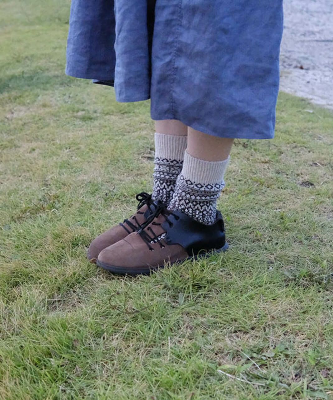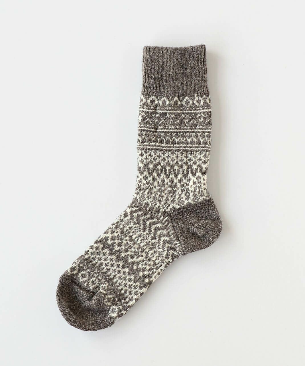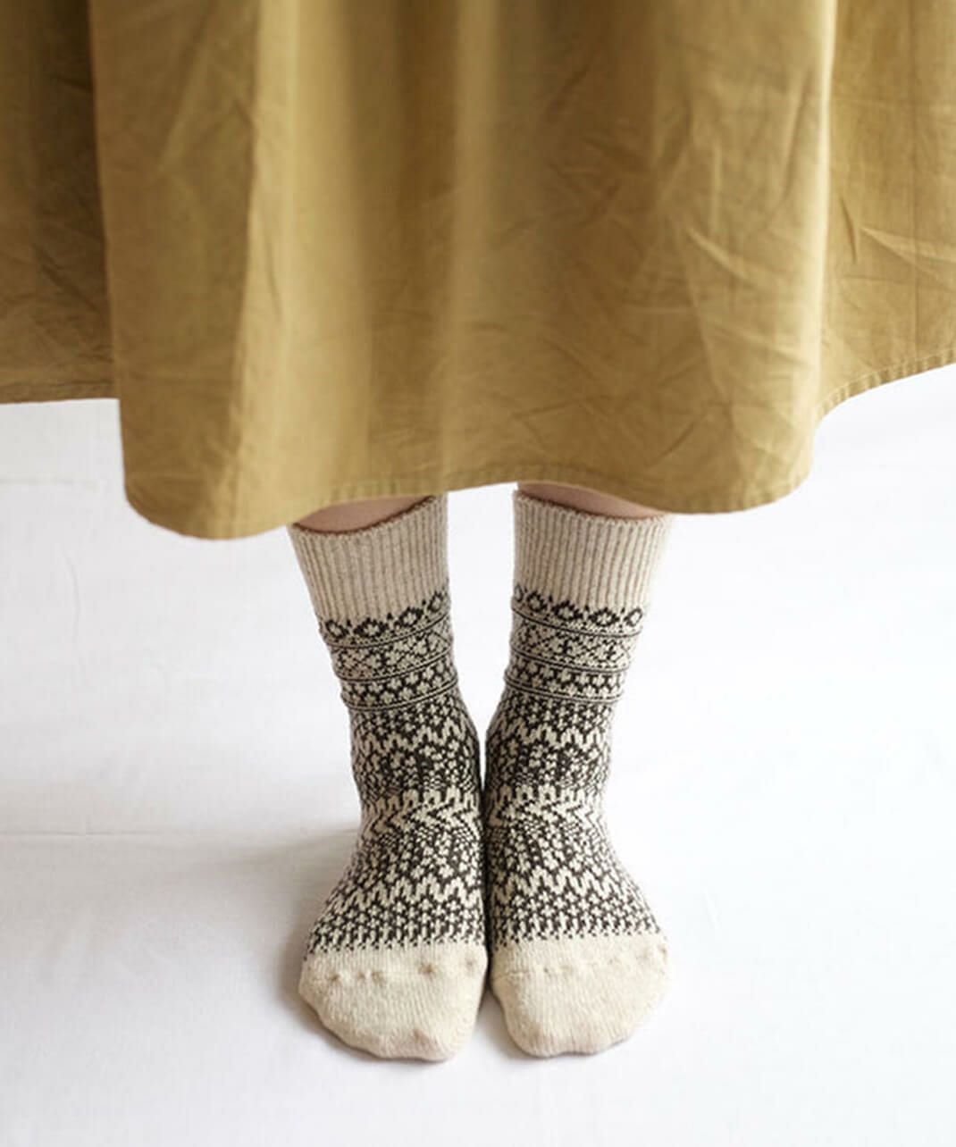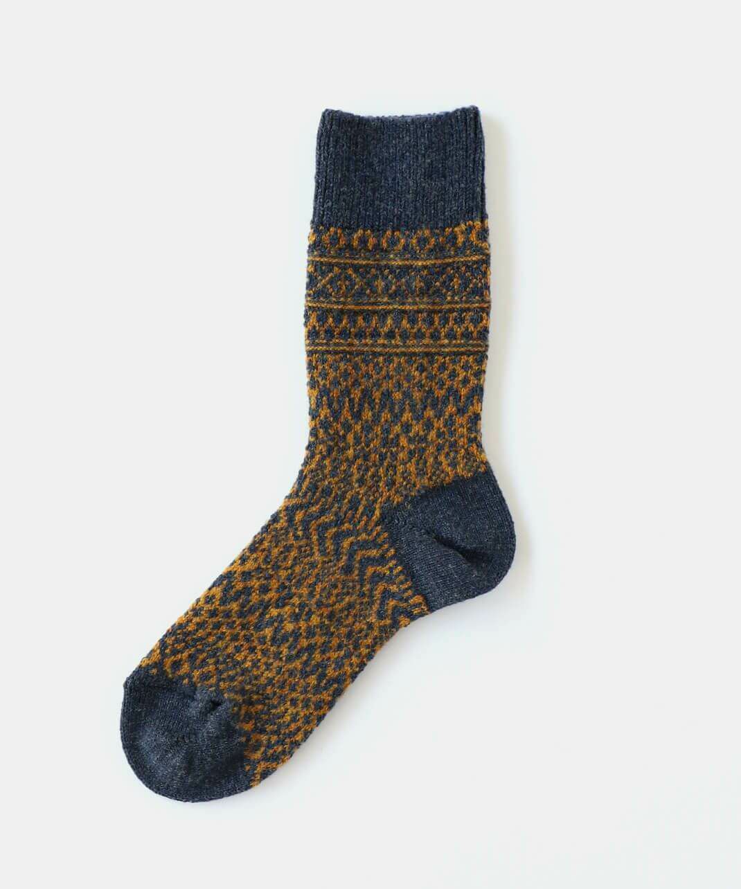 縮みにくく柔らかいのが特徴的な「防縮ウール」を使用した「ウールジャガードソックス」です。 ふくらみのある「防縮ウール」をしっかりと編み上げているので、どっしりとした履き心地で、とても温く仕上がっています。 洗濯を重ねても、縮みにくい設計なので、寒い冬場に、繰り返し履いていただけます。