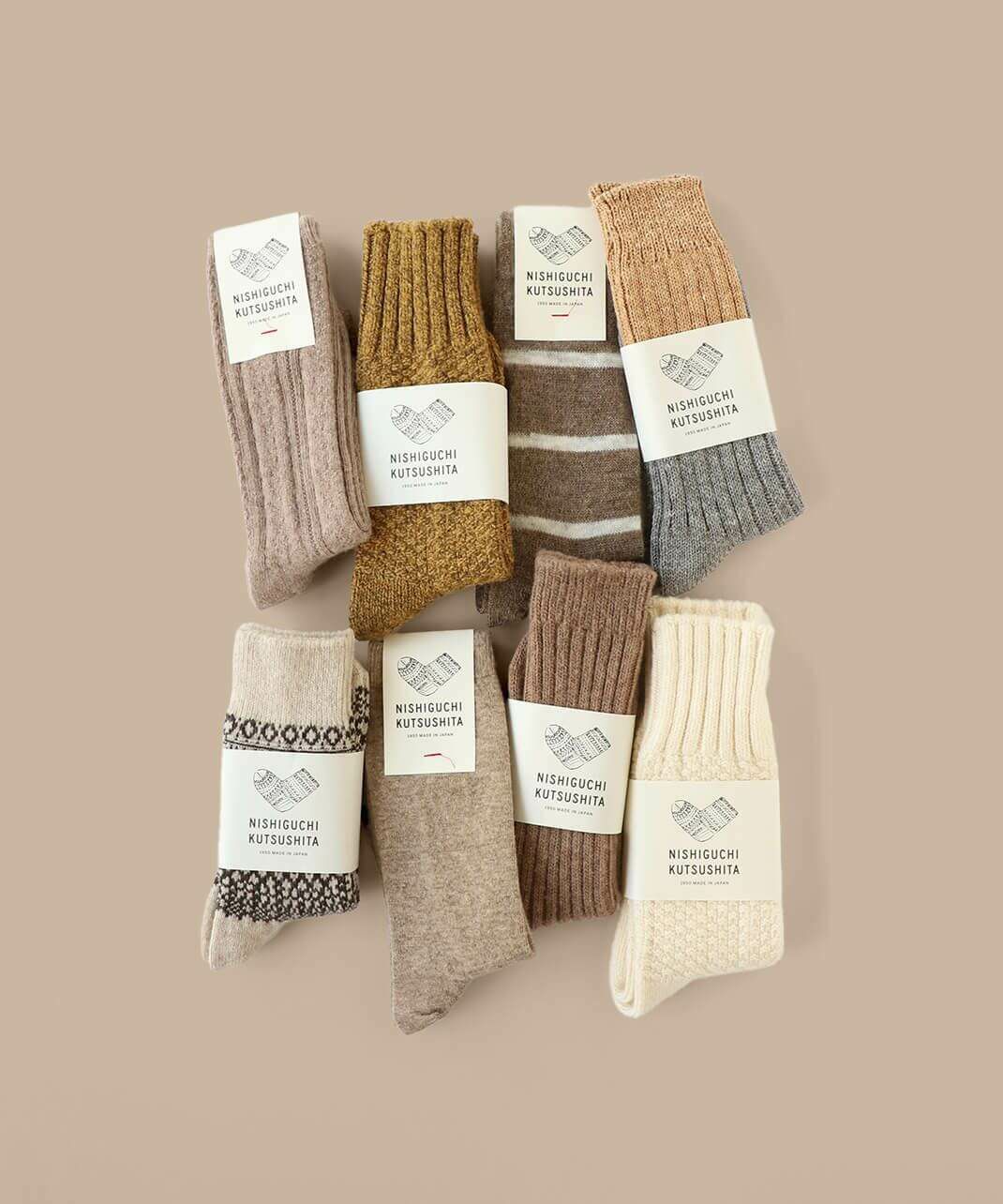 NISHIGUCHI KUTSUSHITAは1950年から靴下づくりをつづける、日本のファクトリー生まれの靴下ブランドです。履く人のことを真面目に考えてつくること。「はくひとおもい」という言葉に込めた想いが、私たち靴下づくりの原点です。良質な天然素材、新旧マシンを生かした編み方、時代にとらわれないデザイン、そして価格。一つ一つのこだわりは、すべて履く人のためを追求した答えです。トレンドだけを追い求めるのではなく、長く愛用できる定番をつくり続けます。