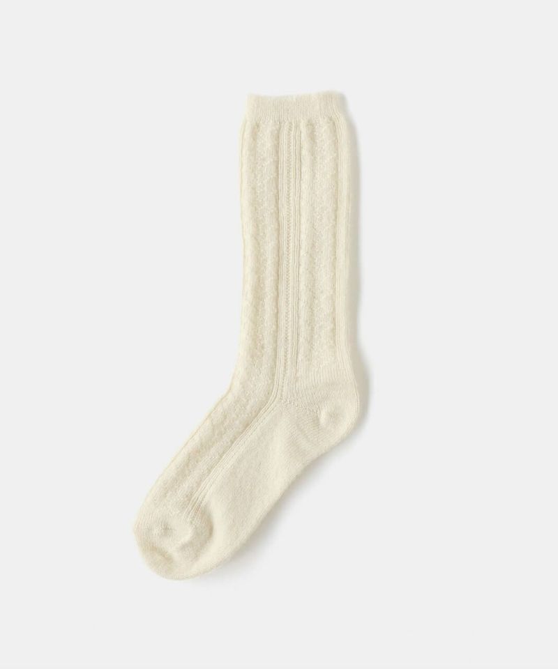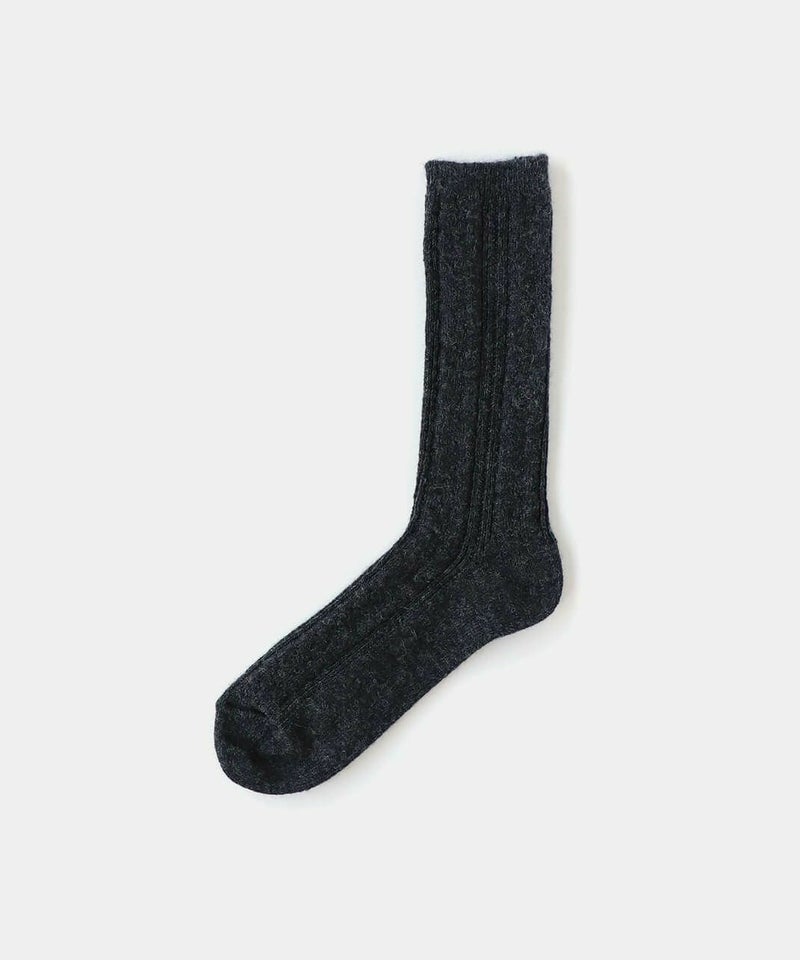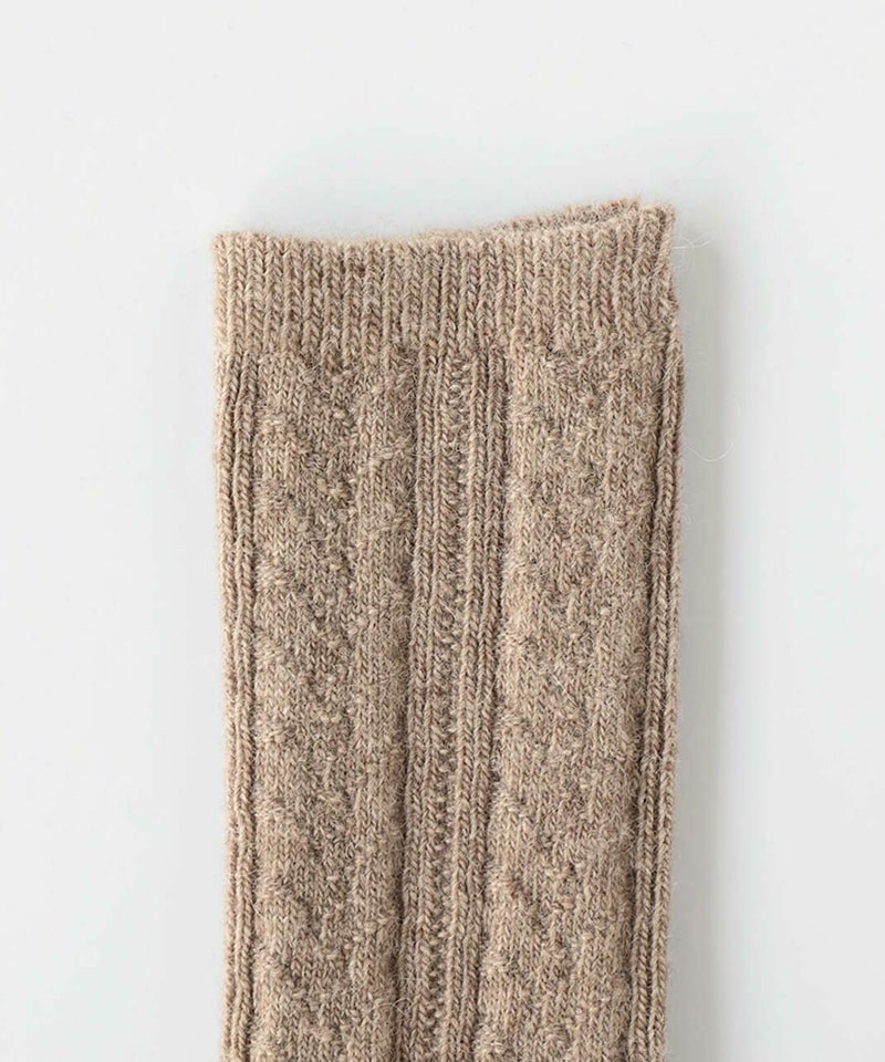 柔らかい「アルパカ」と、ふくらみのある「ウール」をブレンドした糸を使用しています。 「カシミヤウールソックス」と同じく、女性の秋冬に薄手で温かい靴下としてぴったり。 薄い生地ですが、アルパカとウールの温かさ、しっとりとした風合いを楽しんでいただけます。 スニーカーや革靴、ショートブーツに合うように、スタイリッシュな「ケーブルデザイン」にもこだわっています。