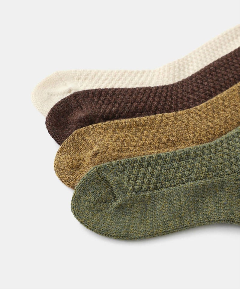 ウールの洋服を糸に戻したリサイクルウールと落ち綿のヴァージンコットンのリサイクルコットンをブレンドした環境にやさしい厚手のウールソックス。ウールらしいボリュームに加え、通常のウールより丈夫なので、<アウトドア、キャンプ、トレッキングなどのブーツにぴったり。