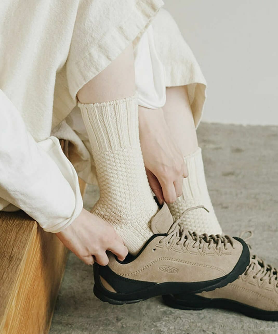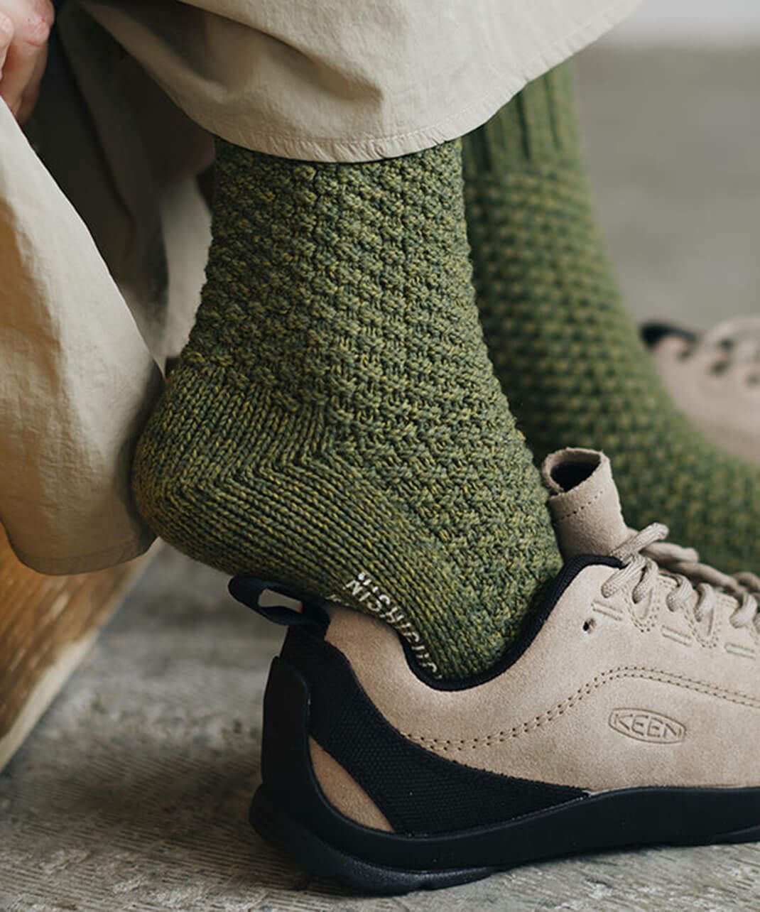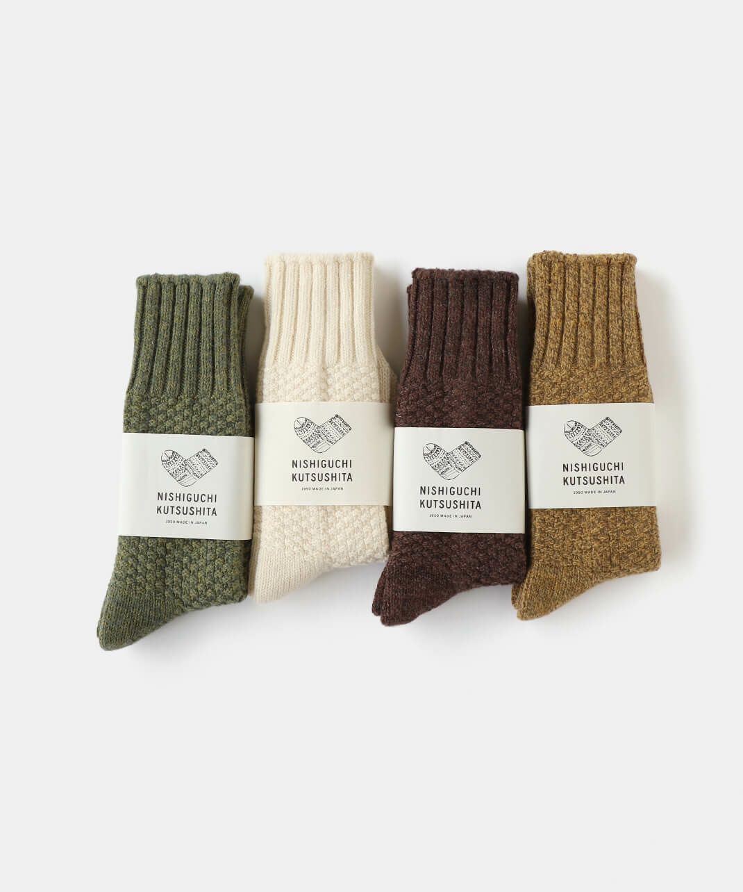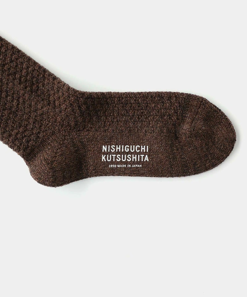 NISHIGUCHI KUTSUSHITAは1950年から靴下づくりをつづける、日本のファクトリー生まれの靴下ブランドです。履く人のことを真面目に考えてつくること。「はくひとおもい」という言葉に込めた想いが、私たち靴下づくりの原点です。良質な天然素材、新旧マシンを生かした編み方、時代にとらわれないデザイン、そして価格。一つ一つのこだわりは、すべて履く人のためを追求した答えです。トレンドだけを追い求めるのではなく、長く愛用できる定番をつくり続けます。