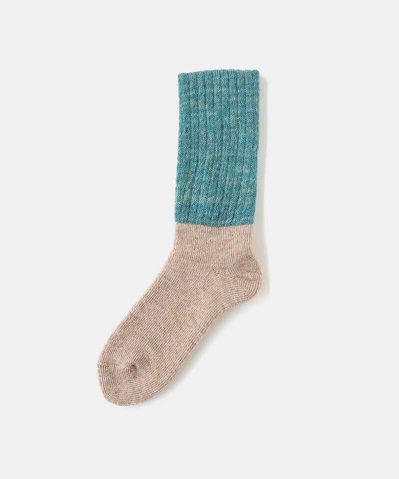 NISHIGUCHI KUTSUSHITAが届ける雪国対応の靴下。 生後1年以内の柔らかなキッドモヘアとウールを混紡した起毛糸を使用しております。 モヘヤの特徴は柔らかで保温性が高く、ウールとブレンドすることで薄手でも温かな靴下に仕上がりました。 足の部分をパイル、足首は二重に編まれたレッグウォーマーになっております。