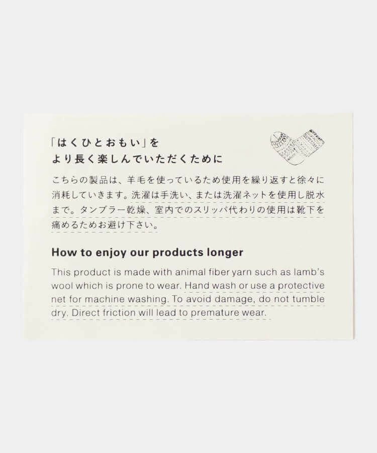 NISHIGUCHI KUTSUSHITAは1950年から靴下づくりをつづける、日本のファクトリー生まれの靴下ブランドです。履く人のことを真面目に考えてつくること。「はくひとおもい」という言葉に込めた想いが、私たち靴下づくりの原点です。良質な天然素材、新旧マシンを生かした編み方、時代にとらわれないデザイン、そして価格。一つ一つのこだわりは、すべて履く人のためを追求した答えです。トレンドだけを追い求めるのではなく、長く愛用できる定番をつくり続けます。