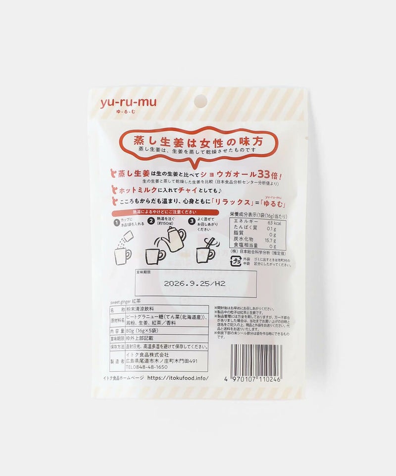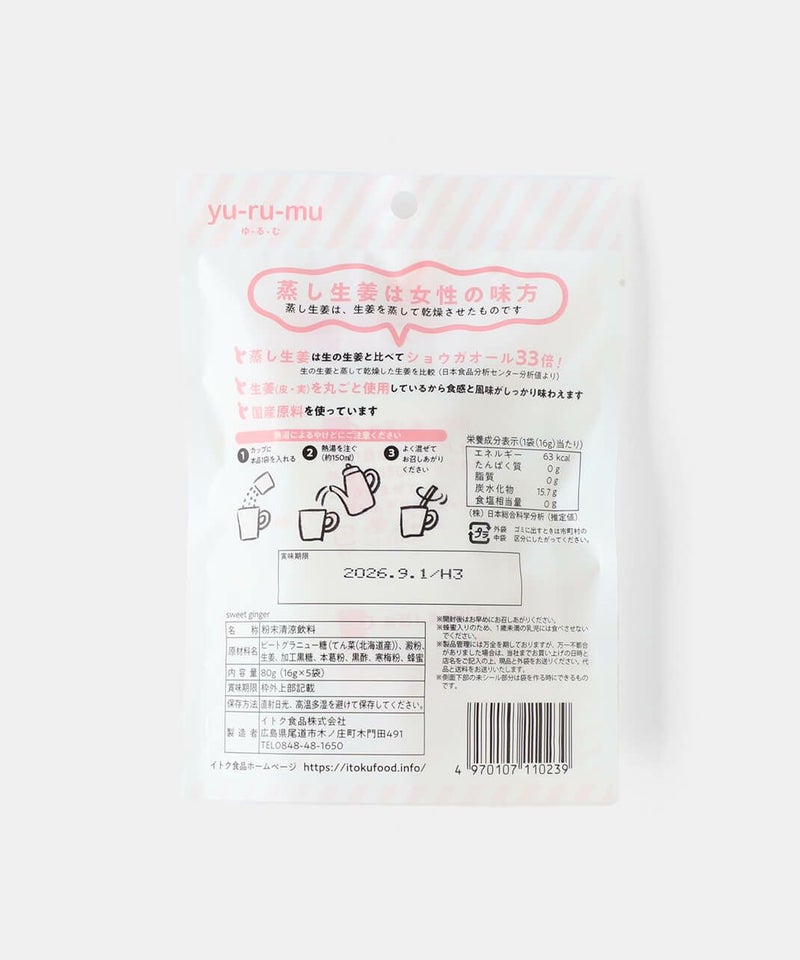 食品添加物不使用。国産原料を使用することにこだわった生姜湯です。ITOKU FOODSこだわりの蒸し生姜を使用することで、体を内側から温めるショウガオール成分がたっぷりと含まれています。生姜のピリッとした辛さと優しい黒糖の甘さが広がります。個包装の粉末タイプの為、手軽に楽しめるのも魅力です。