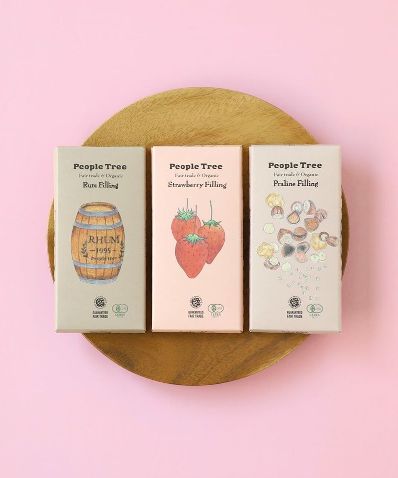 有機ヘーゼルナッツ、有機ラム酒、 有機いちごの素材そのものを贅沢に練り込んだやわらかなフィリングを、黒糖のチョコでコーティングしています。