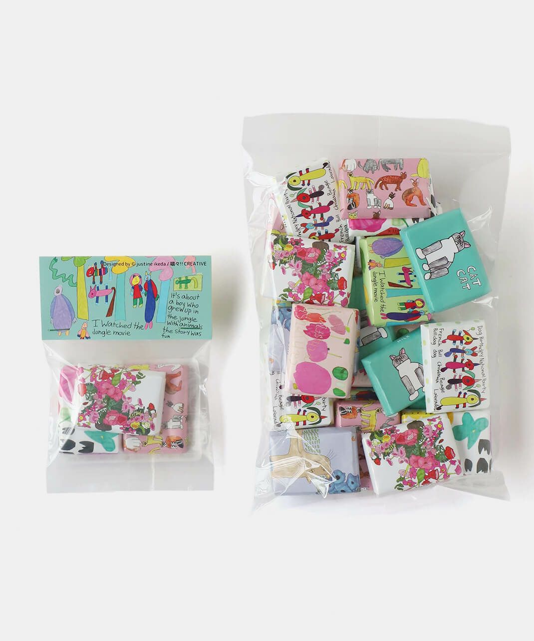 様々な障がいを持つ人が好きなこと・得意なことで活躍し、 嬉々として創造的に暮らせる社会を目指して活動する福祉施設/アトリエ 「嬉々!! CREATIVE(キキ・クリエイティブ)」の個性的なアーティストたちが手がける、ポップでキュートな限定アートパッケージ『Artisanシリーズ』。 SAKURAさん、池田 ジャスティーヌさん、筧 純爾さん、山本 頼子さん、4人のアーティストの作品が一口サイズのミルクチョコレートのパッケージになりました。 スモールギフトは、チョコレートが3個入ったミニサイズで、お配りギフトにおすすめです。 かわいいイラストのヘッダータグは、池田 ジャスティーヌさんの「I Watched the…」、筧 純爾さんの「ディレクターキャット」の2種類。 ※チョコレートのパッケージデザイン及びヘッダータグのデザインは、アソートでのお届けとなり、お選びいただくことはできません。ご了承ください。