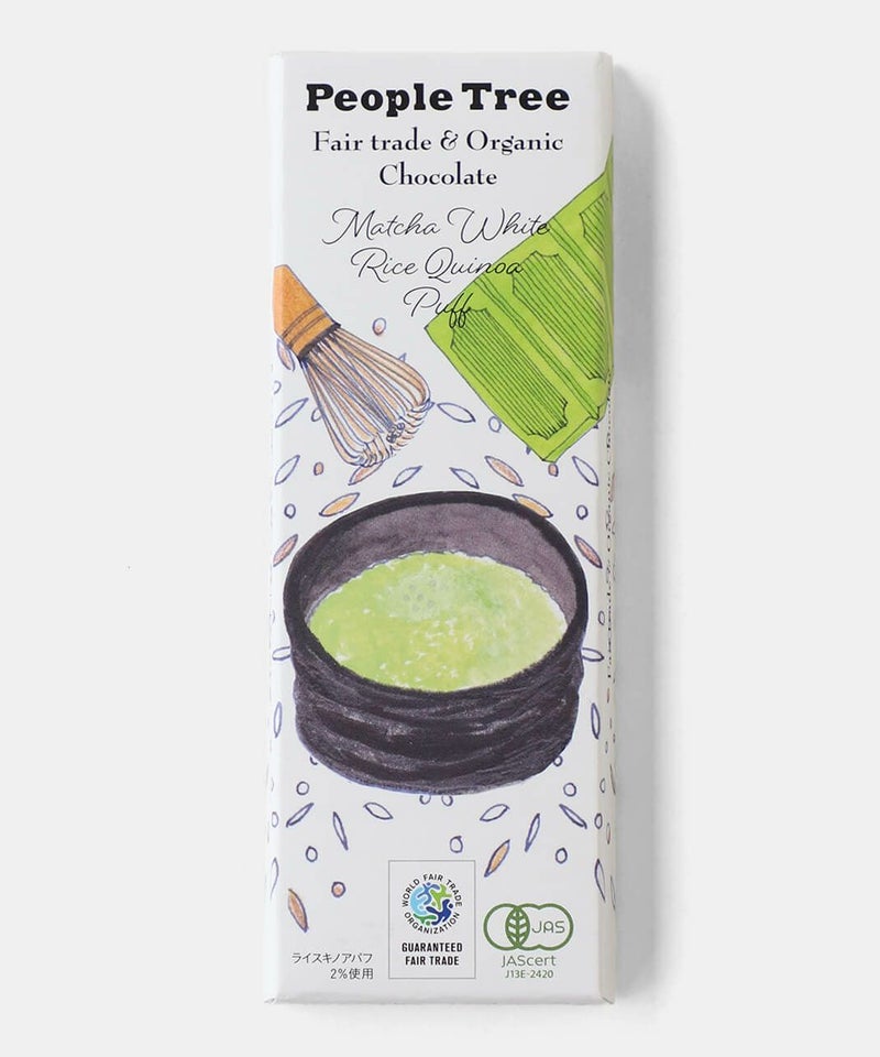 希少な九州産本格有機抹茶を練りこんだホワイトチョコに、お米とキノアパフを入れた香ばしく軽やかな食感。