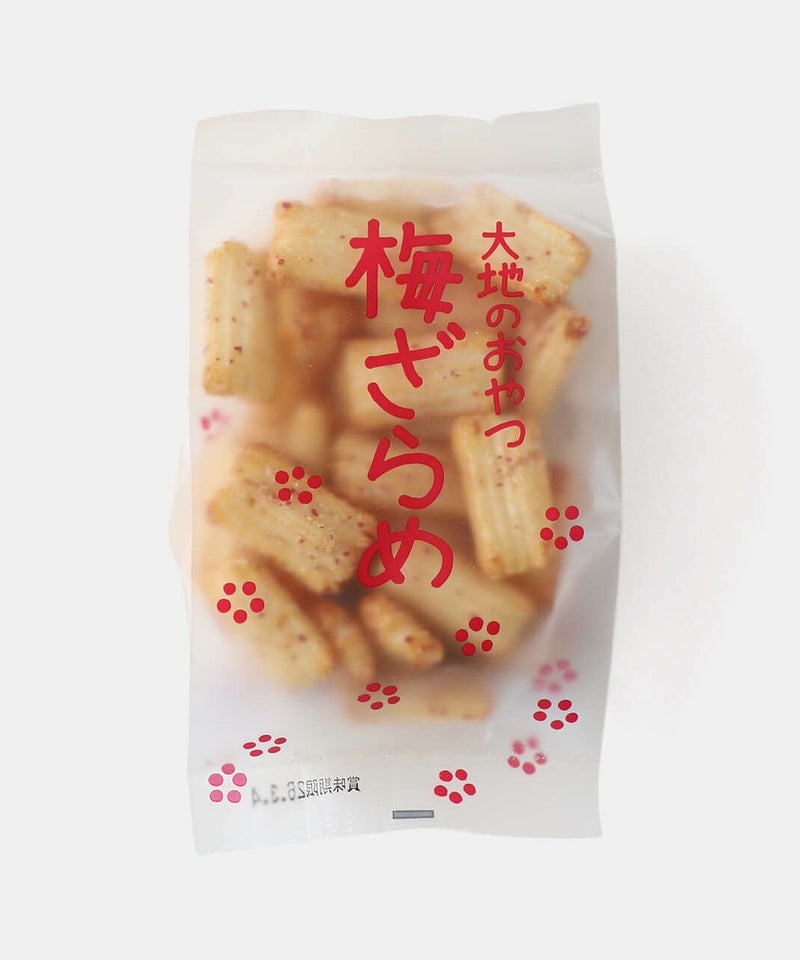 紀州南高梅の梅干としそ梅酢だけで作られた梅肉と、大地のおやつには欠かせない鹿児島県産の粗糖をまぶしたのが、鮮やかな桃色のパッケージの『梅ざらめ』。 もち米の自然な旨みとともに、梅のさわやかな香りとほどよい酸味が広がり、粗糖のざくざくした食感がアクセント。 ほんのり酸っぱくてざくざく甘くて。次から次へと手が伸びるおいしさです。