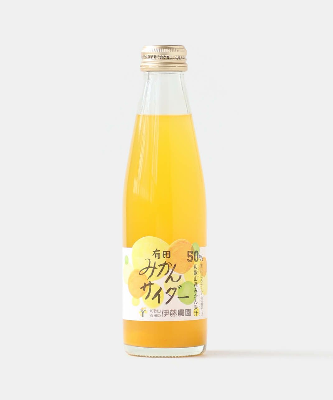 伊藤農園と創業三百年の老舗酒造・能勢酒造が共同開発した、和歌山県産の果汁をたっぷり使用したサイダーです。 細かな泡とすっきりした味わいがのど越しよく、後口すっきり。 伊藤農園オリジナル製法の、皮や袋の苦み・アクが入らないよう果肉だけを搾ったみかん果汁を使用し、 和歌山県産の果汁をたっぷり50%配合しているので、搾りたての果物の美味しさが広がります。