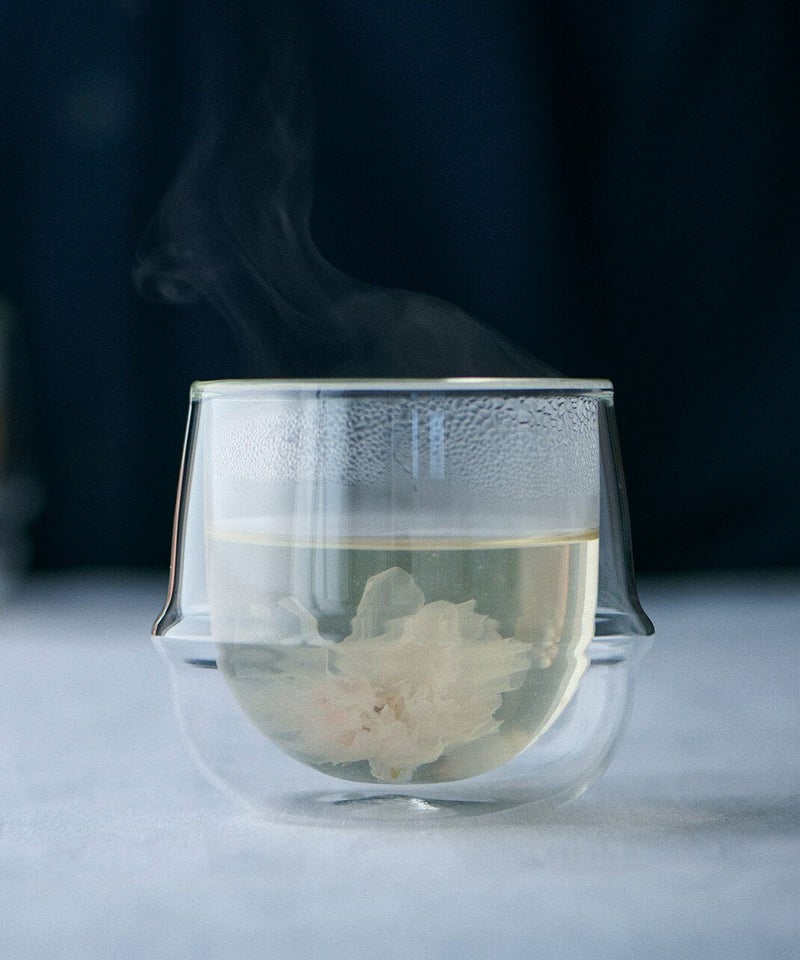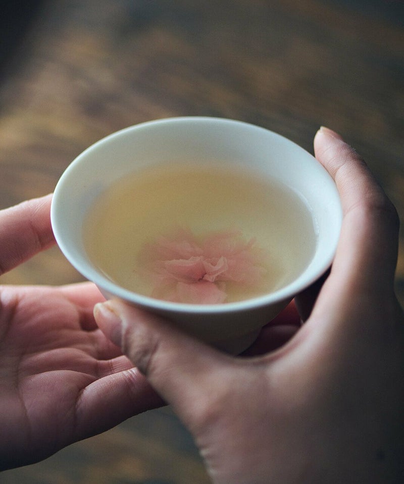 桜茶とは塩漬けの桜花にお湯やお茶を注いだ飲み物で、結納や慶事、お祝いの席でもてなされる縁起物。お茶の中で花開く姿を満開の桜に見立て、江戸時代頃から親しまれていました。本製品の桜花は、神奈川県小田原地方で栽培された食用の八重桜を使用。心を込めてひと房ずつ手摘みした花弁を、ひと樽ずつ手作業で塩漬けした桜花です。あざやかな緑色のお茶のなかで、ゆっくりと桜の花びらが開いていく様子を見ながら、お花見気分をお楽しみください。