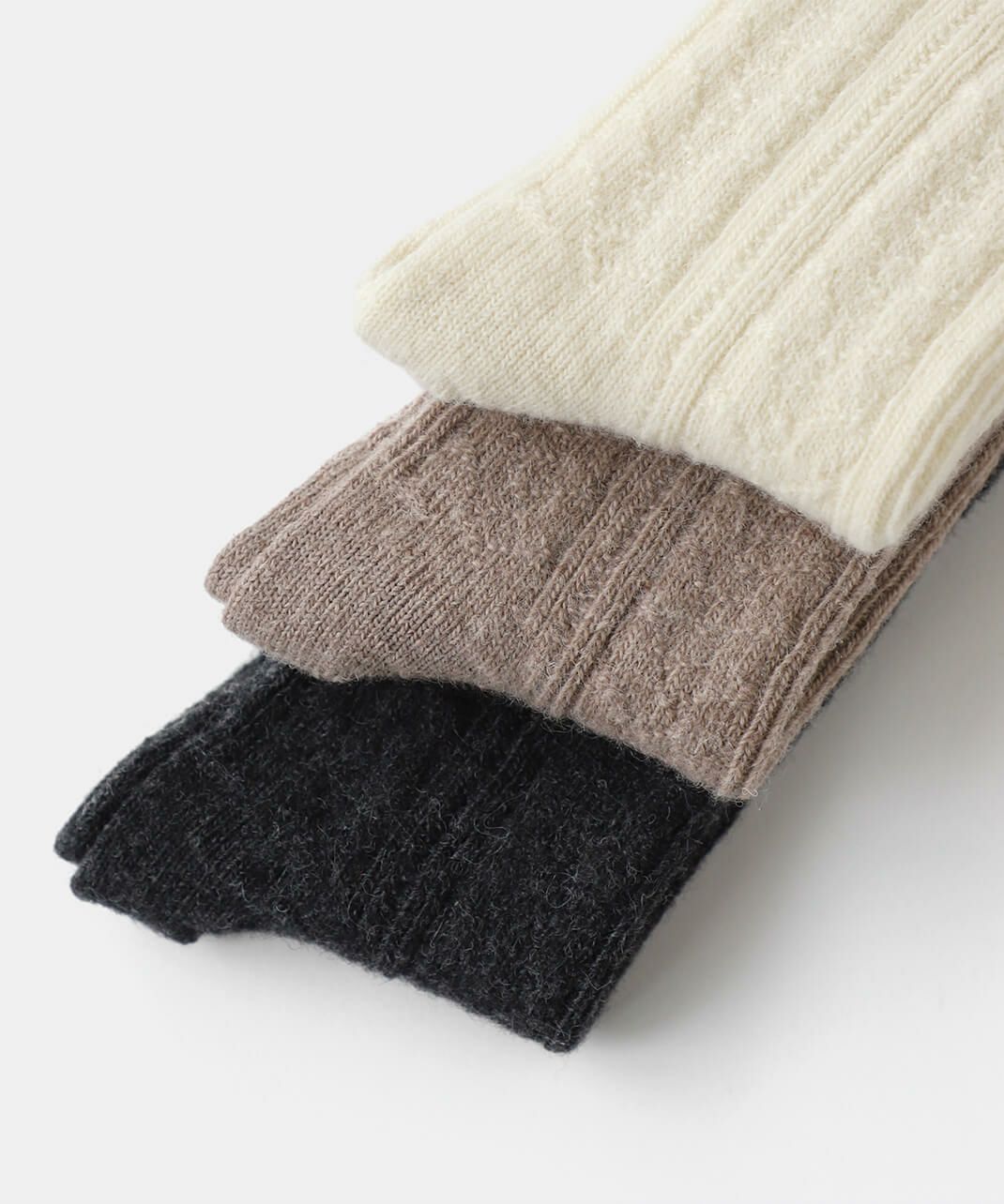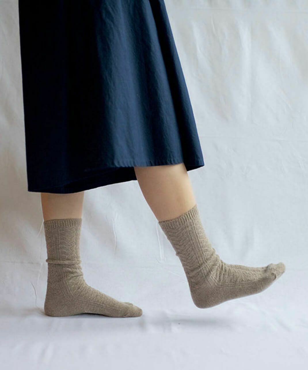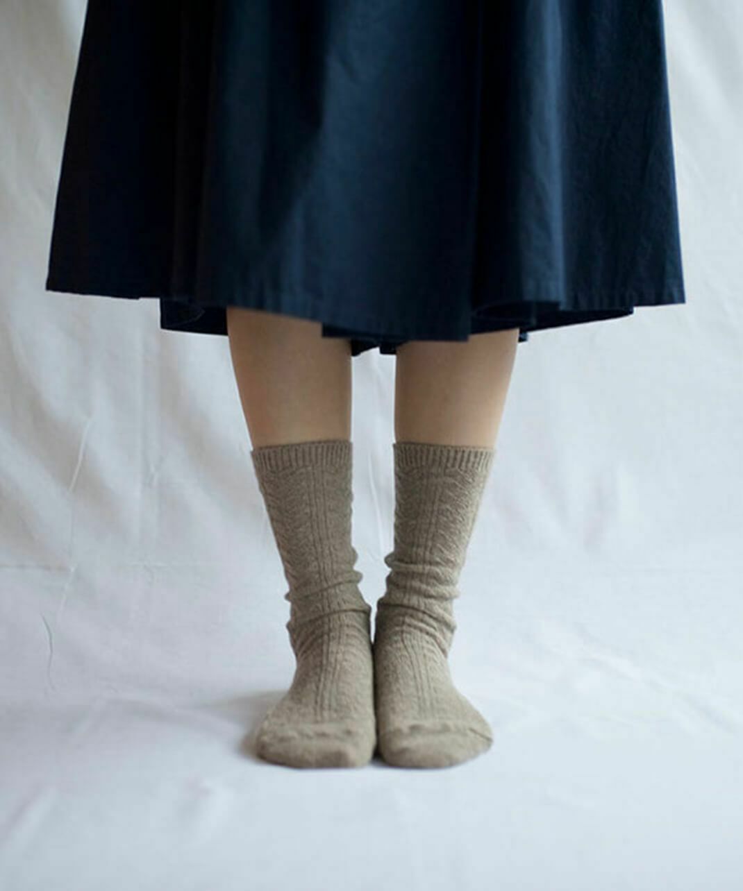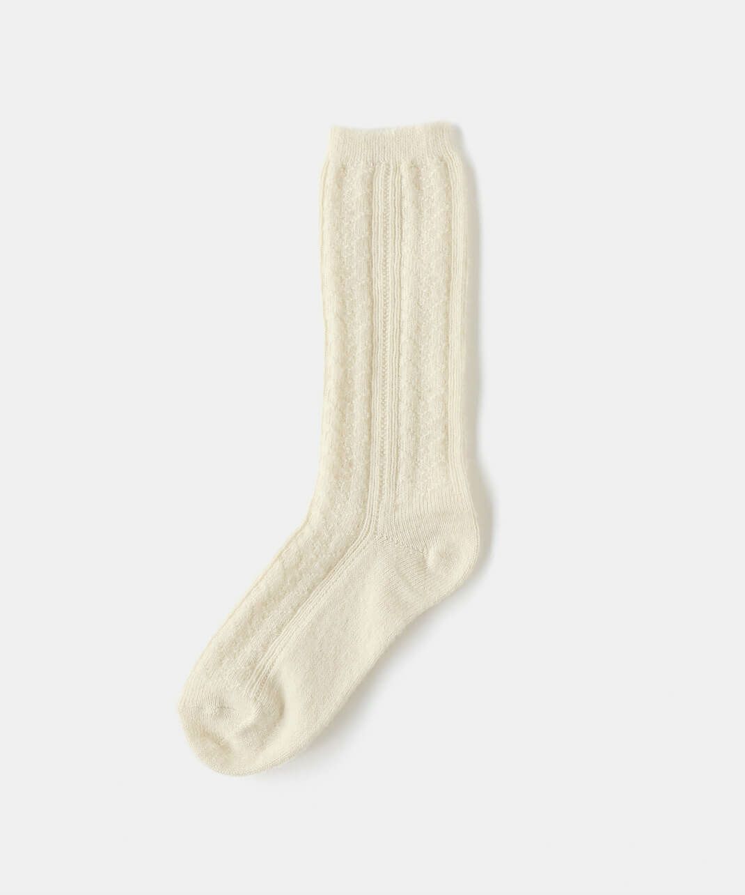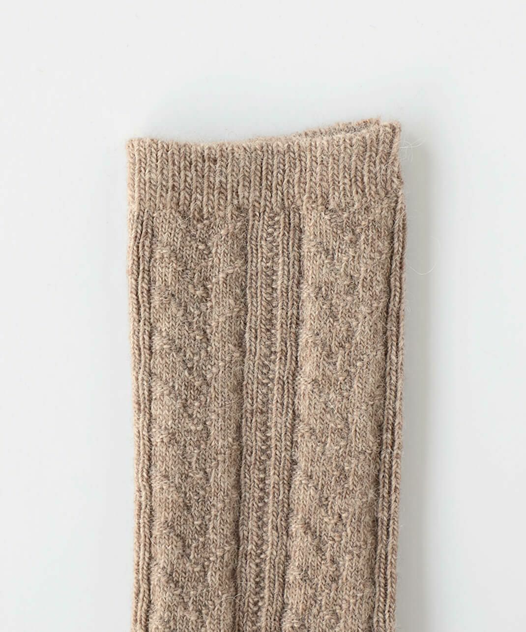 柔らかい「アルパカ」と、ふくらみのある「ウール」をブレンドした糸を使用しています。 「カシミヤウールソックス」と同じく、女性の秋冬に薄手で温かい靴下としてぴったり。 薄い生地ですが、アルパカとウールの温かさ、しっとりとした風合いを楽しんでいただけます。 スニーカーや革靴、ショートブーツに合うように、スタイリッシュな「ケーブルデザイン」にもこだわっています。