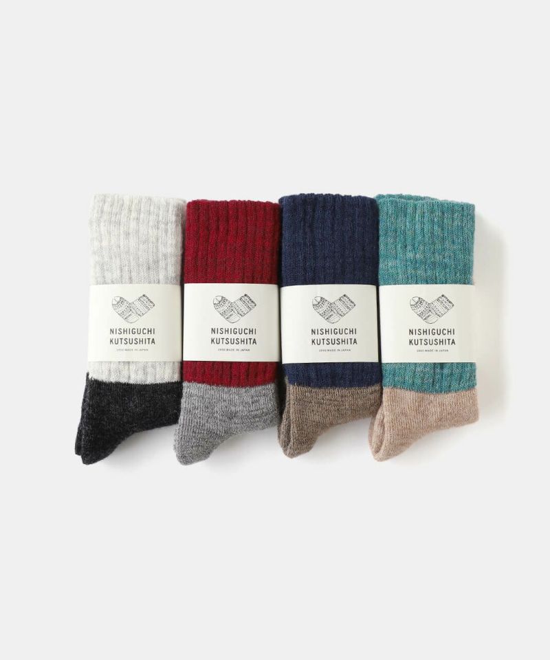 NISHIGUCHI KUTSUSHITAが届ける雪国対応の靴下。 生後1年以内の柔らかなキッドモヘアとウールを混紡した起毛糸を使用しております。 モヘヤの特徴は柔らかで保温性が高く、ウールとブレンドすることで薄手でも温かな靴下に仕上がりました。 足の部分をパイル、足首は二重に編まれたレッグウォーマーになっております。