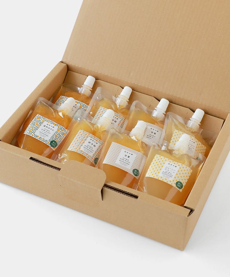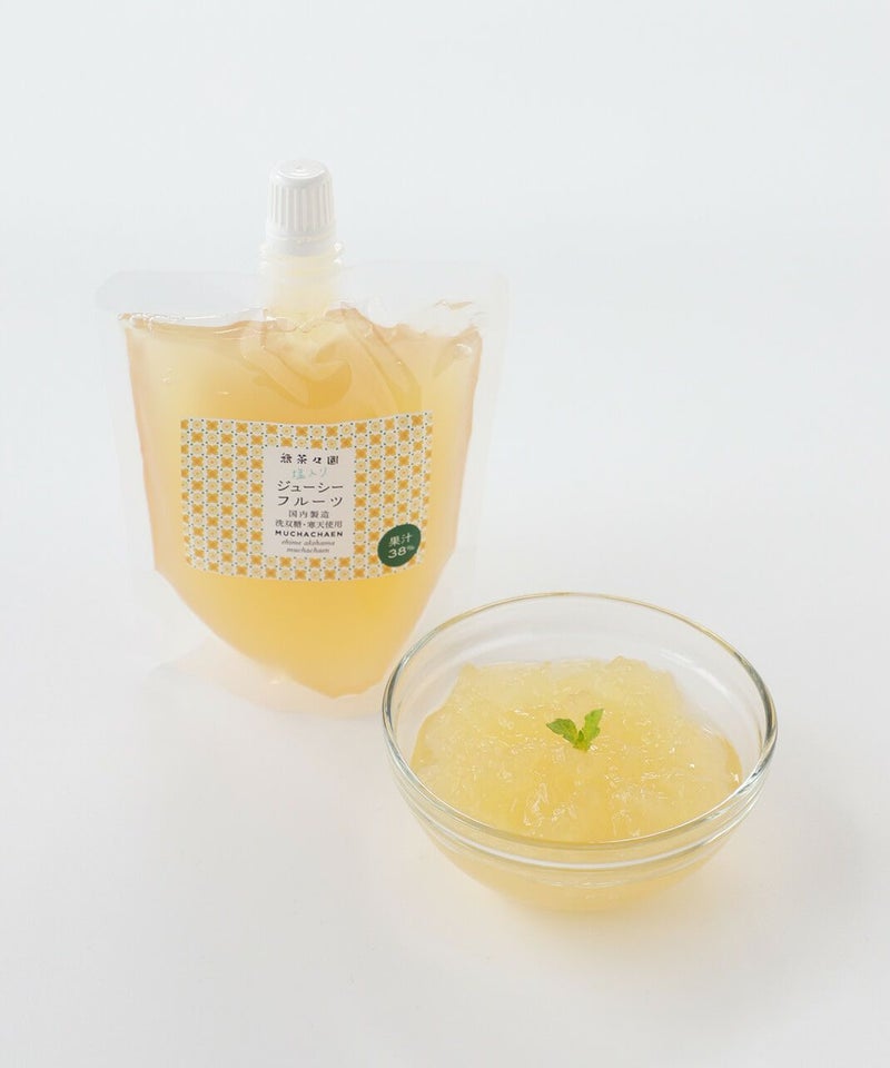 無茶々園産の柑橘果汁に、国産の粗糖、粉寒天、こんにゃく粉を加え、ゆるく固めた飲むゼリー。