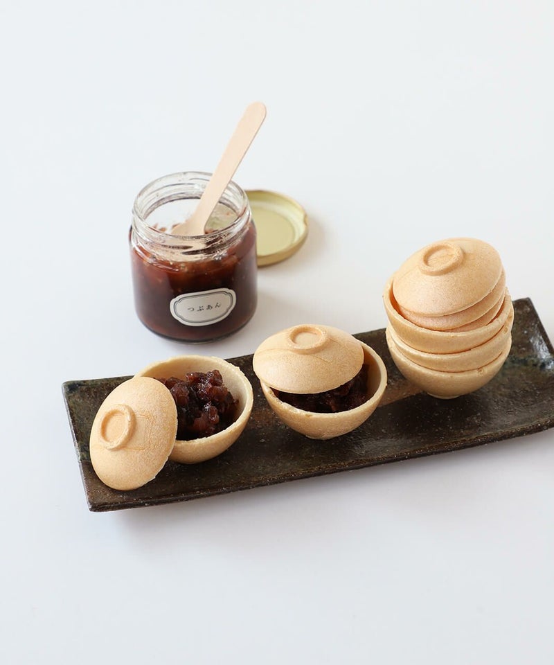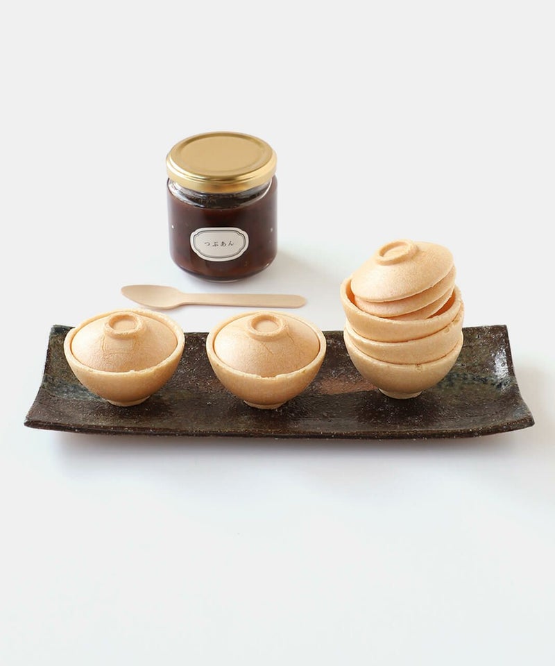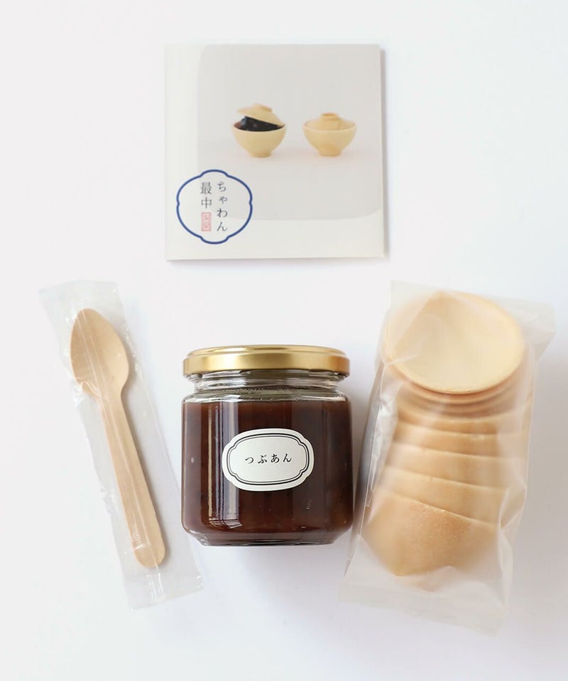 有田焼のふた付きちゃわんの形をした香ばしい最中の皮と佐賀の老舗菓子店「鶴屋」の風味豊かなつぶあんの瓶詰セットです。