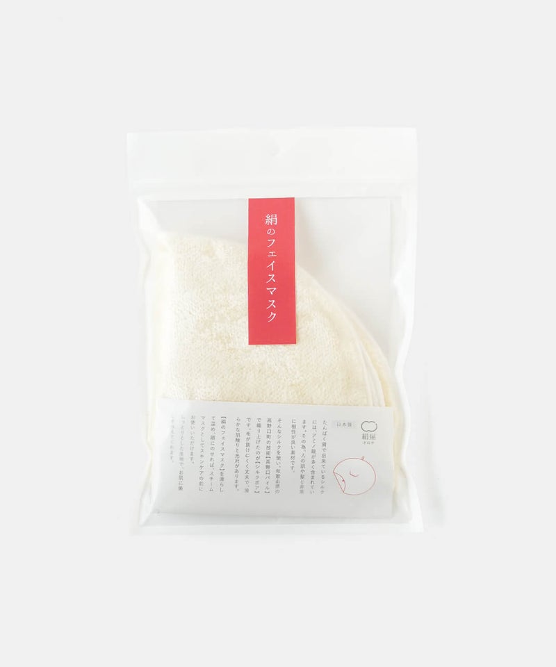 和歌山県の高野口地方にしか現存しない、希少な織り機で作られたシルクボアのフェイスマスク。日本の職人の伝統技術によって生み出されました。新幹線のシートなどにも使われている技術で、しっとりとした肌触りと、毛羽がでにくい為、繊維が顔につく心配もありません。数百万本の極細の絹糸が、肌にやさしく馴染みます。
