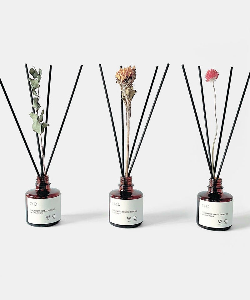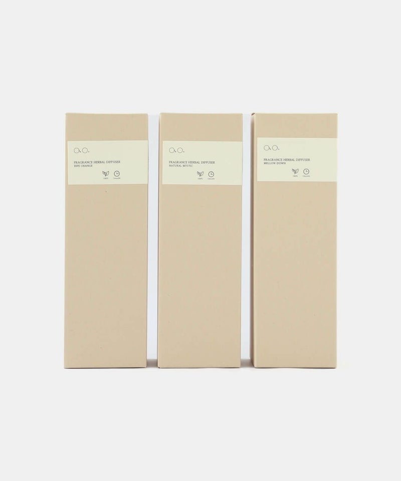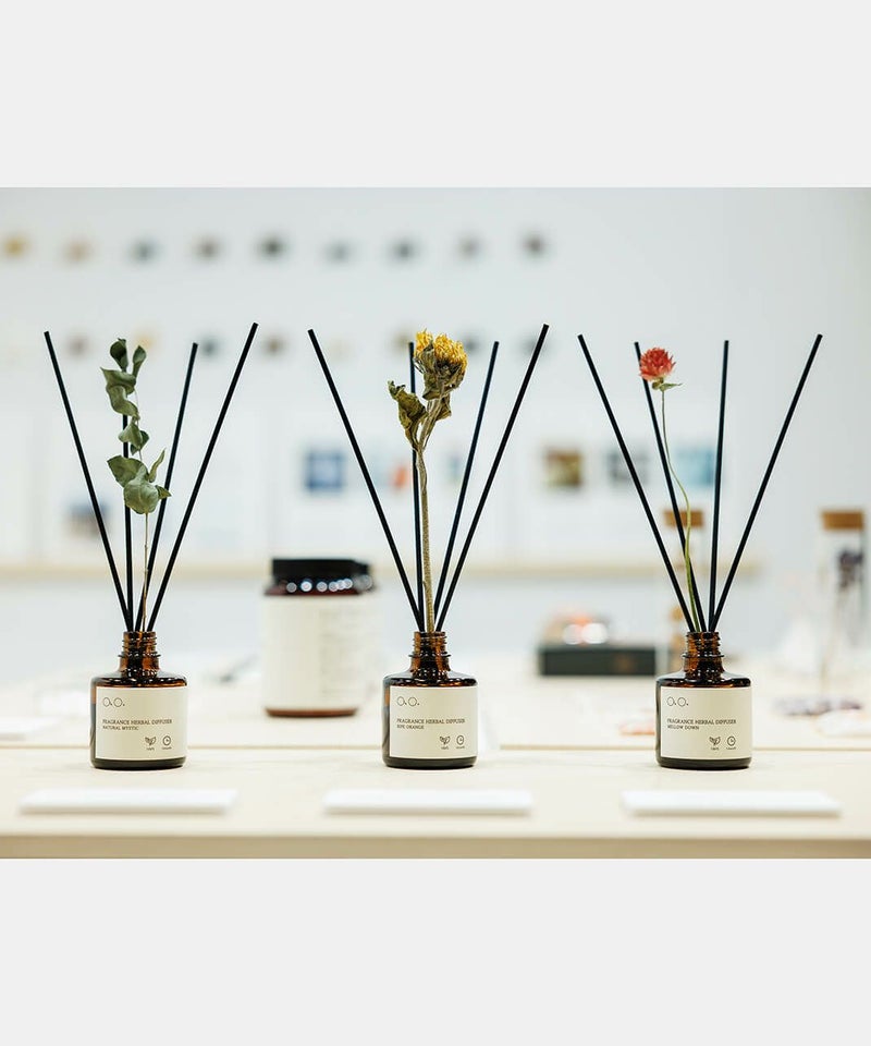 精油だけではなく、配合するアルコールやグリセリンにいたるまで、トウモロコシやヤシ由来の天然由来原料を使用し、安心してお使いいただけます。ao.のアトリエで作るFRAGRANCE HERBAL DIFFUSERは、厳選した原材料を配合し、ブレンドや調合、ラベルの糊付けに至るまで一点一点ハンドメイドにて製造しています。