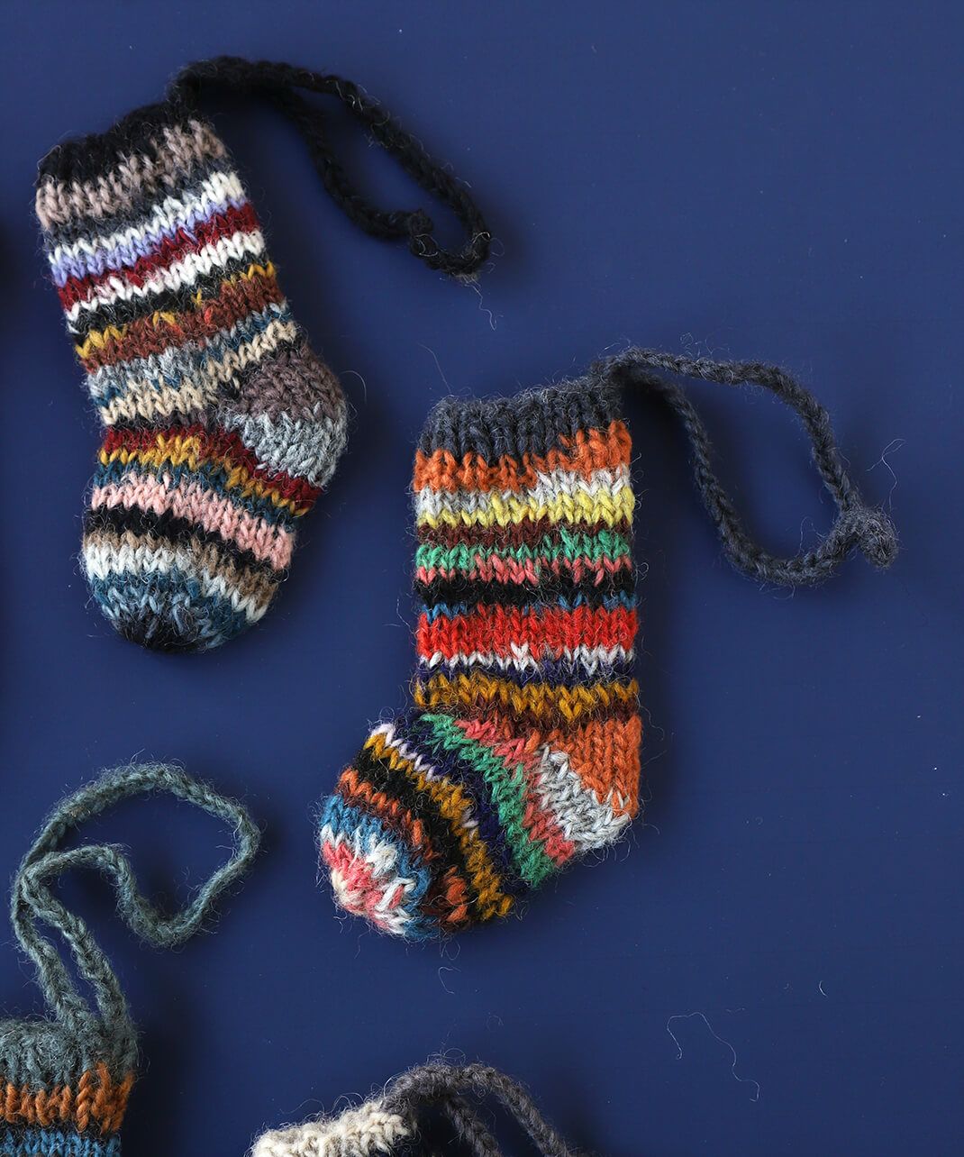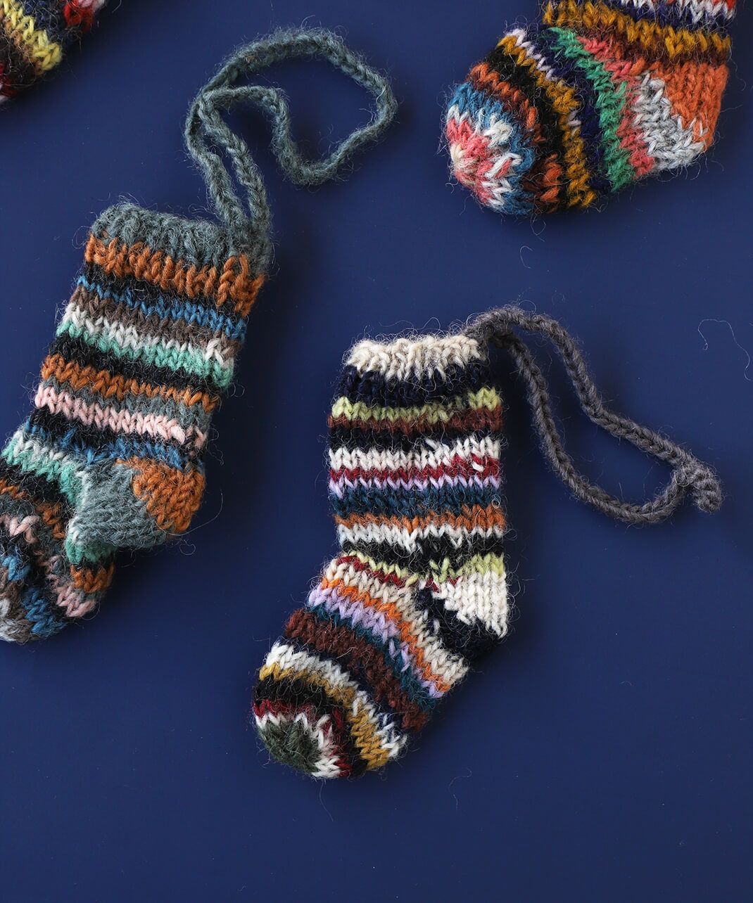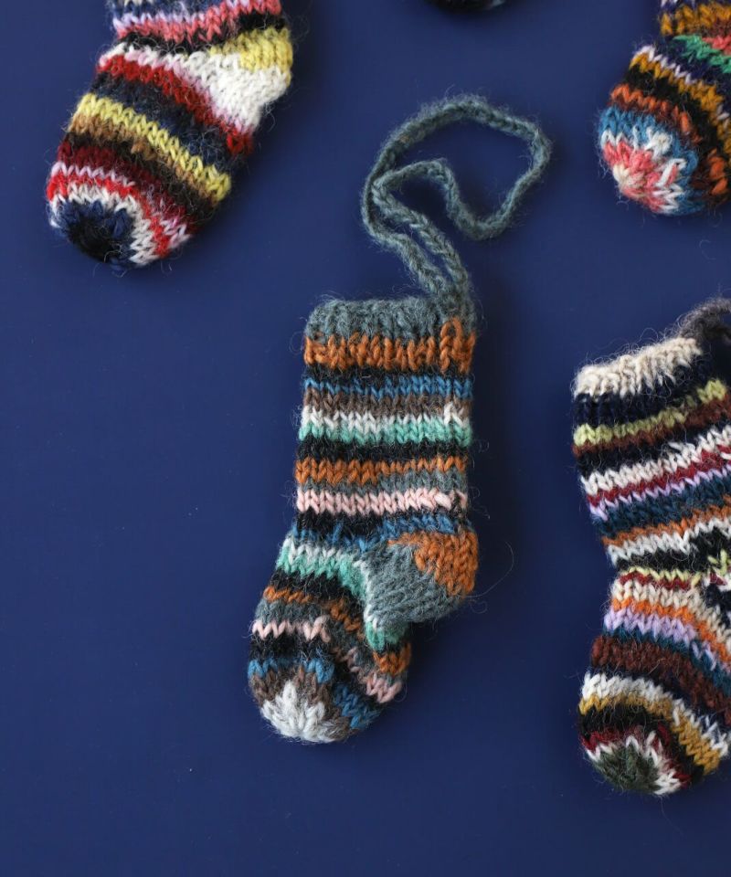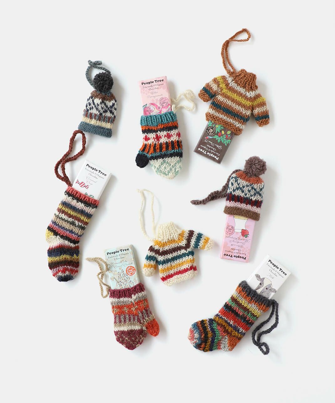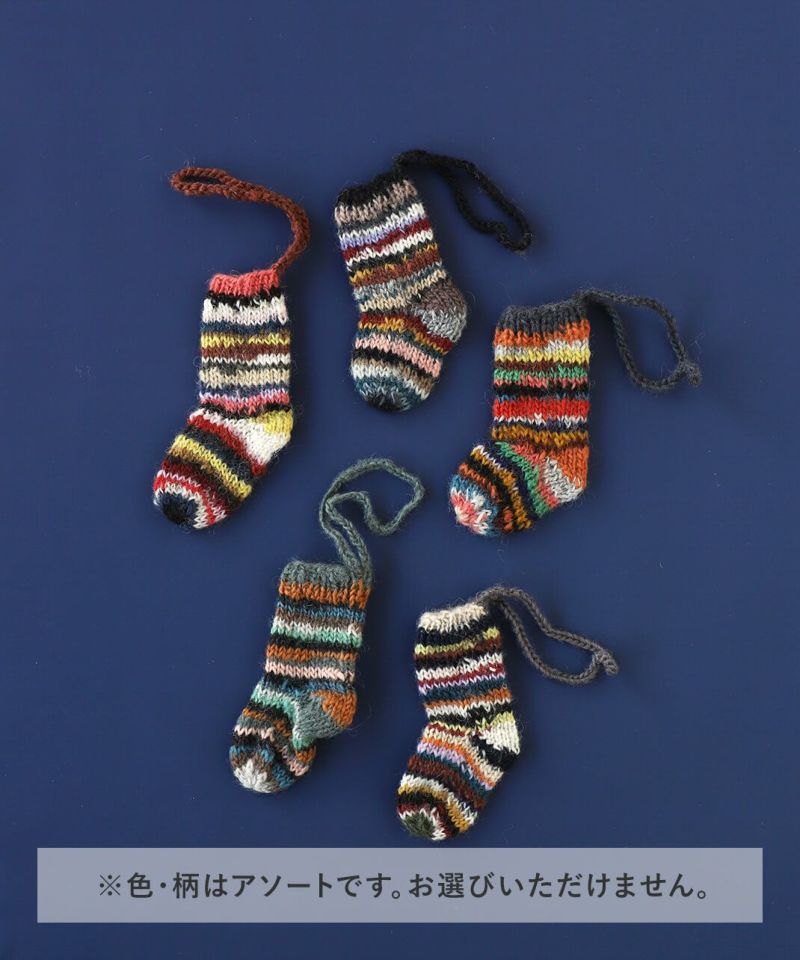 色とりどりの毛糸で手編みしたミニサイズのソックスは、見ているだけで心が弾むかわいらしさです。 ネパールの生産者パートナーがセーターなどを作ったときに余った毛糸(リサイクルウール)を利用して作っています。 ツリーのオーナメントやギフトのラッピングに使っても。ピープルツリー定番のチョコレートを入れてプレゼントにおすすめです。