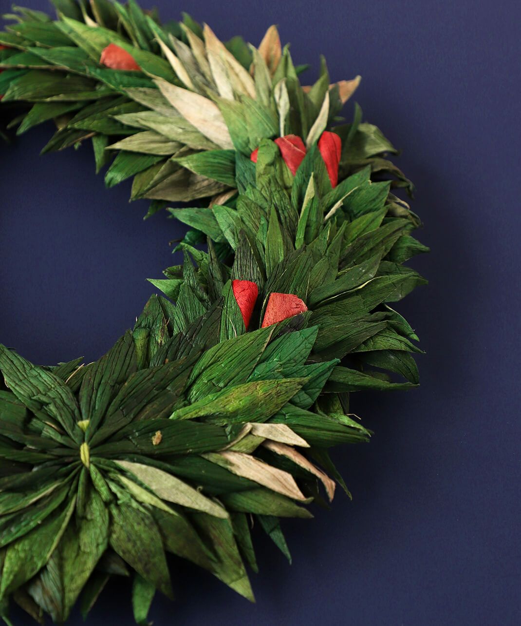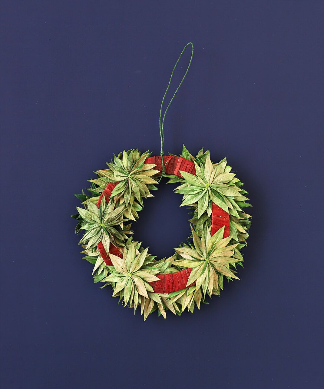 ホテイアオイの茎を染め、葉の形にカットしたものをリースにしました。 小ぶりなサイズなのでフックを使って気軽に飾れます。
