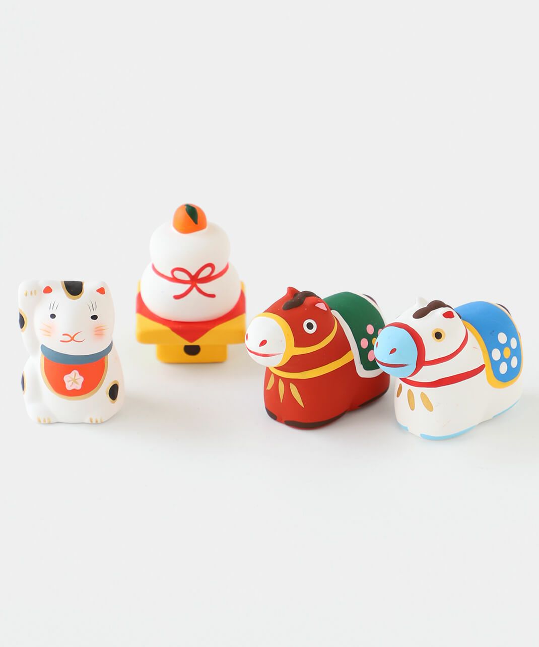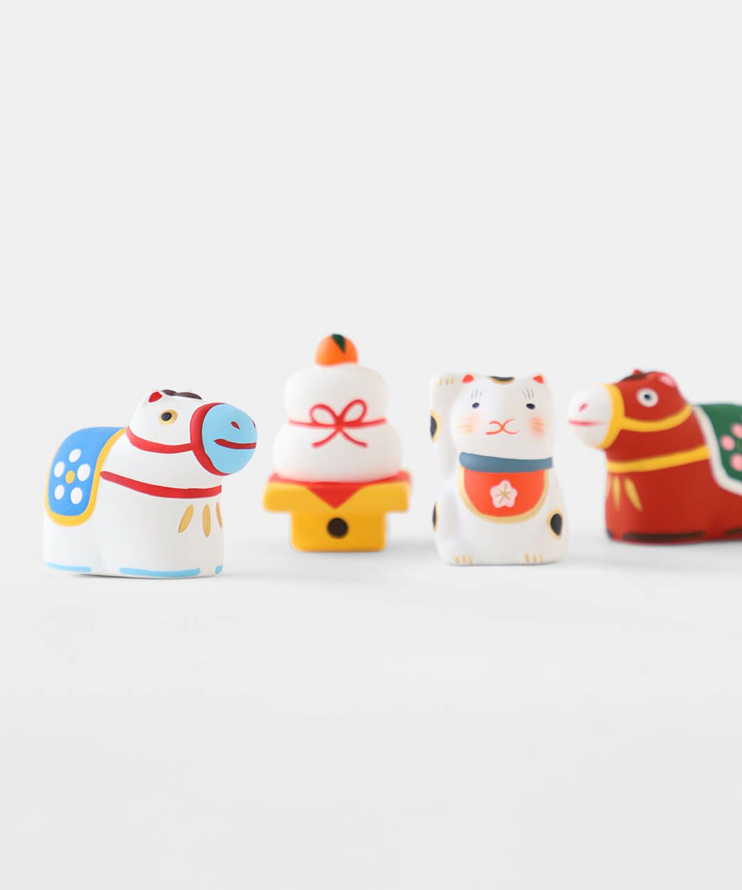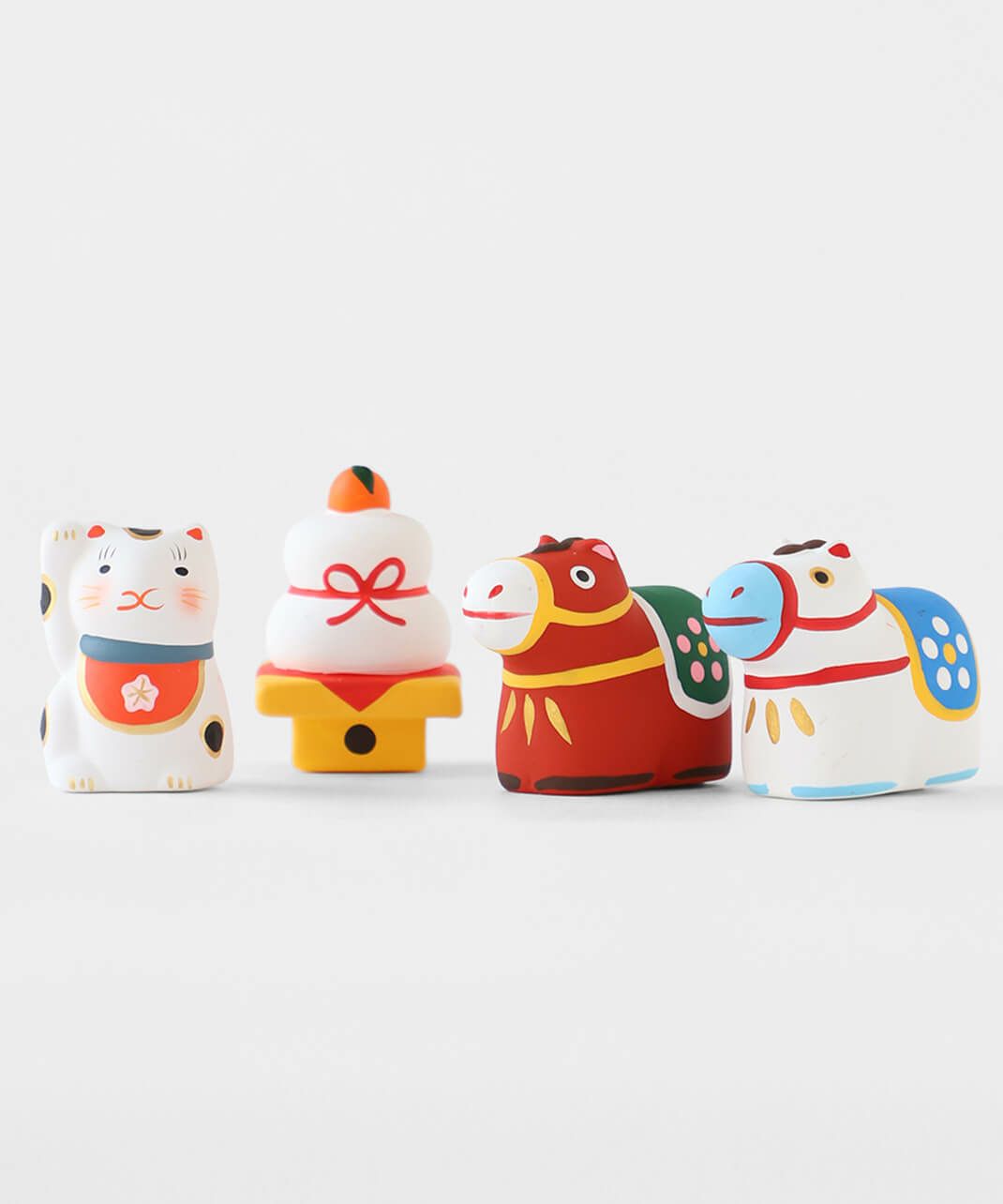 陶製の人形の中に、小さく折りたたんだおみくじが入っています。 底面の赤い紐を引いていただくと、5種類から1枚、そのモチーフにちなんだおみくじが出てきます。 おみくじを楽しんだ後は、お好きな場所に飾ってお楽しみください。 来年の干支の午は、にっこりと朗らかな顔で新しい年を駆けていく姿をイメージし表現しています。 背中の鞍(くら)には縁起のいい梅の模様入り。白いウマには白梅、赤いウマには薄紅色の梅が描かれており、2種類並べてお飾りいただくのもおすすめです。 農耕や運搬、移動手段などに役立つことで古くから人々の暮らしを支え、大切にされてきた午(ウマ)。 その力強くたくましい印象から、生命力や健康、発展を象徴する招福の縁起物とされ、牛とともに神様の乗り物としても尊ばれてきました。 また、「ウマ」という名前の響きから「うまくいく」、走る姿から「幸運が駆け込んでくる」などの願いがこめられることもあります。