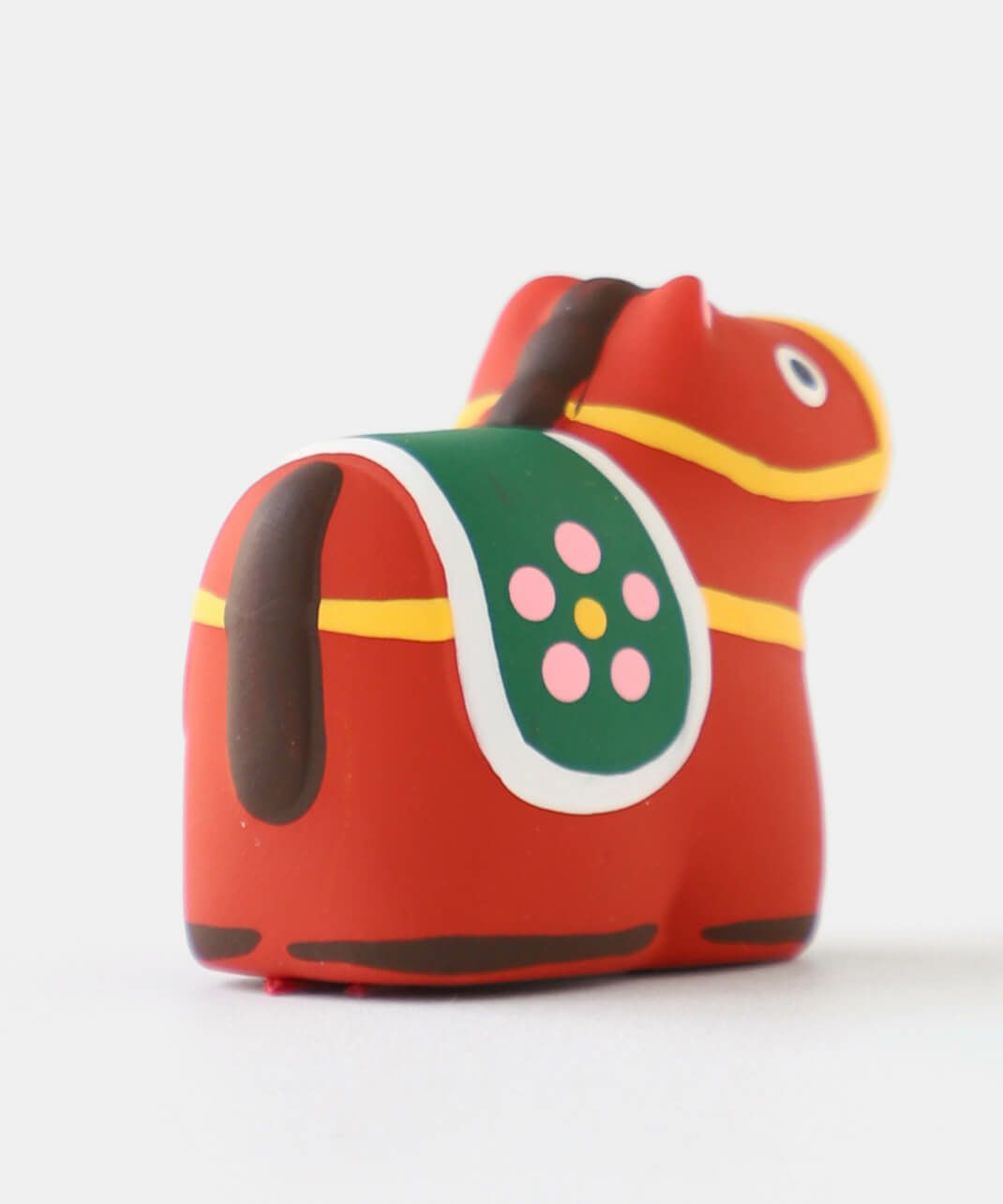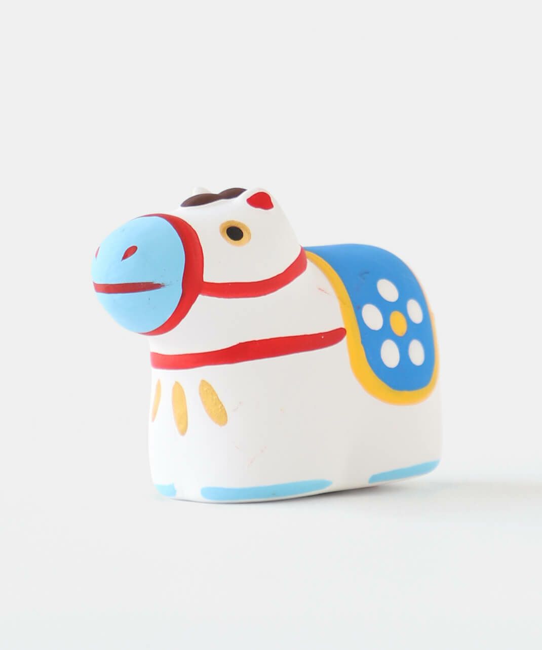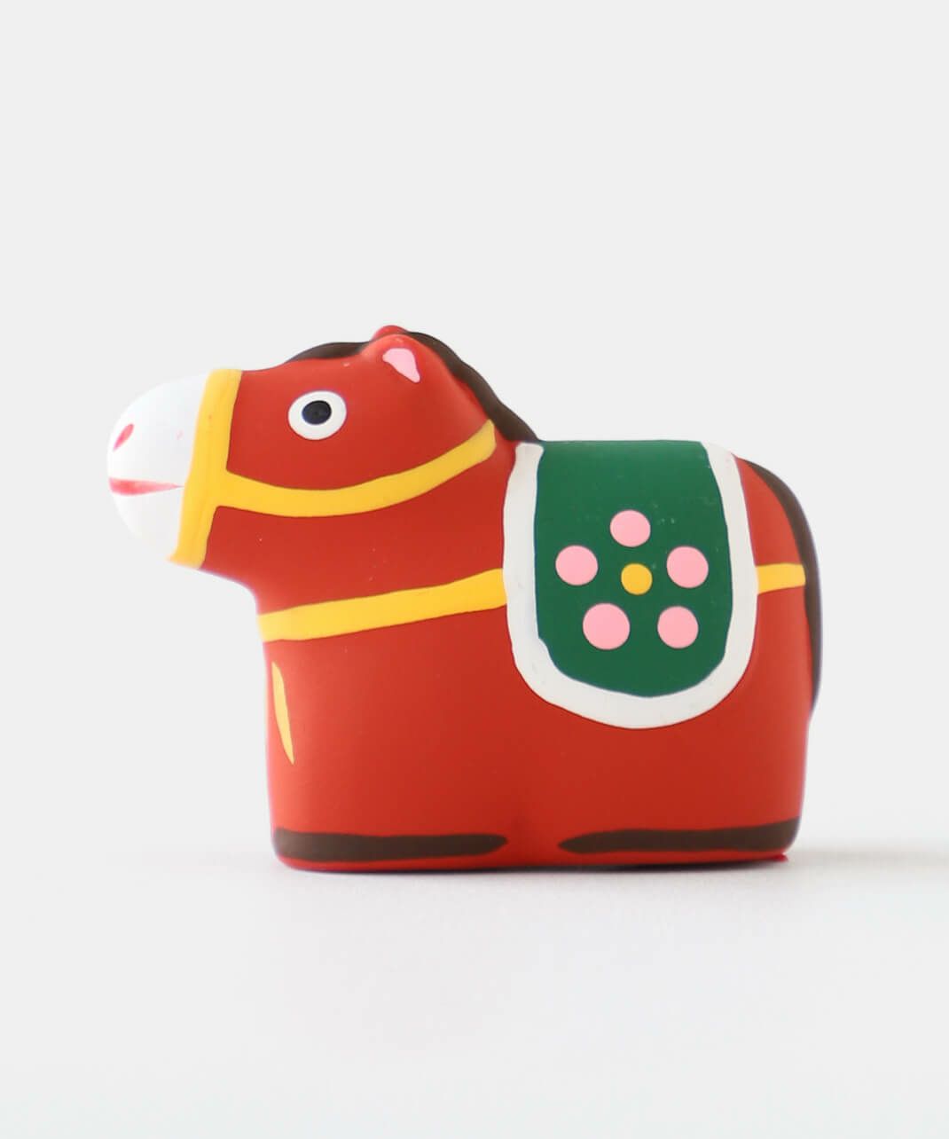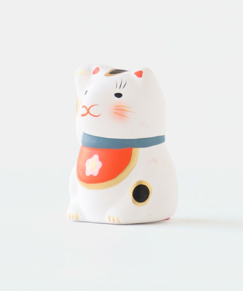 陶製の人形の中に、小さく折りたたんだおみくじが入っています。 底面の赤い紐を引いていただくと、5種類から1枚、そのモチーフにちなんだおみくじが出てきます。 おみくじを楽しんだ後は、お好きな場所に飾ってお楽しみください。 来年の干支の午は、にっこりと朗らかな顔で新しい年を駆けていく姿をイメージし表現しています。 背中の鞍(くら)には縁起のいい梅の模様入り。白いウマには白梅、赤いウマには薄紅色の梅が描かれており、2種類並べてお飾りいただくのもおすすめです。 農耕や運搬、移動手段などに役立つことで古くから人々の暮らしを支え、大切にされてきた午(ウマ)。 その力強くたくましい印象から、生命力や健康、発展を象徴する招福の縁起物とされ、牛とともに神様の乗り物としても尊ばれてきました。 また、「ウマ」という名前の響きから「うまくいく」、走る姿から「幸運が駆け込んでくる」などの願いがこめられることもあります。