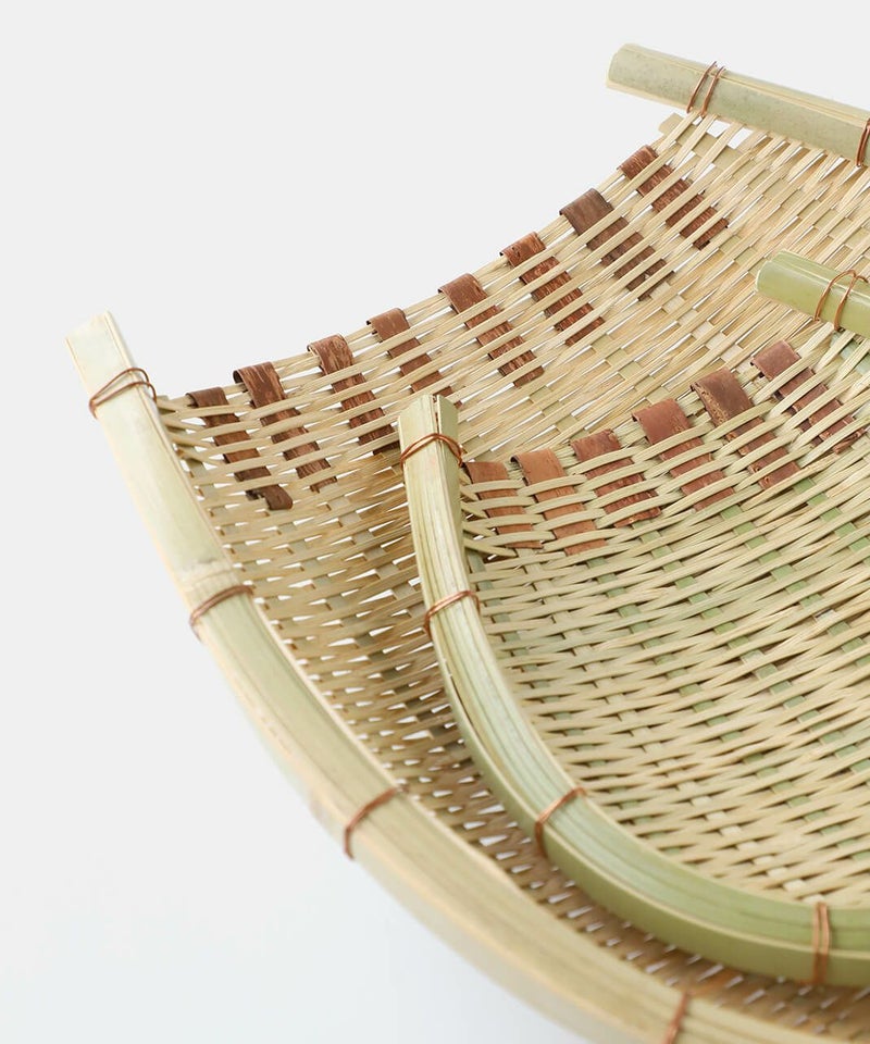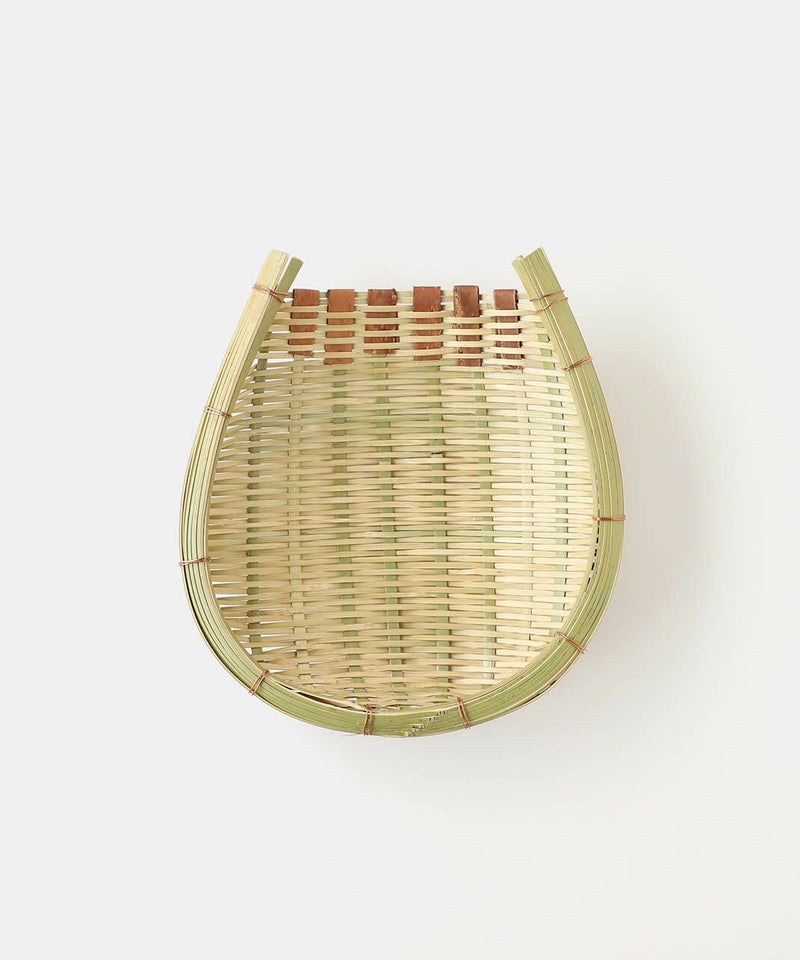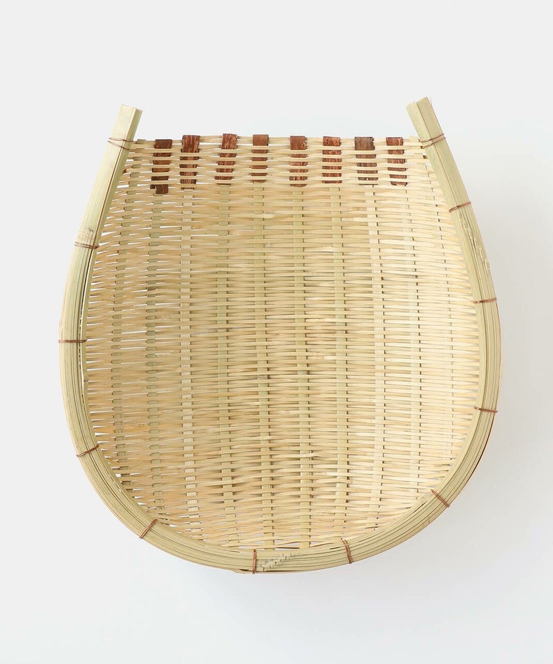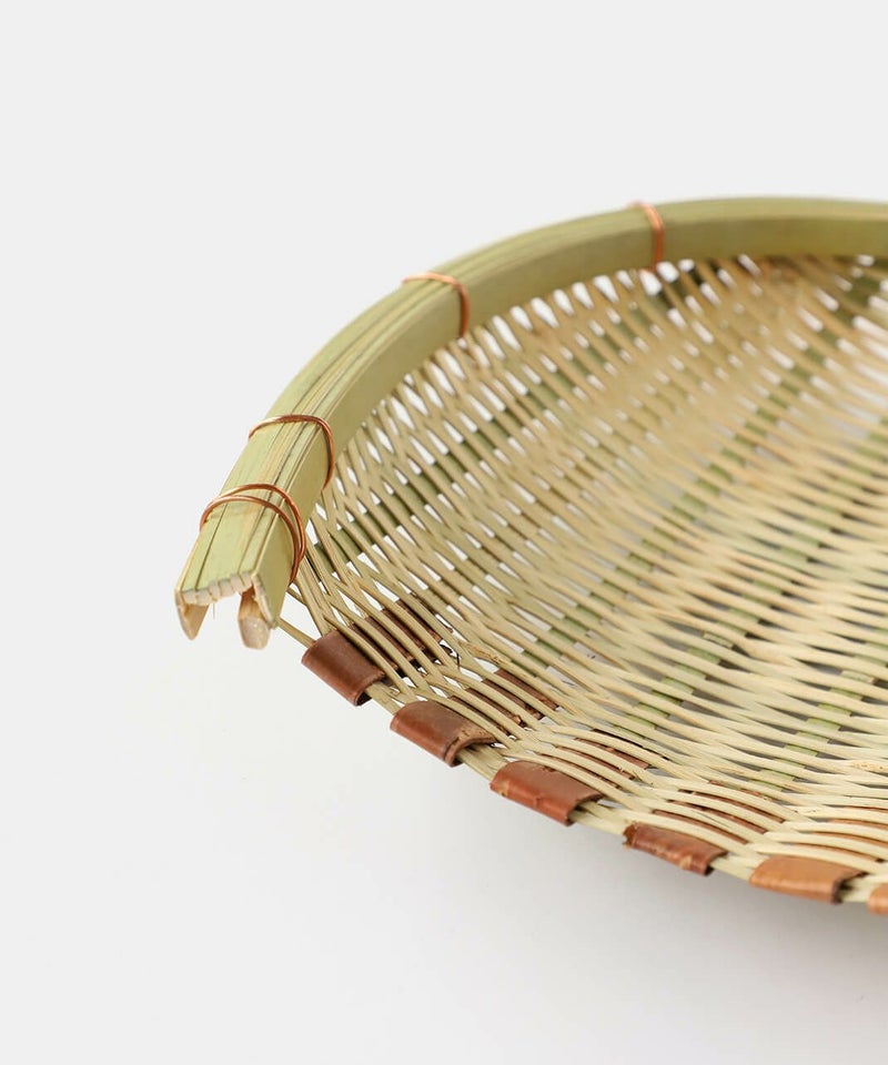 群馬県南部で地元の真竹から編み上げた「みざる」です。昔から日々の暮らしの道具として米研ぎざるや野菜の洗いかごとして使われています。外側は真鍮針金で補強され、口元には桜の皮が巻かれています。針金の先は竹に挟まれる形処理されているので安全です。