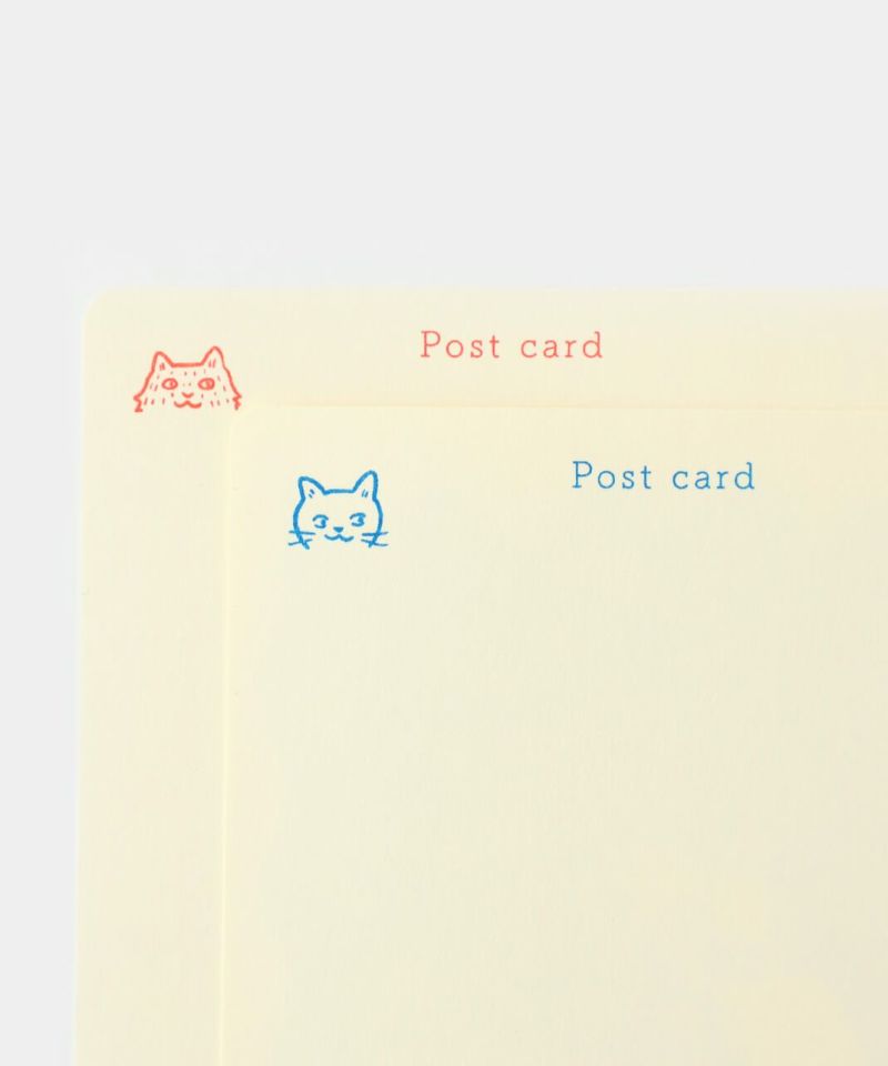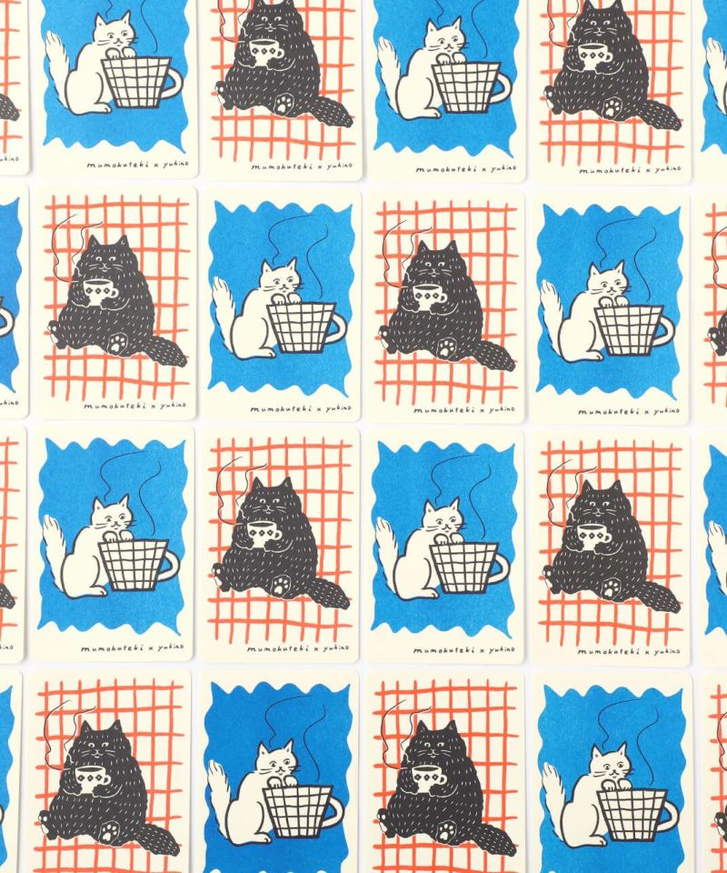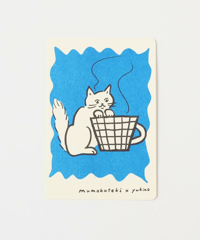イラストレーター「yukino」と「mumokuteki」のコラボアイテムのポストカードです。ポストカードは猫柄2種類。マグカップを手に寛いでいる猫ちゃんが可愛いデザインです。