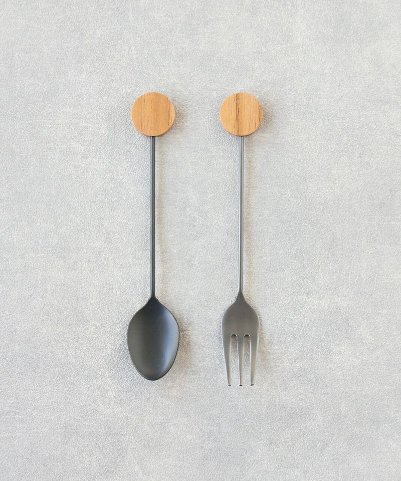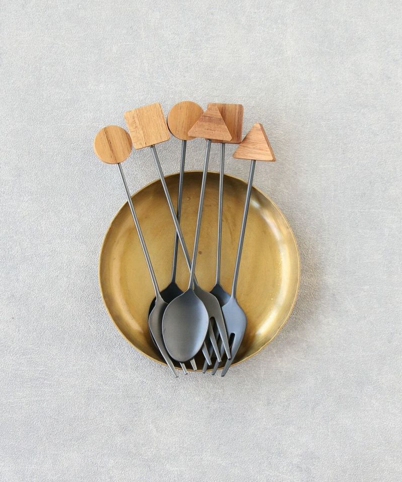 幾何学モチーフの木製パーツがアクセントのカトラリーです。