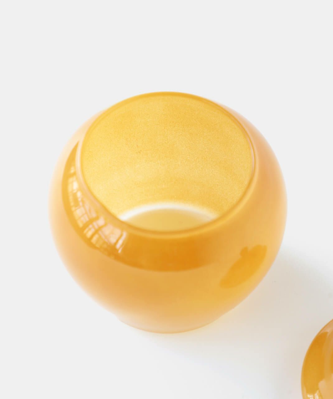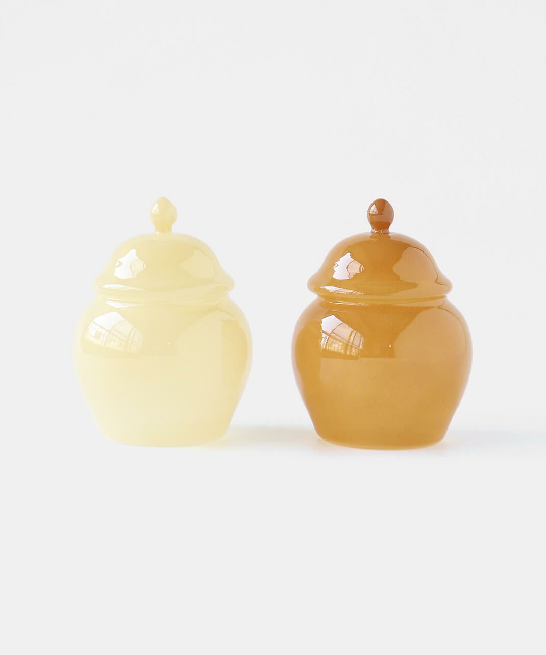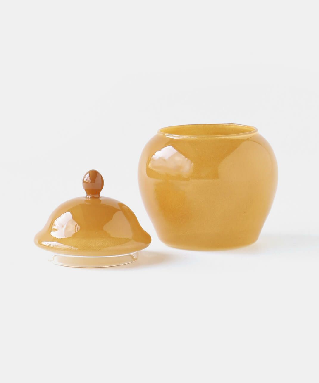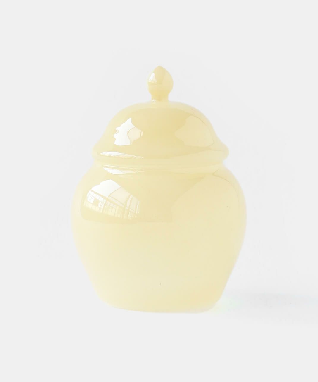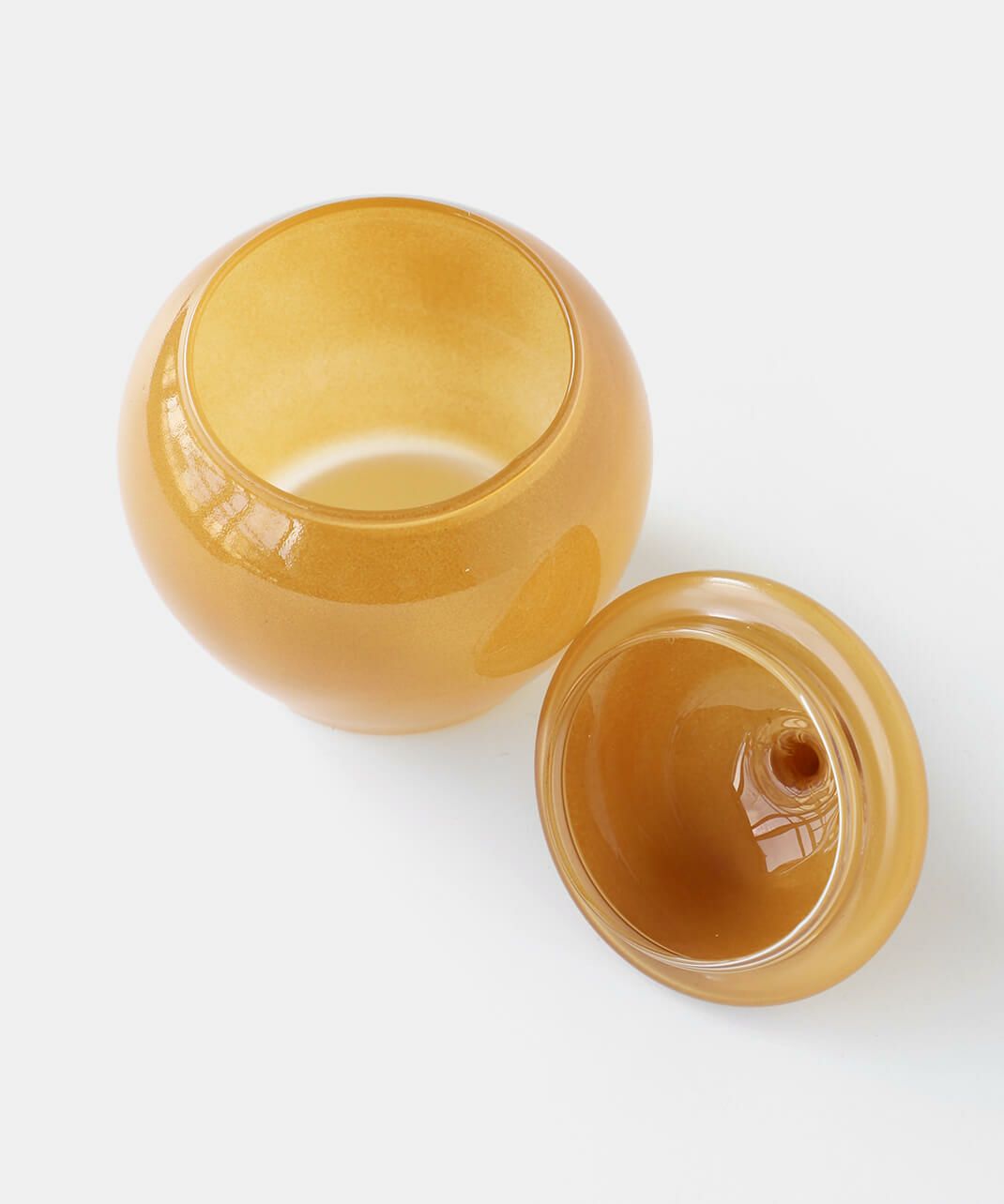丸みを帯びたレトロなフォルムに乳白系の塗装が施された、耐熱ガラス製のキャニスター。 ガラスのフタをかぶせるだけのシンプルな作りです。ポットの底面は透明。 砂糖などの調味料やスパイスなどの乾物を入れたり、綿棒やコットンを入れても。お菓子を忍ばせてテーブル上に置いておくのもおすすめです。 まぁるくポテっとしているフォルムが可愛いですね。