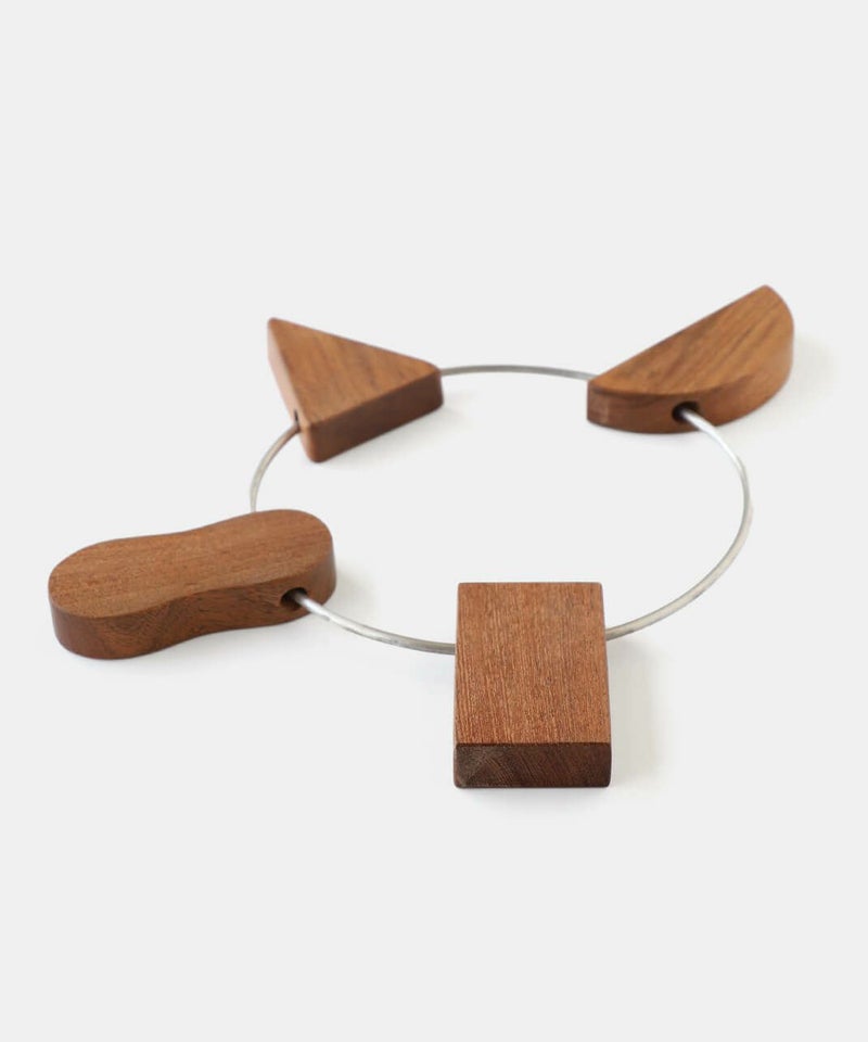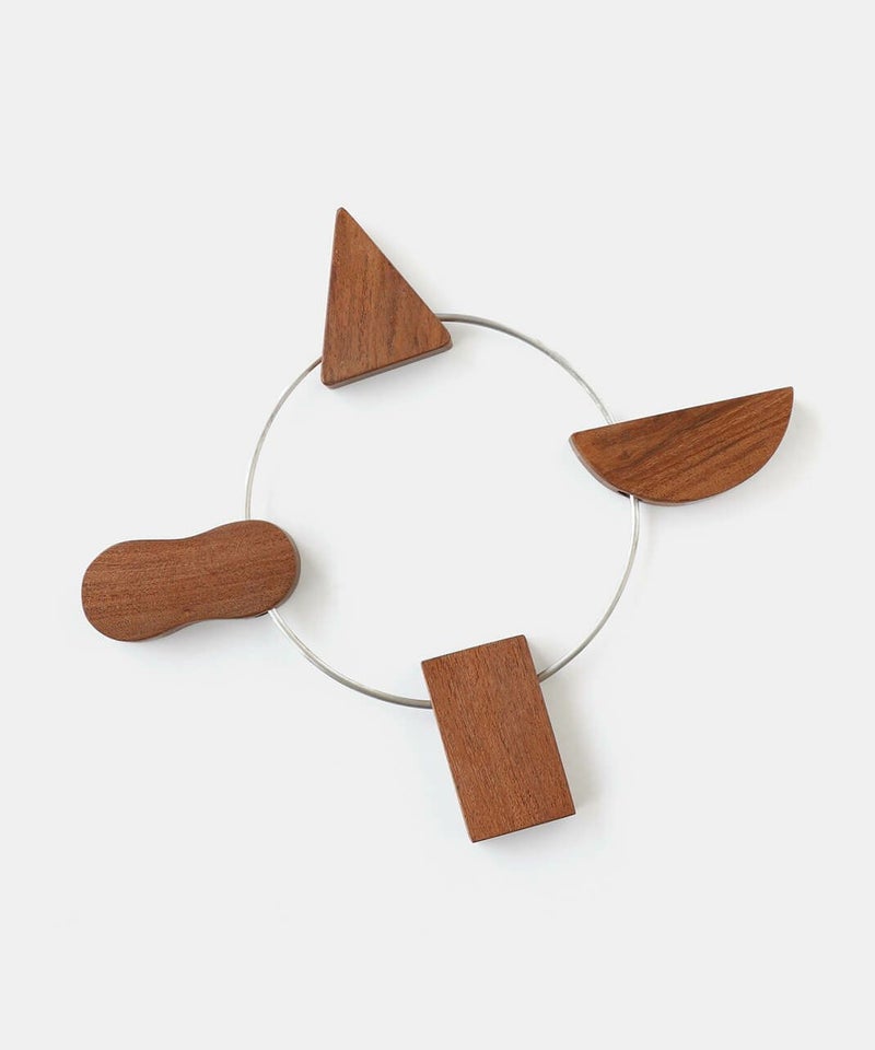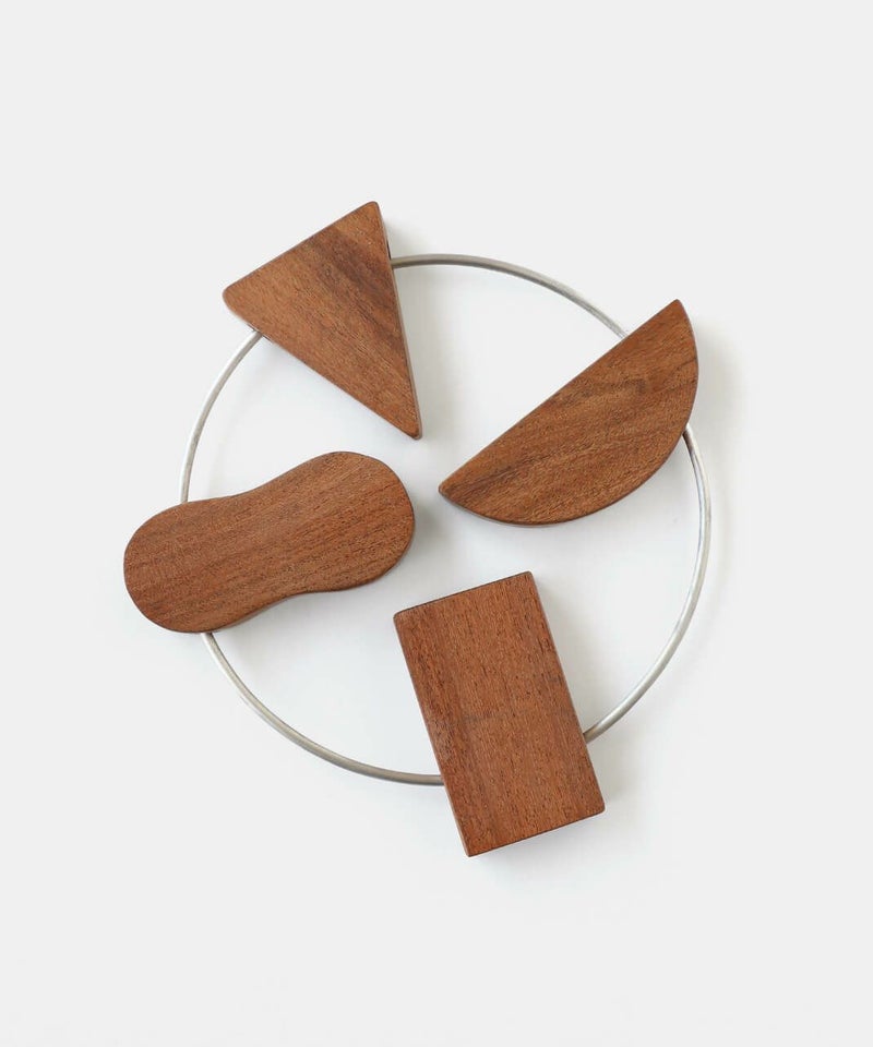 アルミと木を組み合わせた温かみある素材で作られた鍋敷き。内側に倒せばコンパクトに、外側に倒せば大きくなるので、鍋や器のサイズに合わせて使えるのがポイント。一つ一つ形が異なるモチーフがキッチンに温かみと遊び心を加えます。使わないときはリングに引っ掛けて簡単に収納でき、空間をスッキリ保てます。おしゃれで機能的なアイテムは、ダイニングやキッチンのアクセントにもぴったりです。