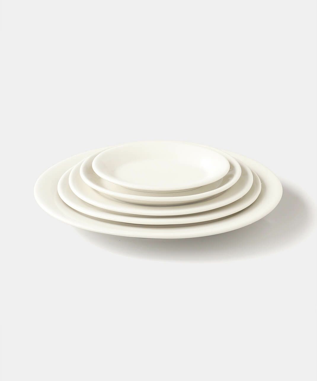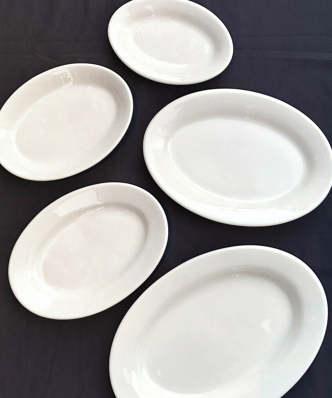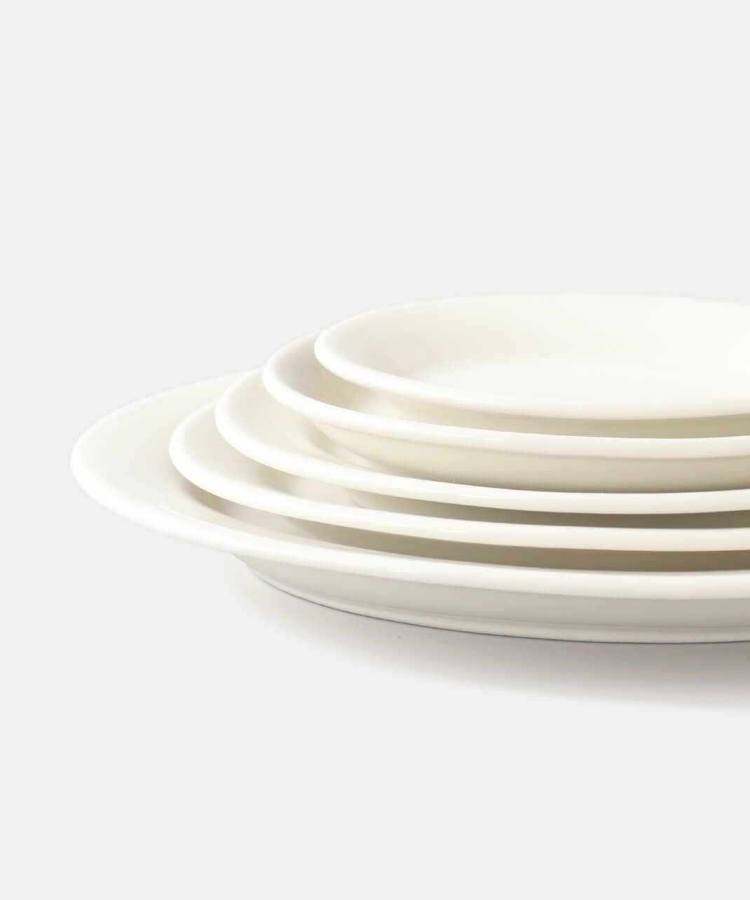 Tuxton 「Eggshell」シリーズのオーバルプレート。少し深さがある形なので、さっと盛り付けるだけで様になります。計5サイズ展開で、用途に合わせて最適のサイズを選べるのもポイント。大きめのプレートは、メイン料理用にはもちろん、大皿料理の盛り付けにも使えるサイズ感。小さめのプレートは、前菜やパンをのせたり、取り皿にもぴったり。ラインナップも豊富なので、いくつか揃えておくのもおすすめです。普段使いからおもてなしの時までシーンを問わずに活躍してくれます。