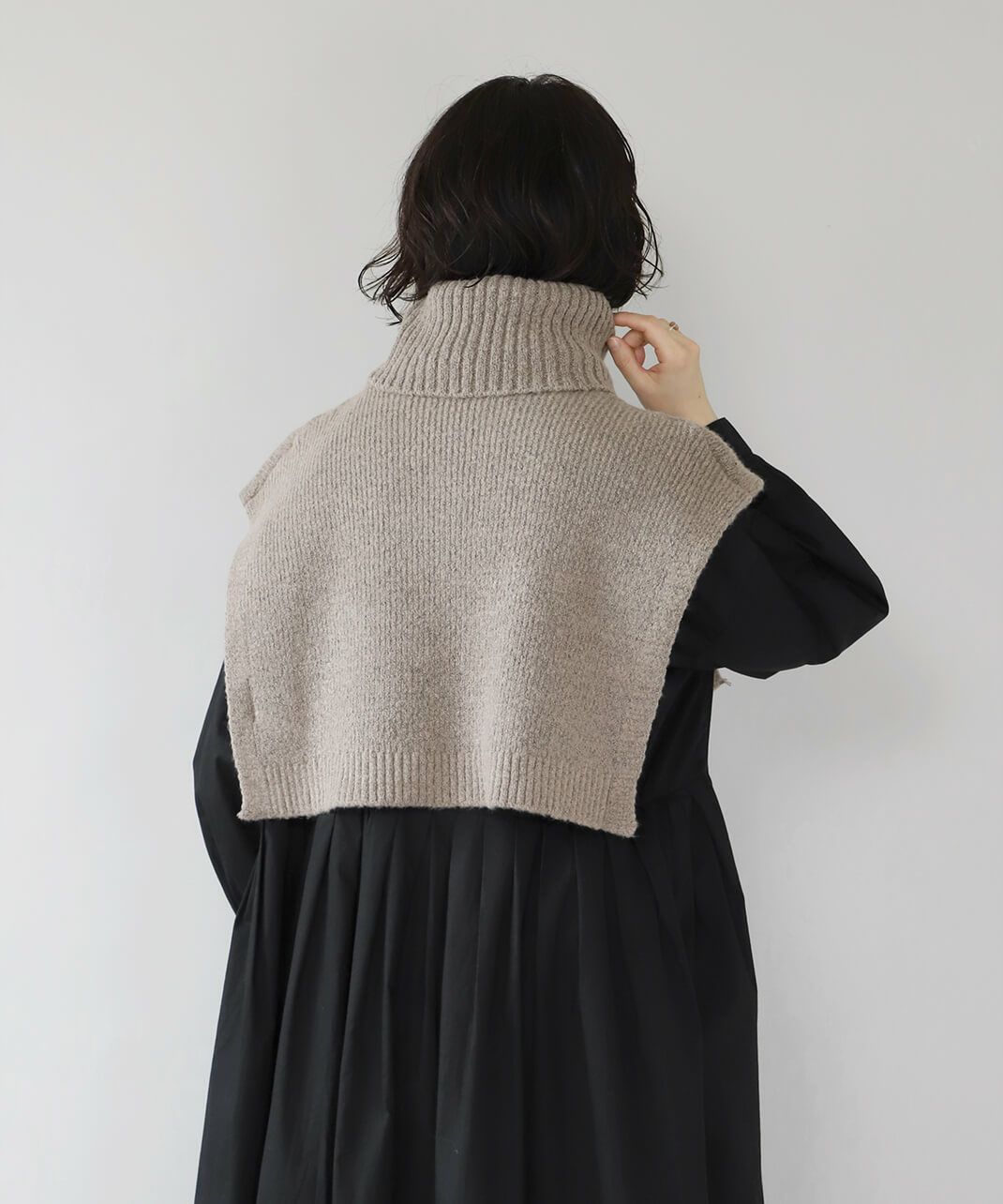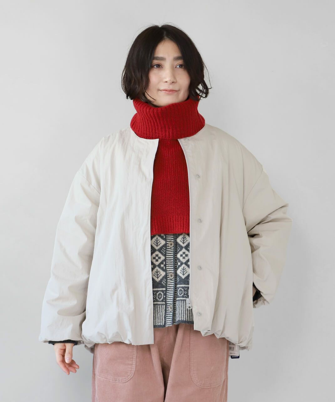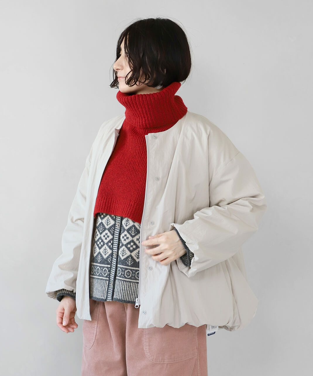 中綿ノーカラーショートコート