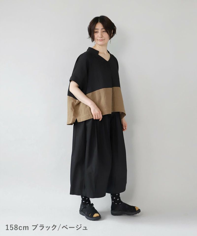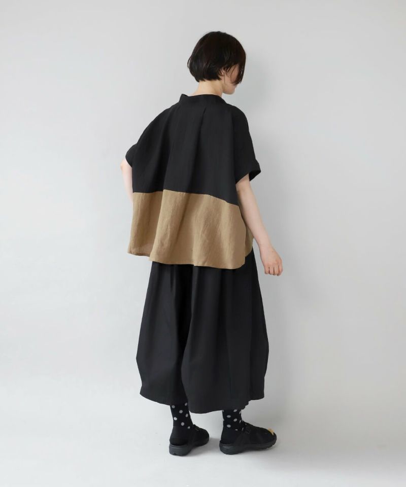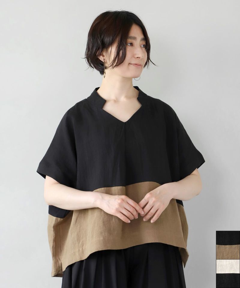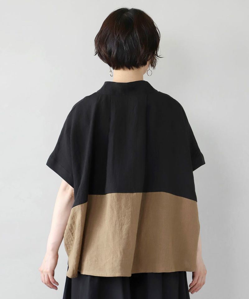 少し厚みのある上品な光沢のリネン生地を使用したプルオーバーのブラウスです。 すっきりとした浅めのVネックで程よい抜け感と、フロントに入れたタックと裾に向かって広がるAラインでしっかりと立体感のあるシルエットに仕上げられています。目を惹く大胆な配色切替えは、洗練された大人の印象を演出してくれます。リネン特有のハリ感は肌へのまとわりも少ないため、涼しく着用できるのも嬉しいポイントです。