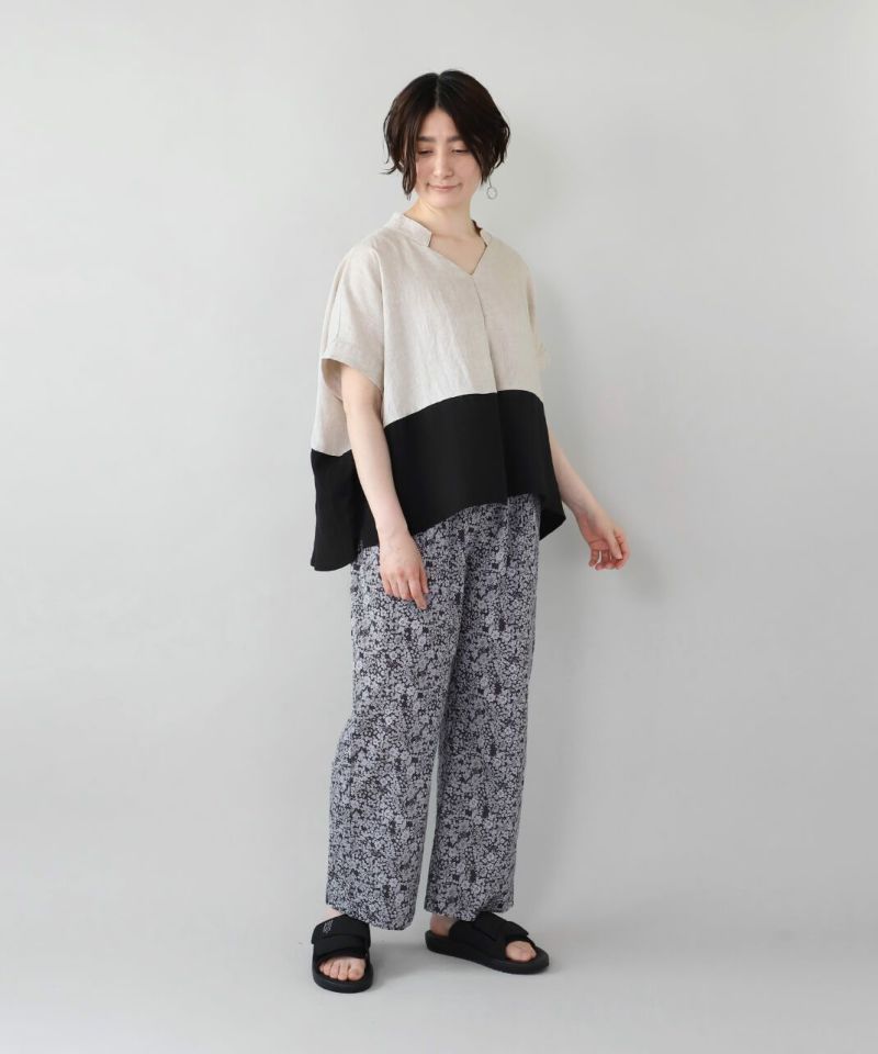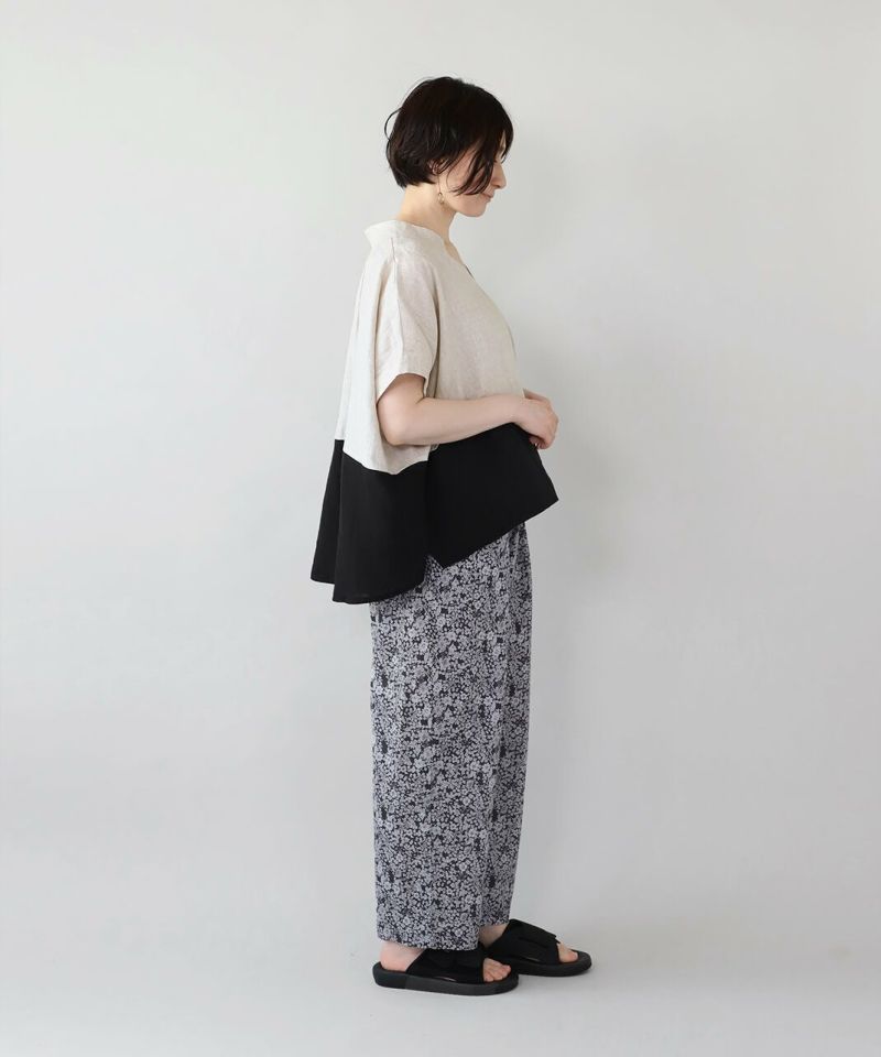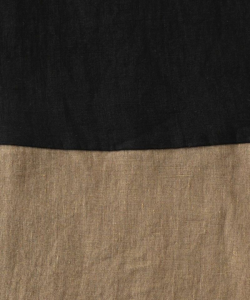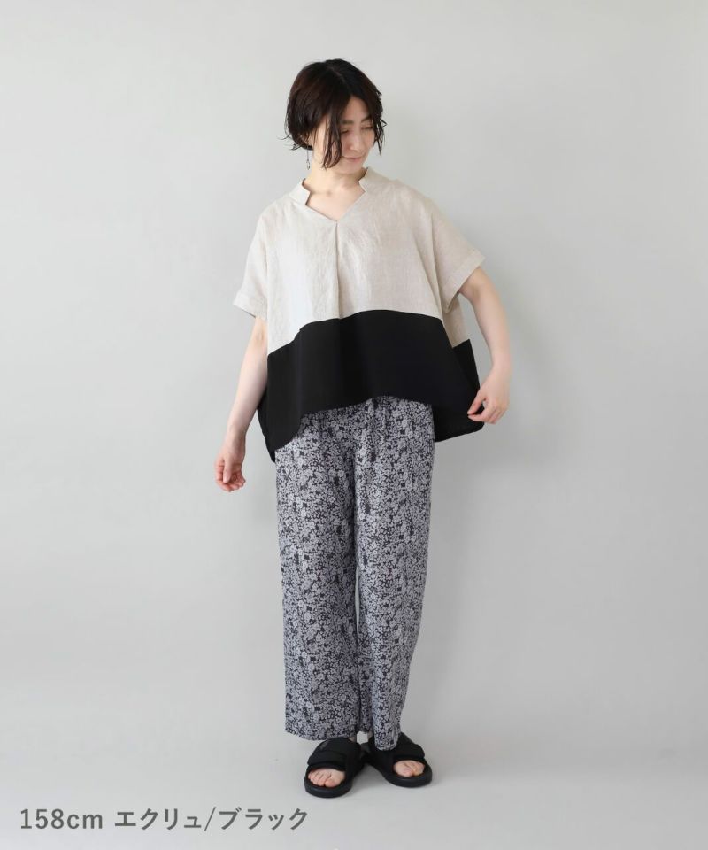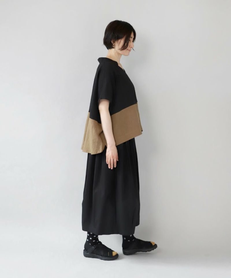 少し厚みのある上品な光沢のリネン生地を使用したプルオーバーのブラウスです。 すっきりとした浅めのVネックで程よい抜け感と、フロントに入れたタックと裾に向かって広がるAラインでしっかりと立体感のあるシルエットに仕上げられています。目を惹く大胆な配色切替えは、洗練された大人の印象を演出してくれます。リネン特有のハリ感は肌へのまとわりも少ないため、涼しく着用できるのも嬉しいポイントです。