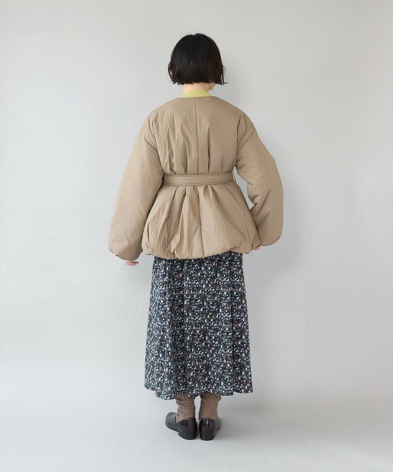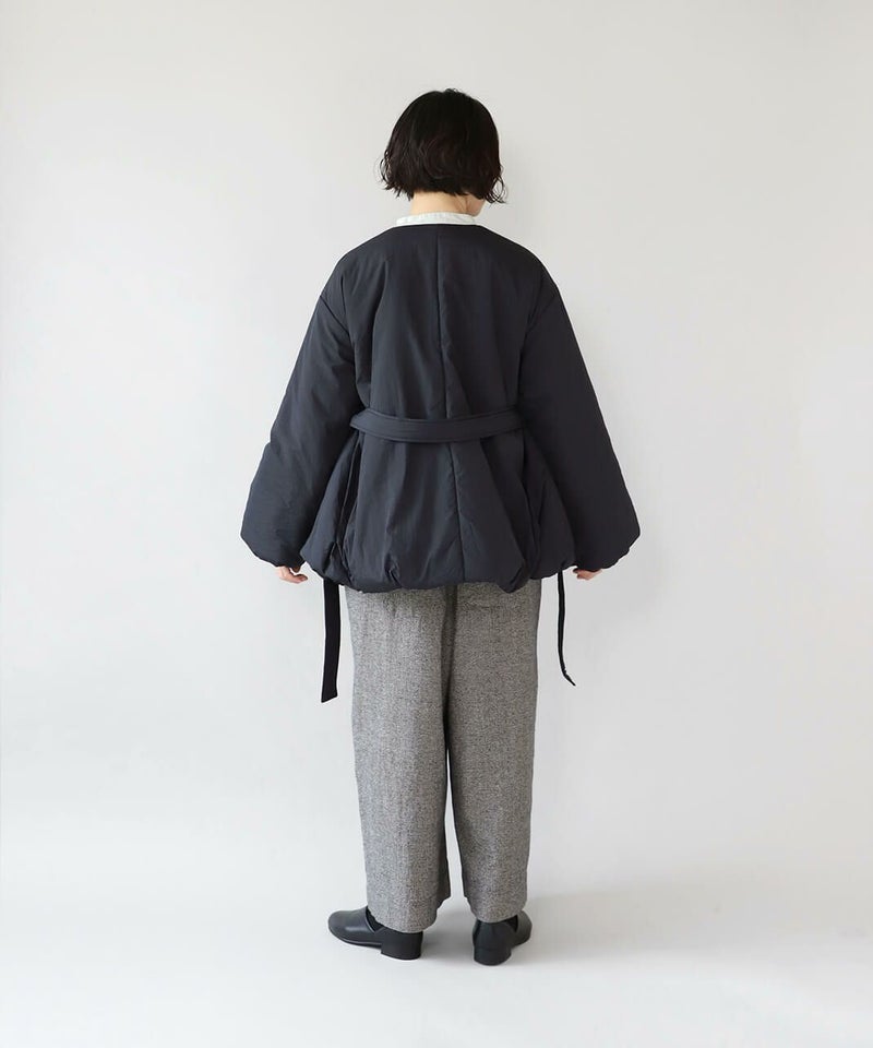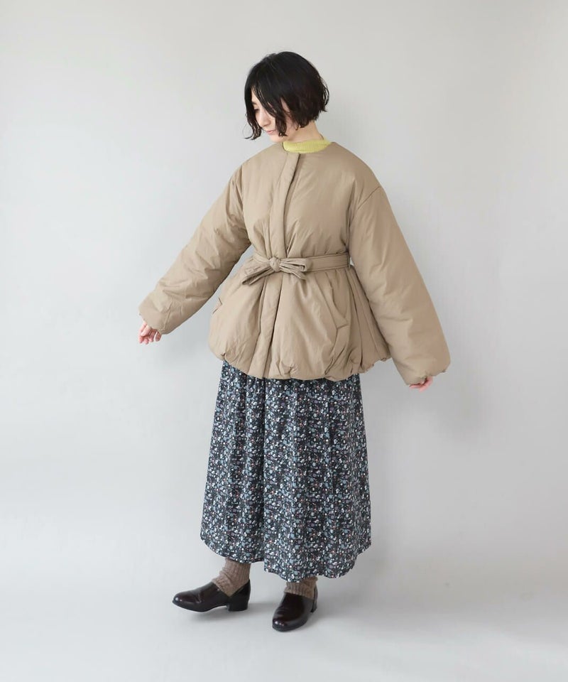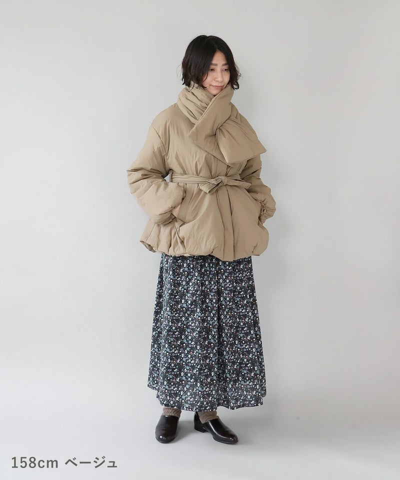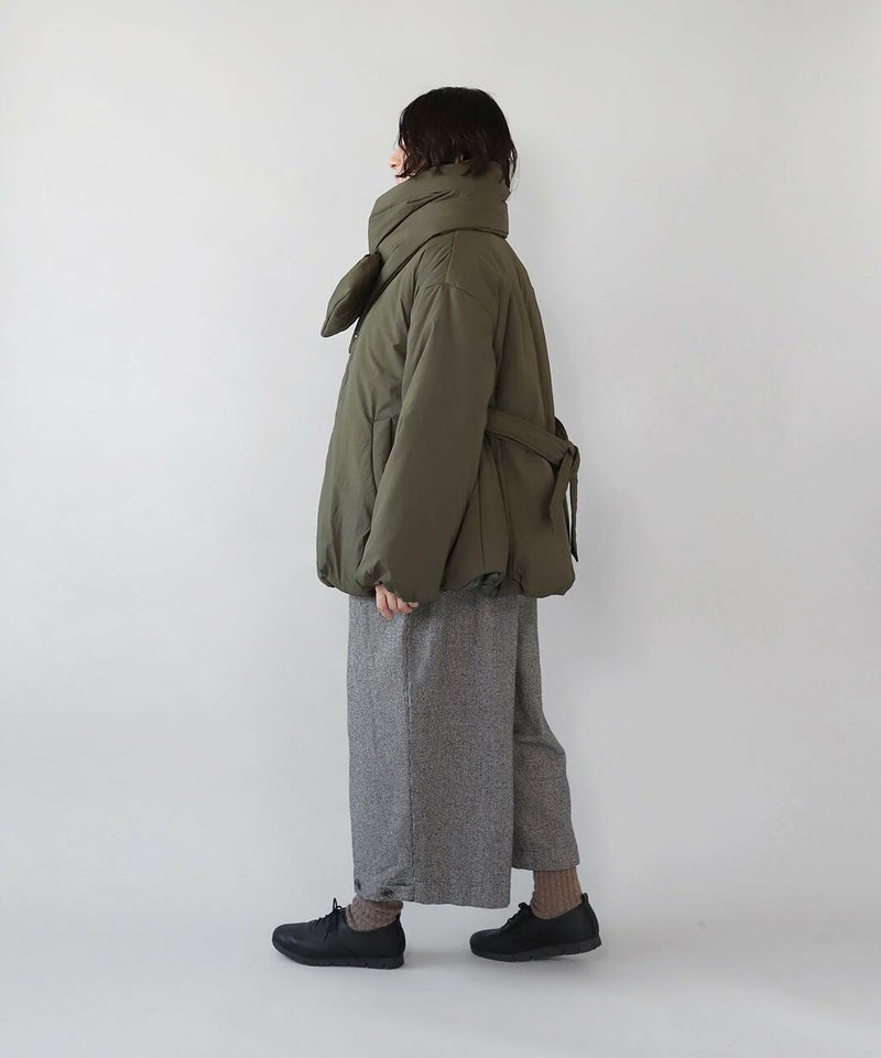 摩擦や摩耗に強く耐久性があり、シワも気になりにくいナイロンを使用した中綿コートです。 ノーカラーに裾ドロップショルダーでゆったりとした着心地。フロントは比翼仕立てですっきりと、裾に向けてふんわり広がるバルーンシルエットに。 中綿入りでボリューム感がありながら、とても軽くストレスなく着用可能。付属の取り外しの出来る薄中綿入りのマフラー付きで首元もあたたかく過ごせます。またベルトでウエストを絞れば、また違うシルエットを楽しめます。