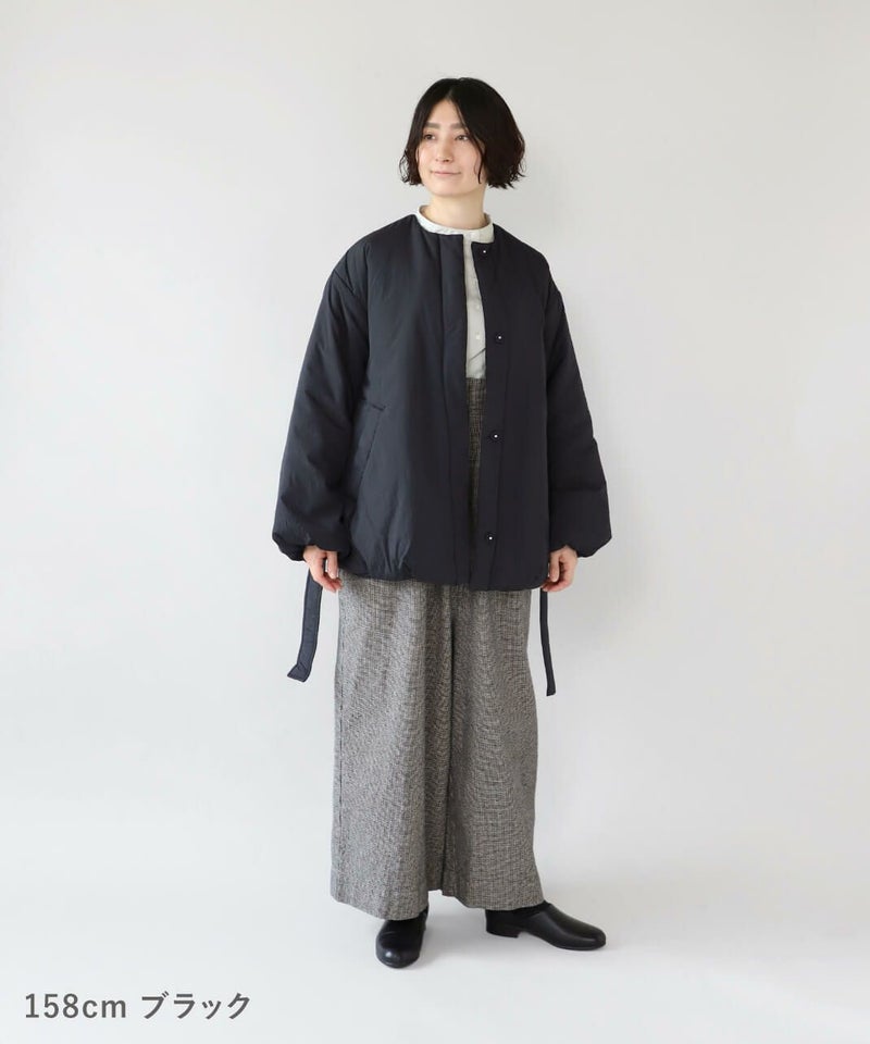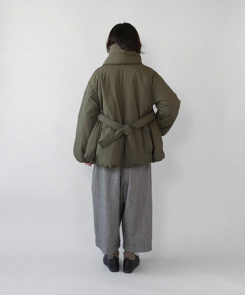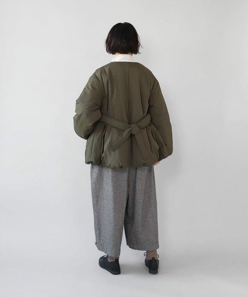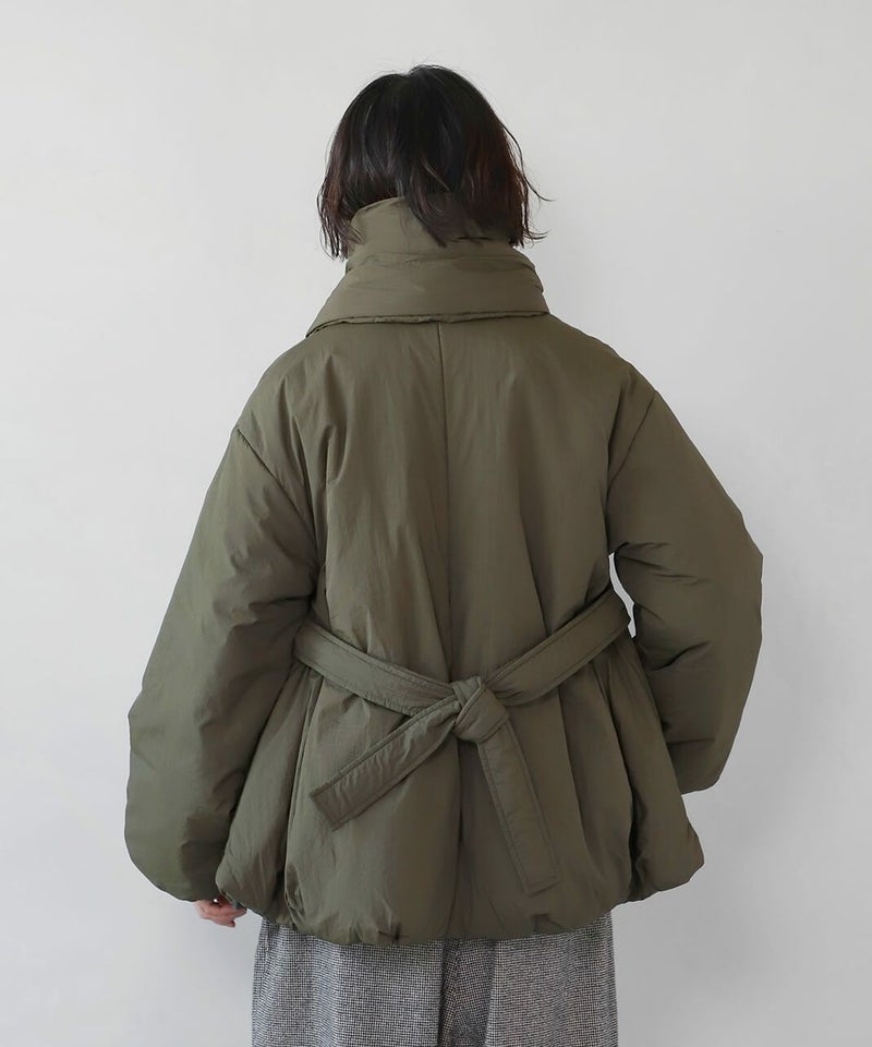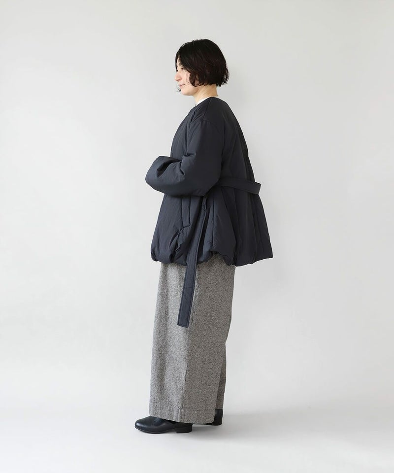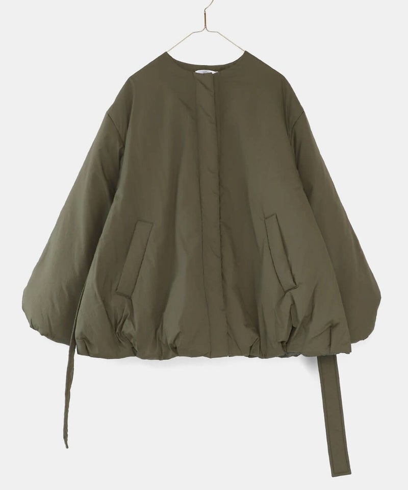 摩擦や摩耗に強く耐久性があり、シワも気になりにくいナイロンを使用した中綿コートです。 ノーカラーに裾ドロップショルダーでゆったりとした着心地。フロントは比翼仕立てですっきりと、裾に向けてふんわり広がるバルーンシルエットに。 中綿入りでボリューム感がありながら、とても軽くストレスなく着用可能。付属の取り外しの出来る薄中綿入りのマフラー付きで首元もあたたかく過ごせます。またベルトでウエストを絞れば、また違うシルエットを楽しめます。