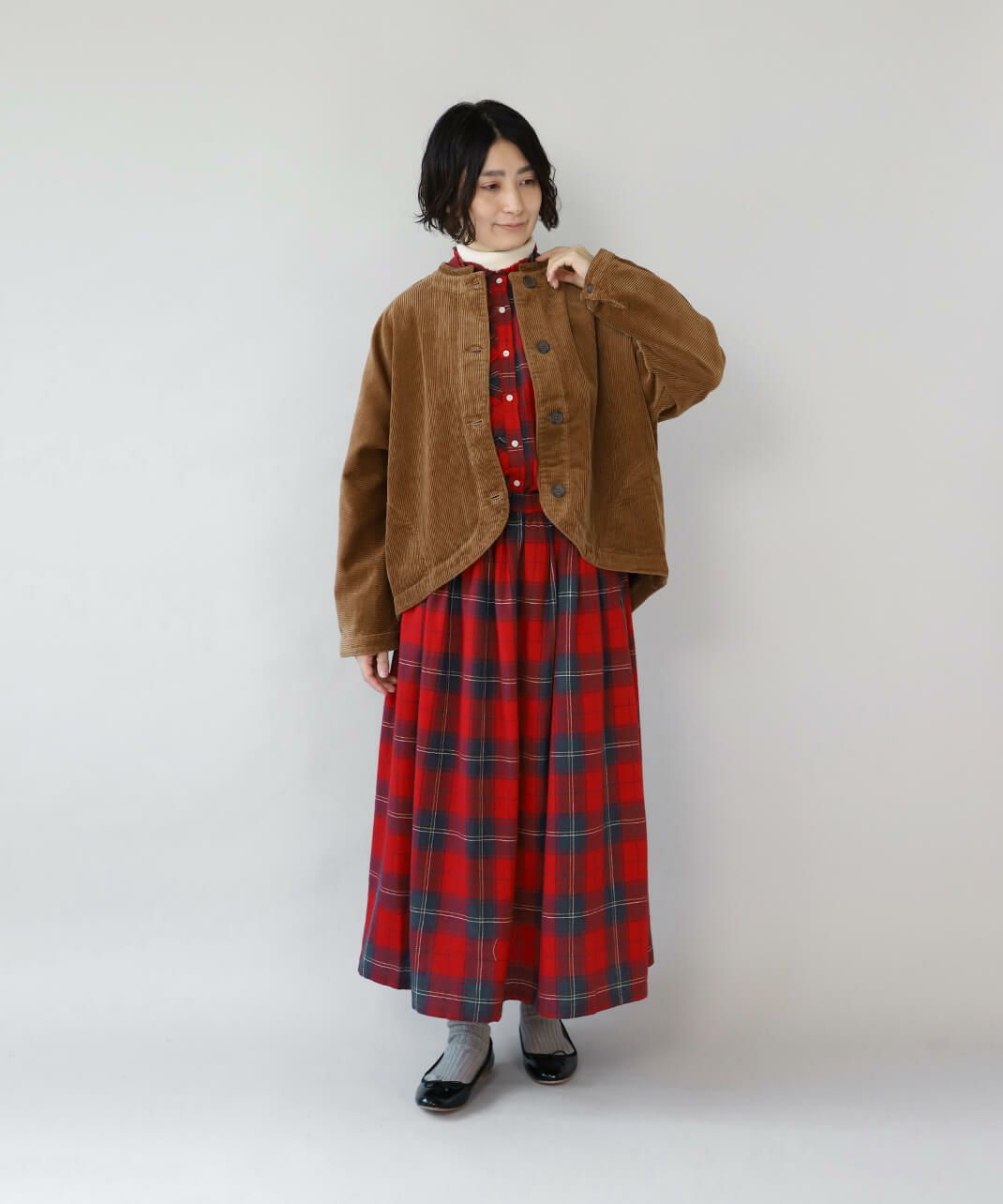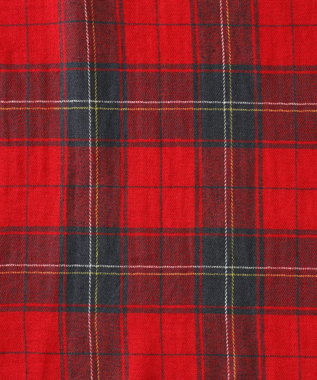 目を惹く大きめのチェック柄がコーディネートのアクセントになります。