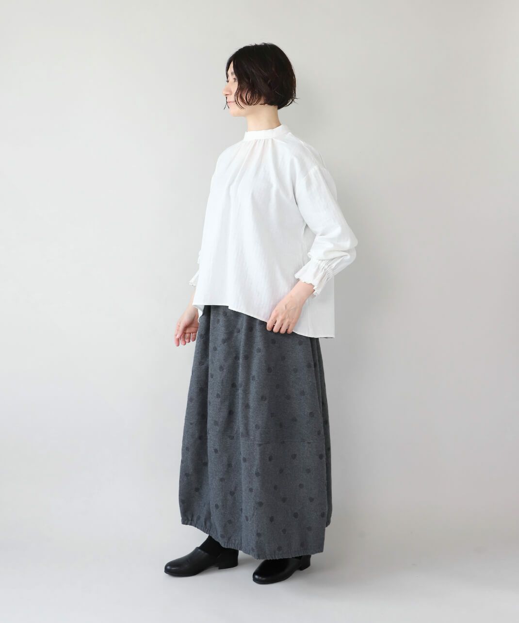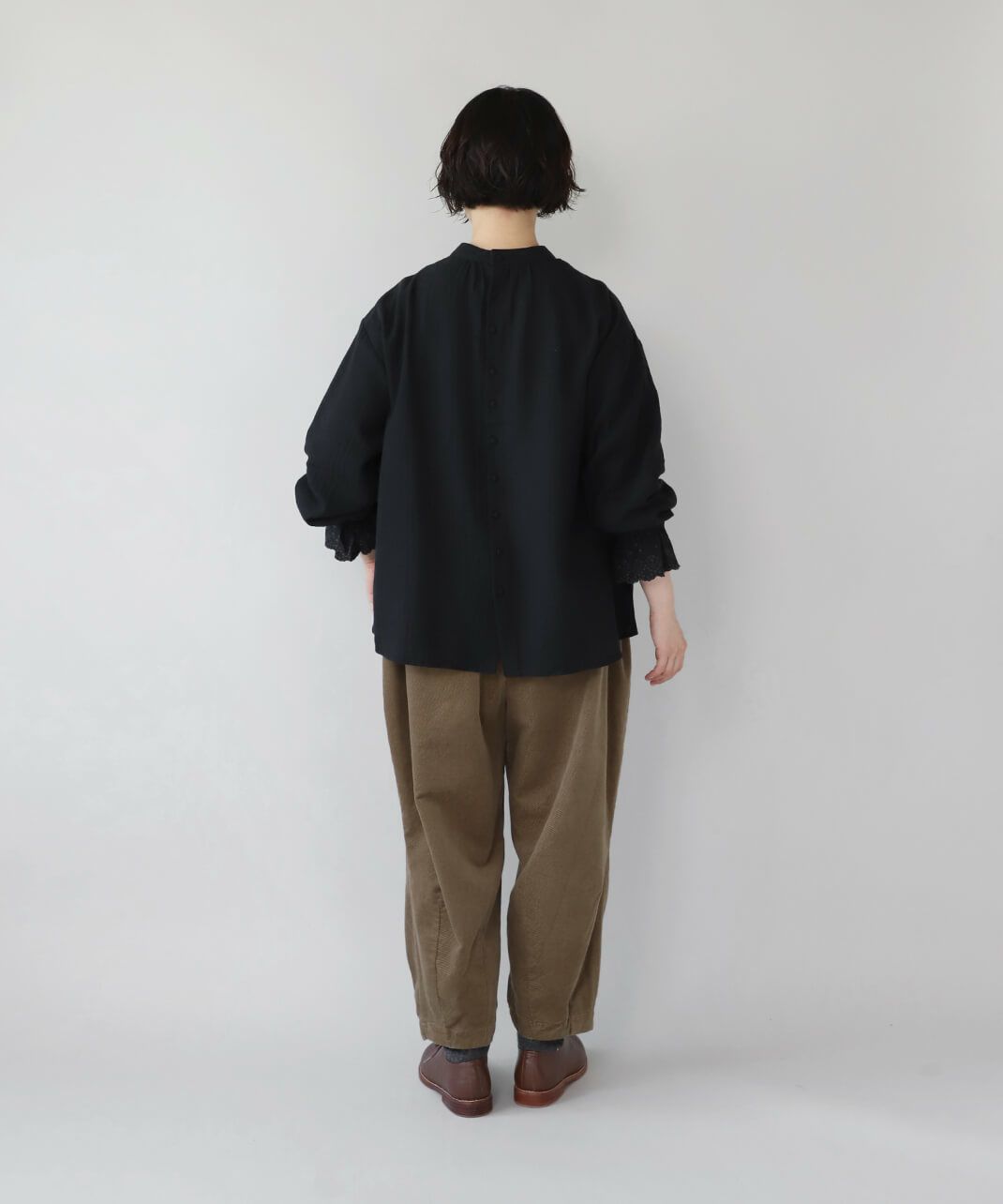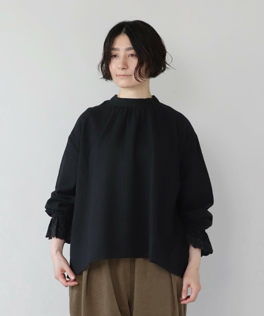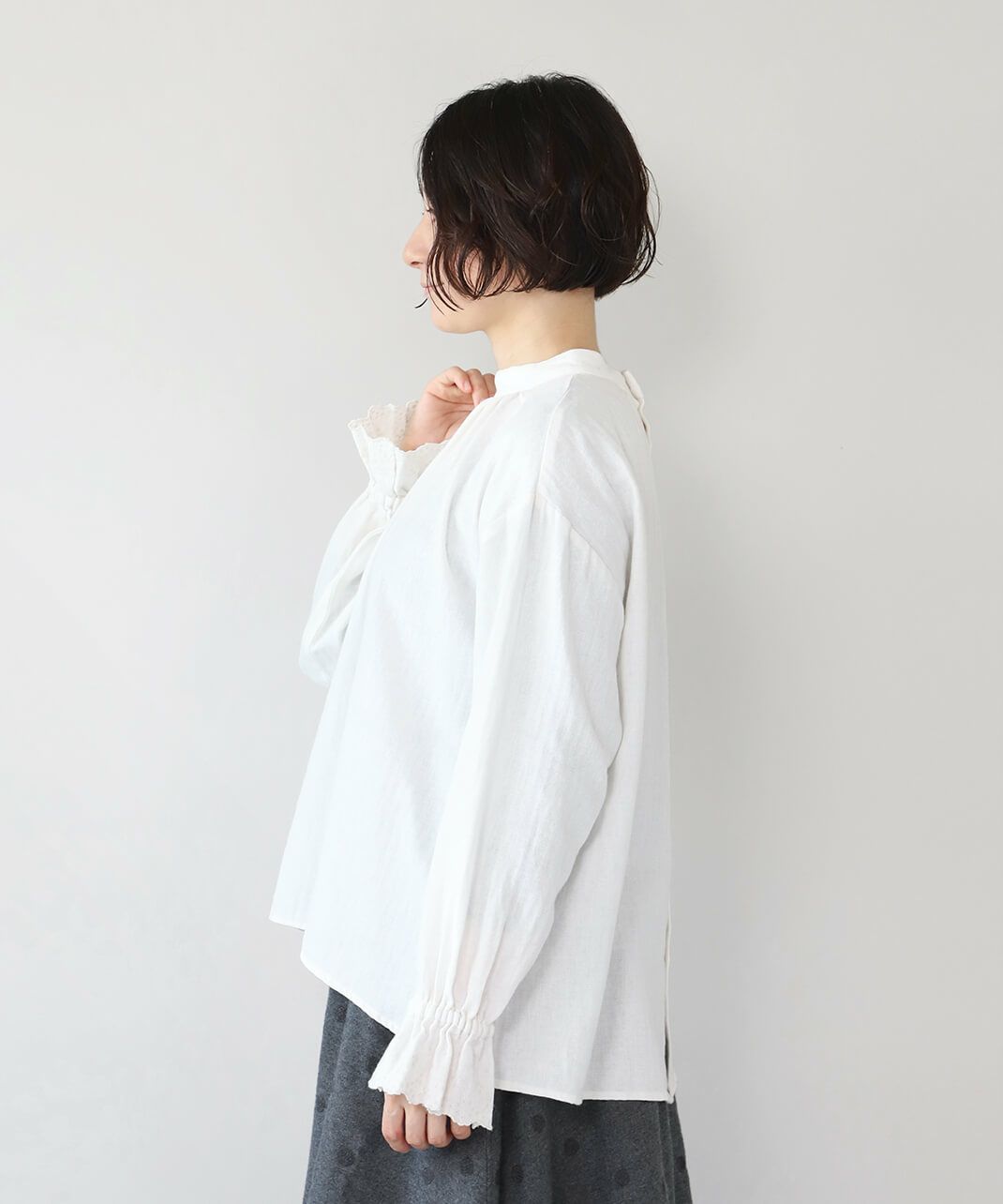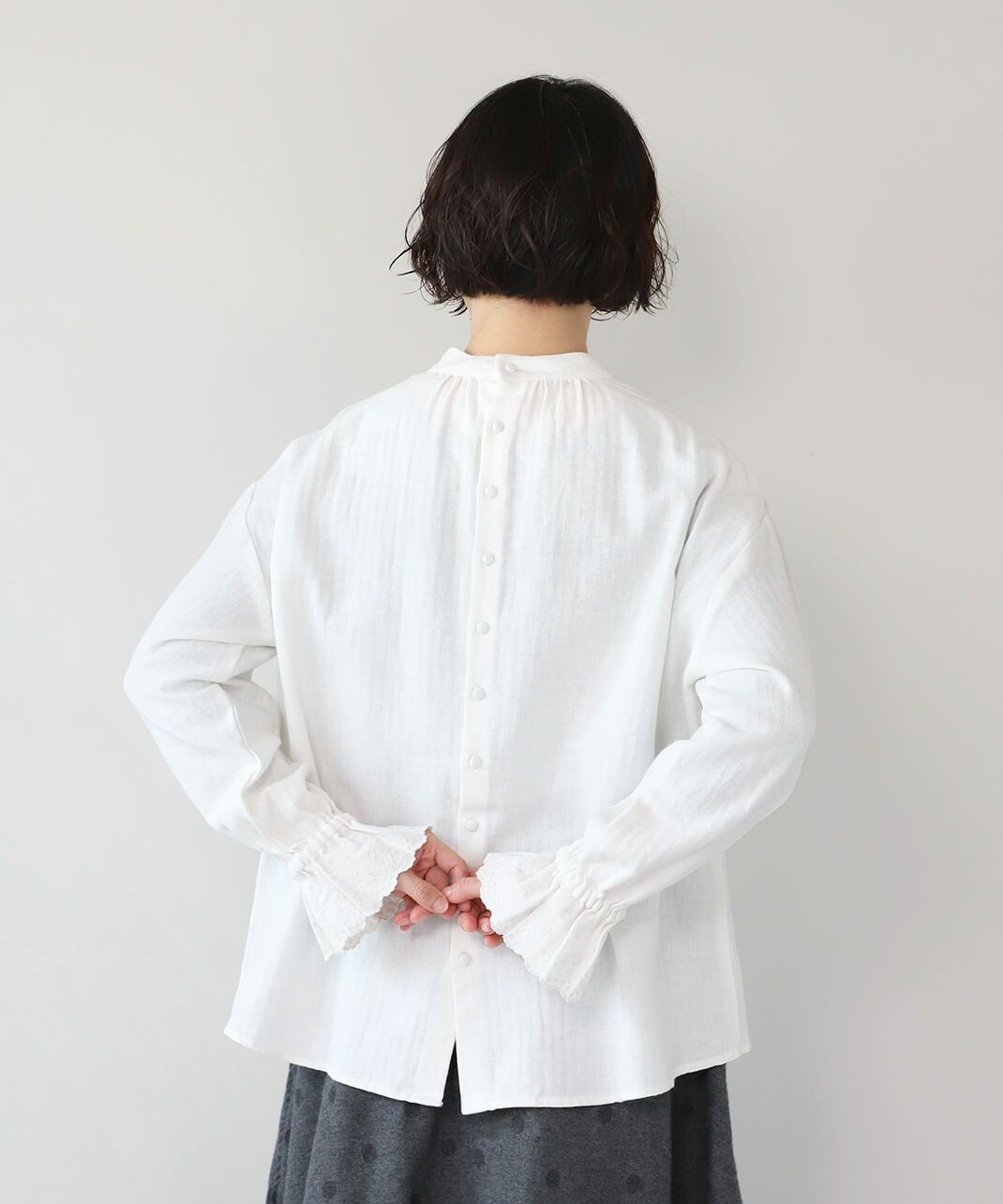 肌触りの良いコットンリネンをヘリンボーンに仕上げたブラウスです。 低めのハイネックとギャザーがつくるシンプルでスタイリッシュな印象に。袖口の刺繍レースとキャンディースリーブで甘くナチュラルな雰囲気がプラス。背中のくるみボタンも可愛らしさが加わります。袖口にはゴムが入っているので、袖の見え方も楽しめます。甘い雰囲気が苦手な方でもシンプルに取り入れやすい1枚です。