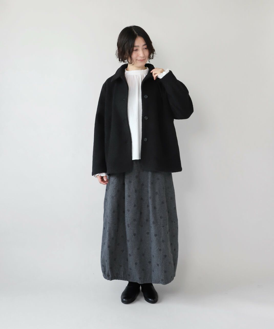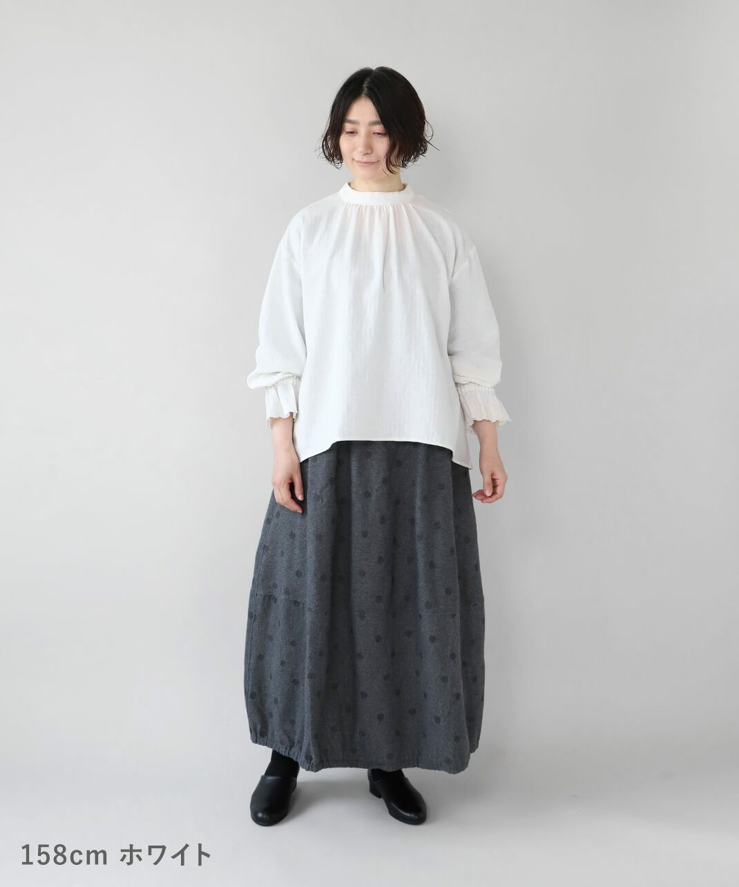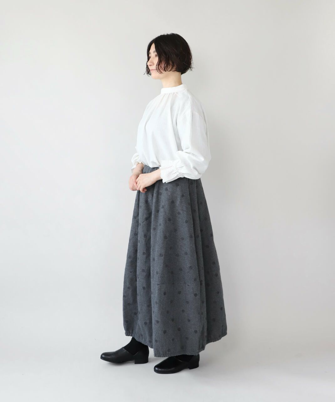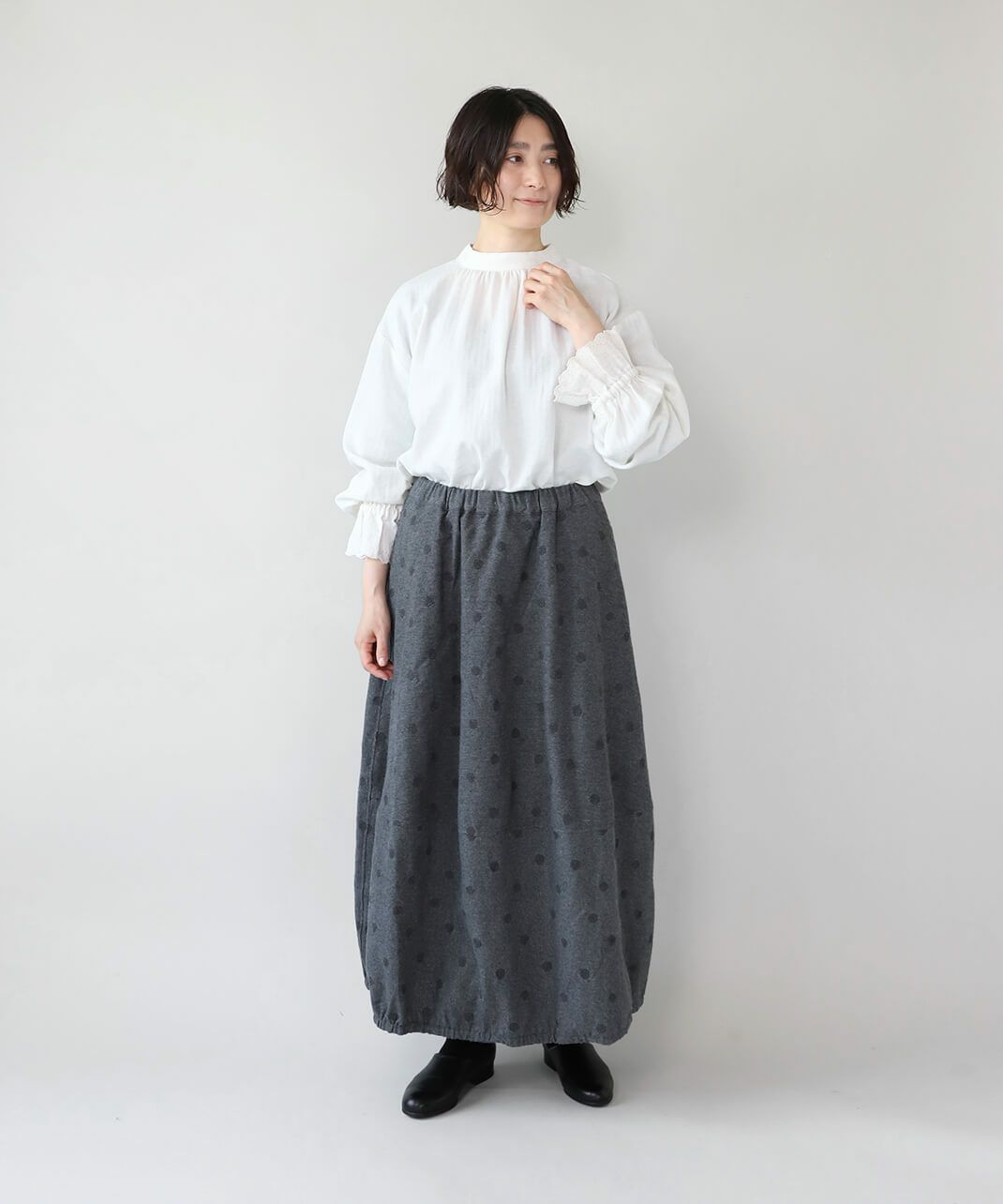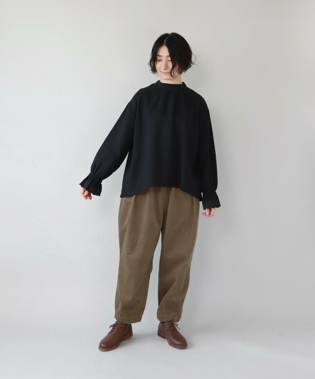 肌触りの良いコットンリネンをヘリンボーンに仕上げたブラウスです。 低めのハイネックとギャザーがつくるシンプルでスタイリッシュな印象に。袖口の刺繍レースとキャンディースリーブで甘くナチュラルな雰囲気がプラス。背中のくるみボタンも可愛らしさが加わります。袖口にはゴムが入っているので、袖の見え方も楽しめます。甘い雰囲気が苦手な方でもシンプルに取り入れやすい1枚です。