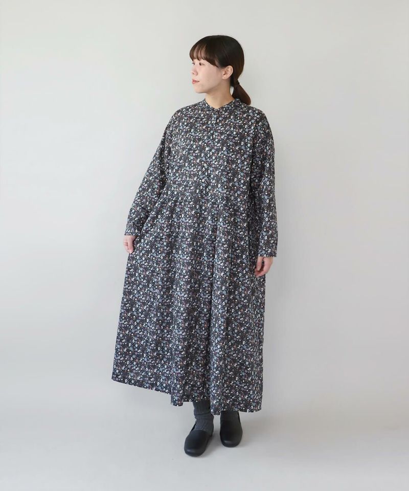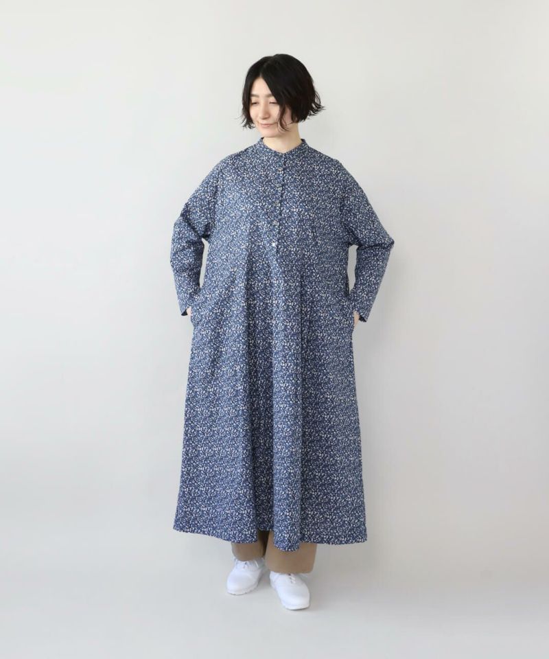 さらりとした薄手のコットンローン生地を使用した花柄のワンピースです。 シンプルなスタンドネックにウエストのタック切替えがやわらかくな曲線を描くシルエット。細やかなフラワープリントが上品でフェミニンな印象を演出してくれます。ウエストまでのフロントボタンはアクセントになります。袖口はスリットが入っているので、重ね着にもかさばらず着用できます。
