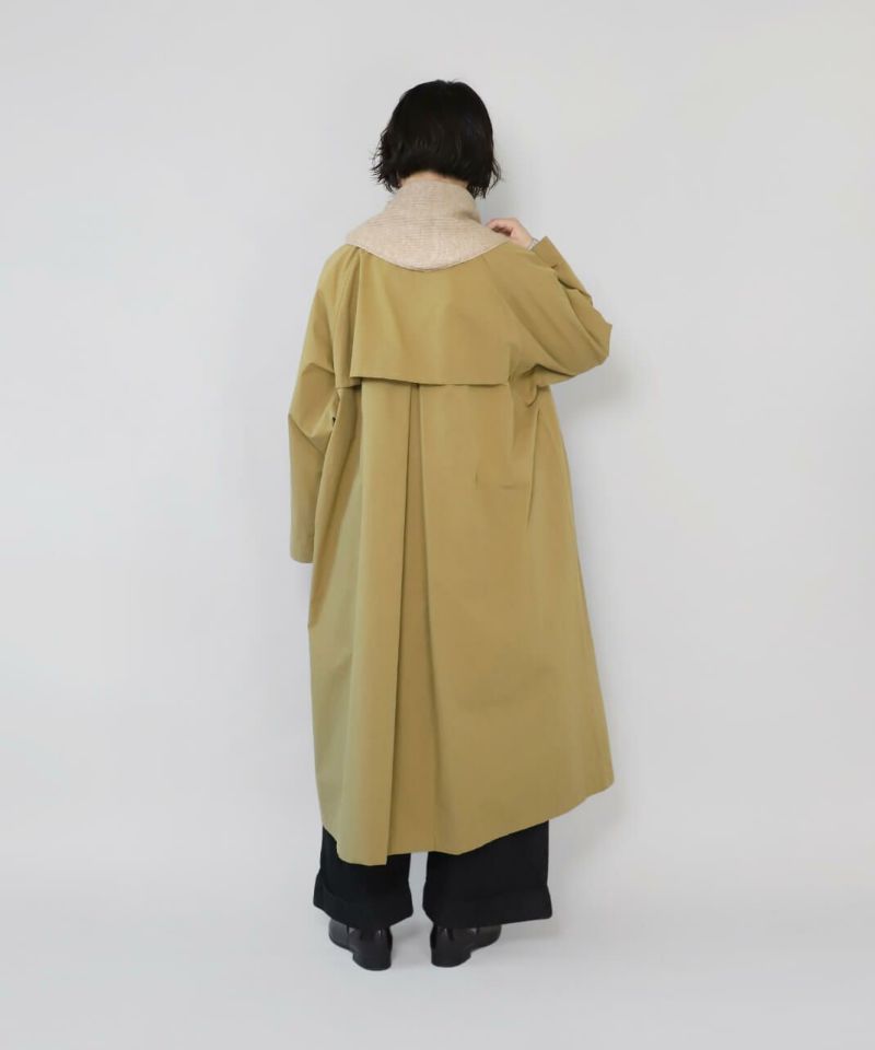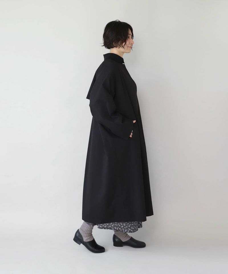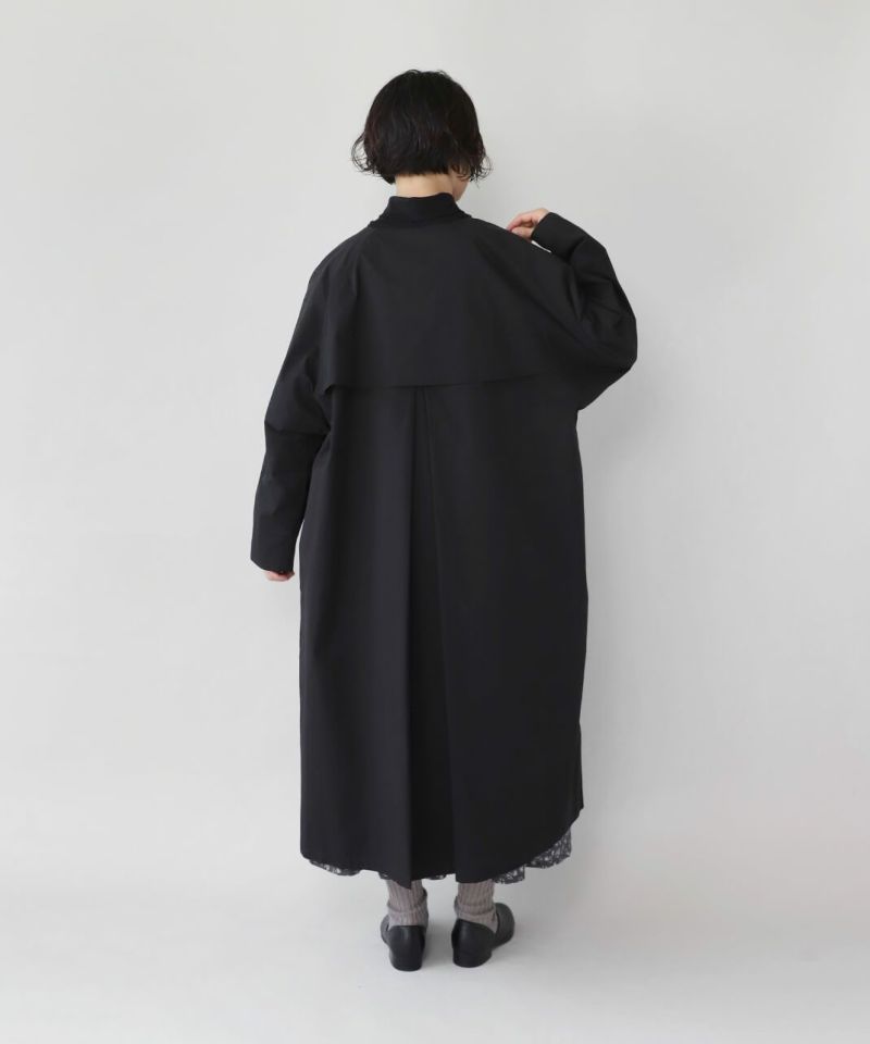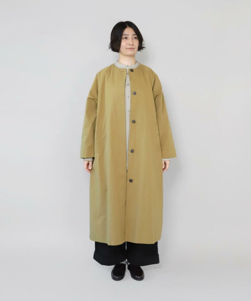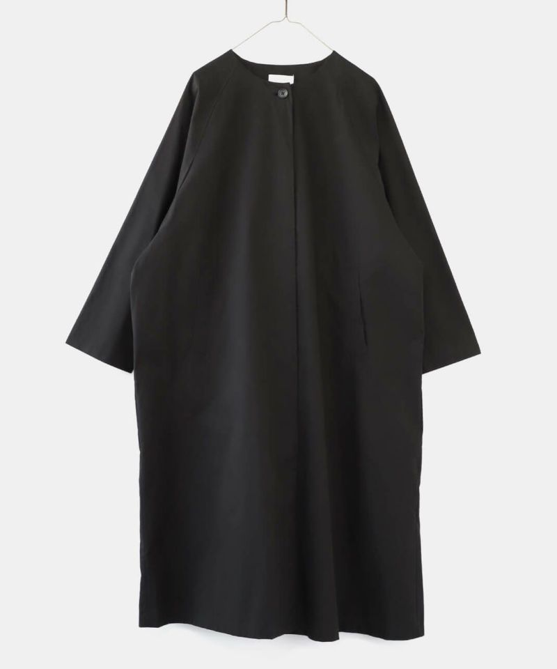 ハリがあり丈夫なコットンツイル生地を使用したアンブレラヨークのロングコートです。 すっきりとしたノーカラーにラグラン切替えでゆったりとした着心地。かさばるインナーも着込めるサイズ感ながらすっきり落ちるシルエットが嬉しいポイント。アンブレラヨークがアクセントになり後ろ姿がおしゃれな印象に。キレイめからカジュアルまで幅広いスタイリングに合わせやすく、1枚あると重宝します。